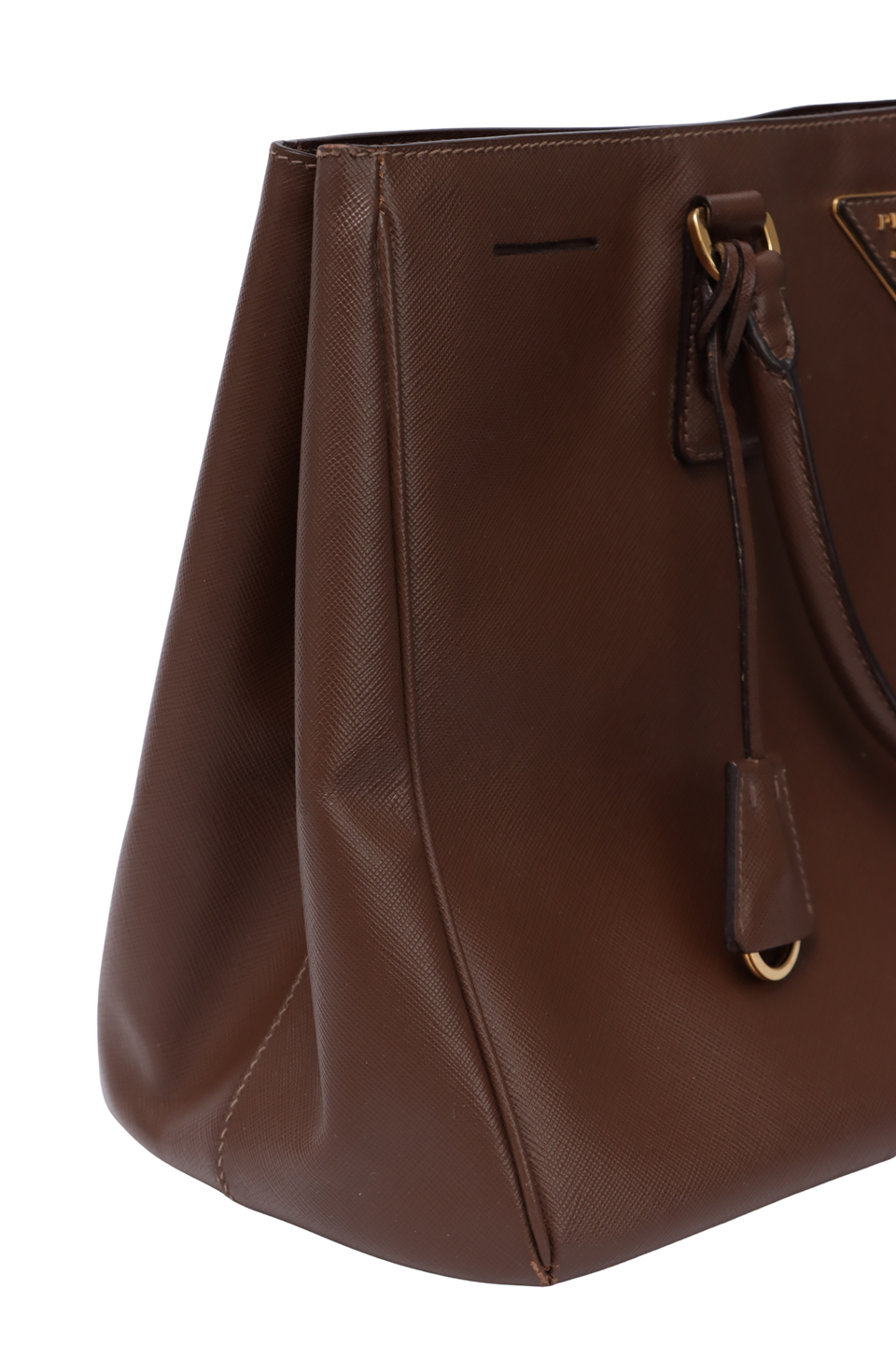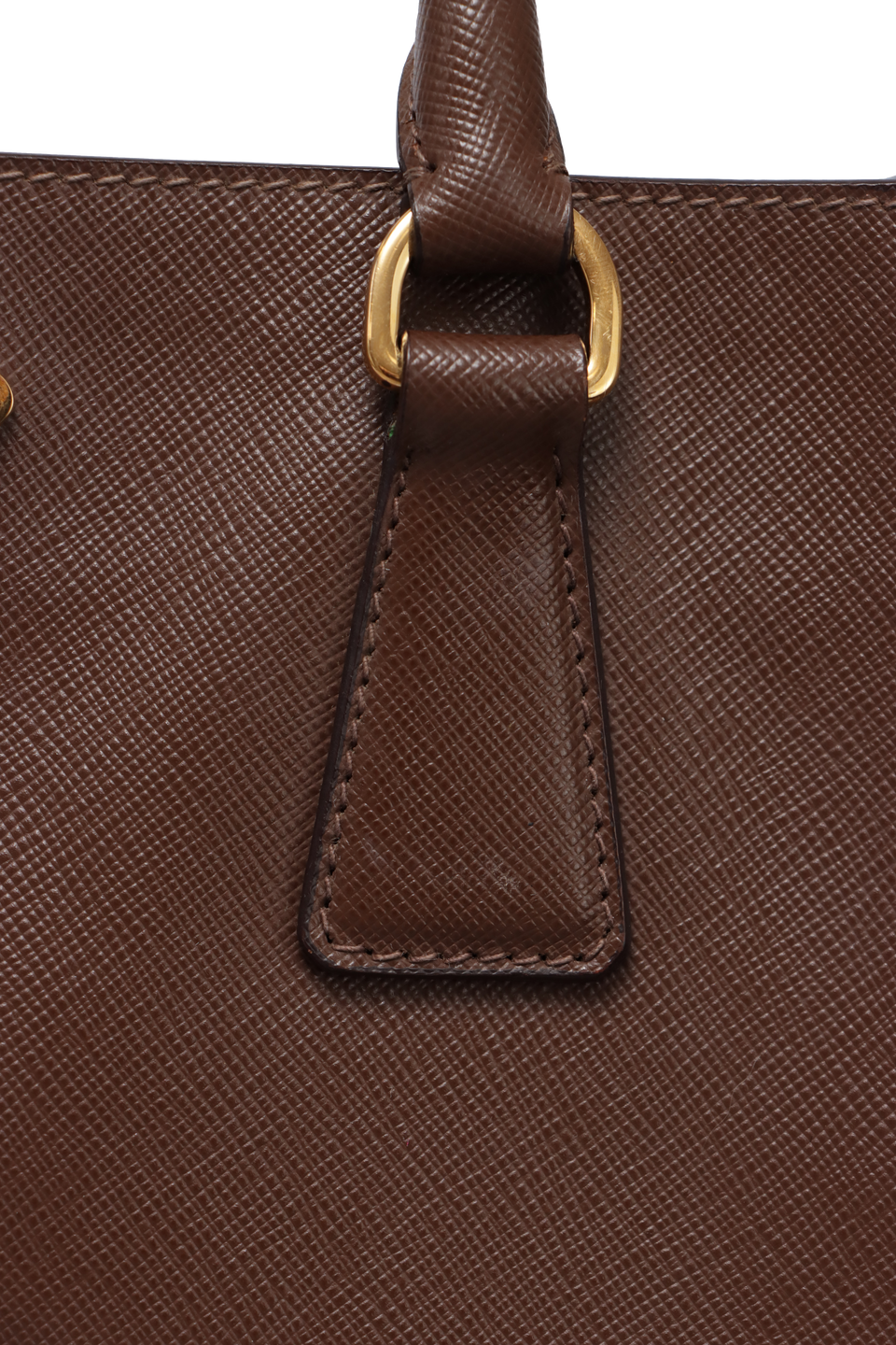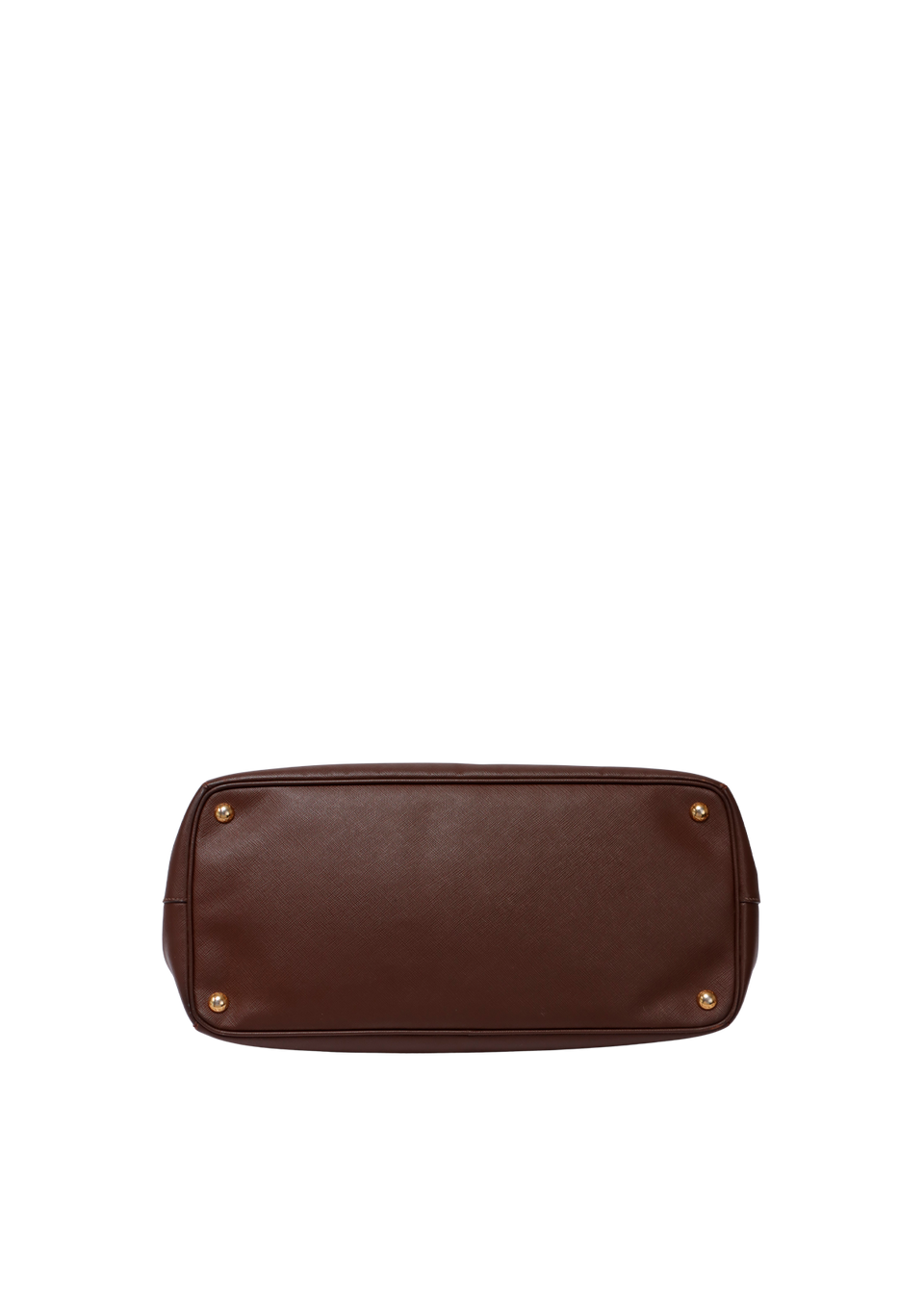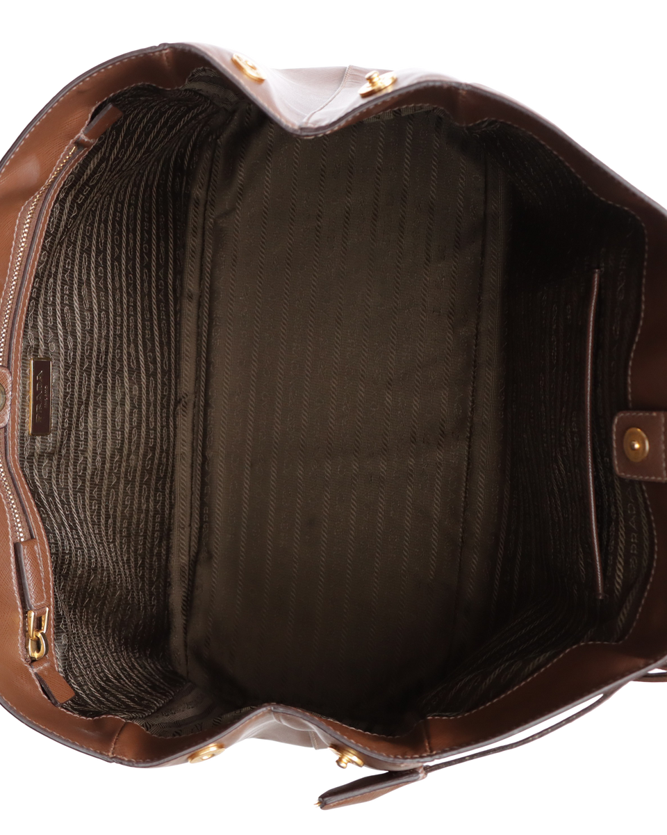Regular. Apresenta severa deformação na estrutura da peça, especialmente na lateral esquerda, notáveis manchas esbranquiçadas pelo couro, especialmente na parte superior do lado direito e na parte superior interna, consideráveis nos cantos da base, severas fissuras, marcas de uso e desgastes pelas selagens, especialmente das alças e da tag de couro, leves marcas de uso e descolorações pelas ferragens.