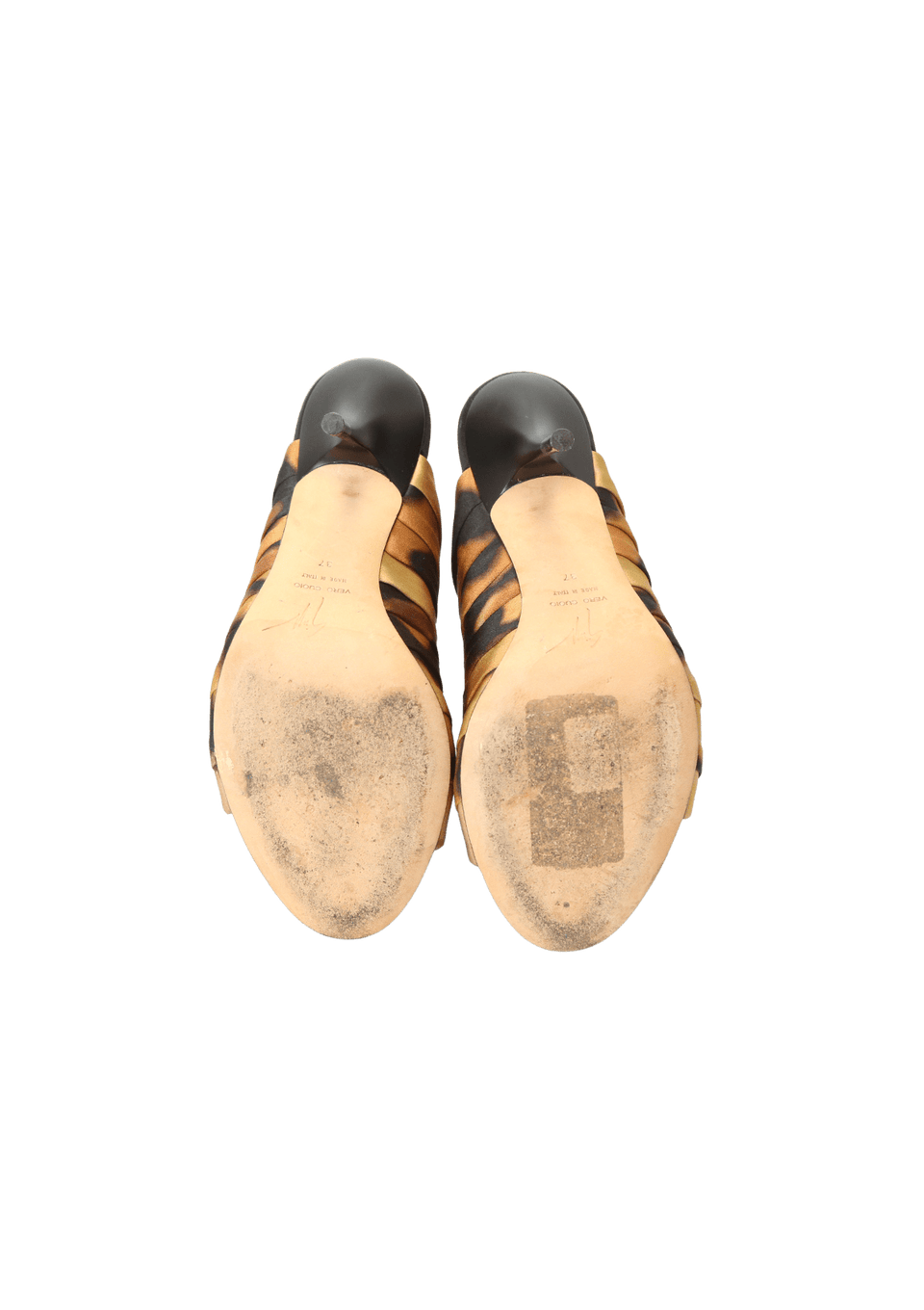 Condição: Bom, com aparência de usado. Apresenta desgastes nas solas, marcas de uso nos saltos, palmilhas e na parte externa.