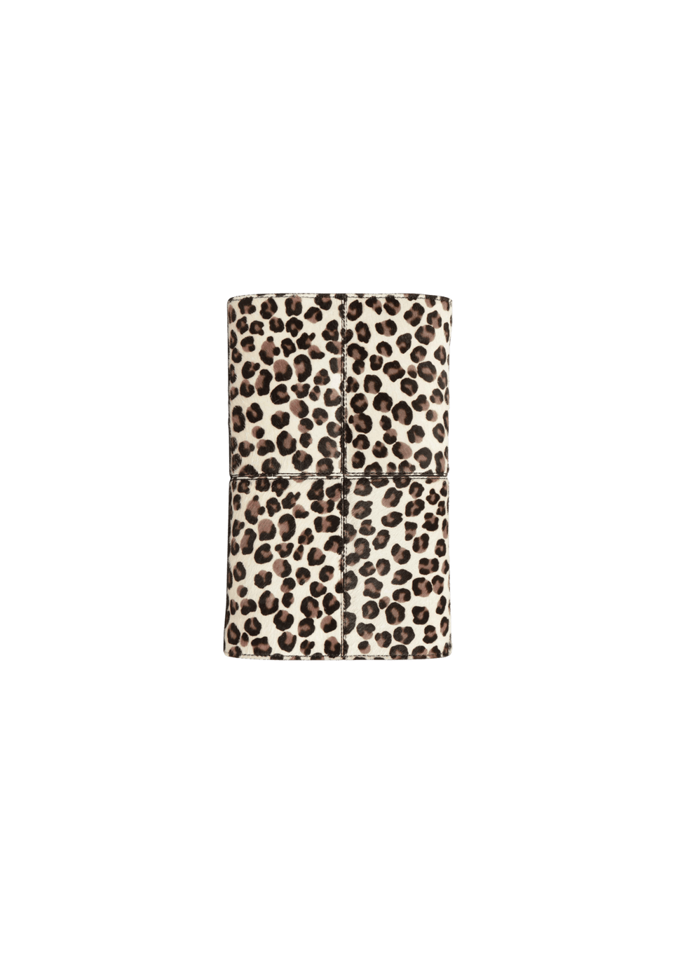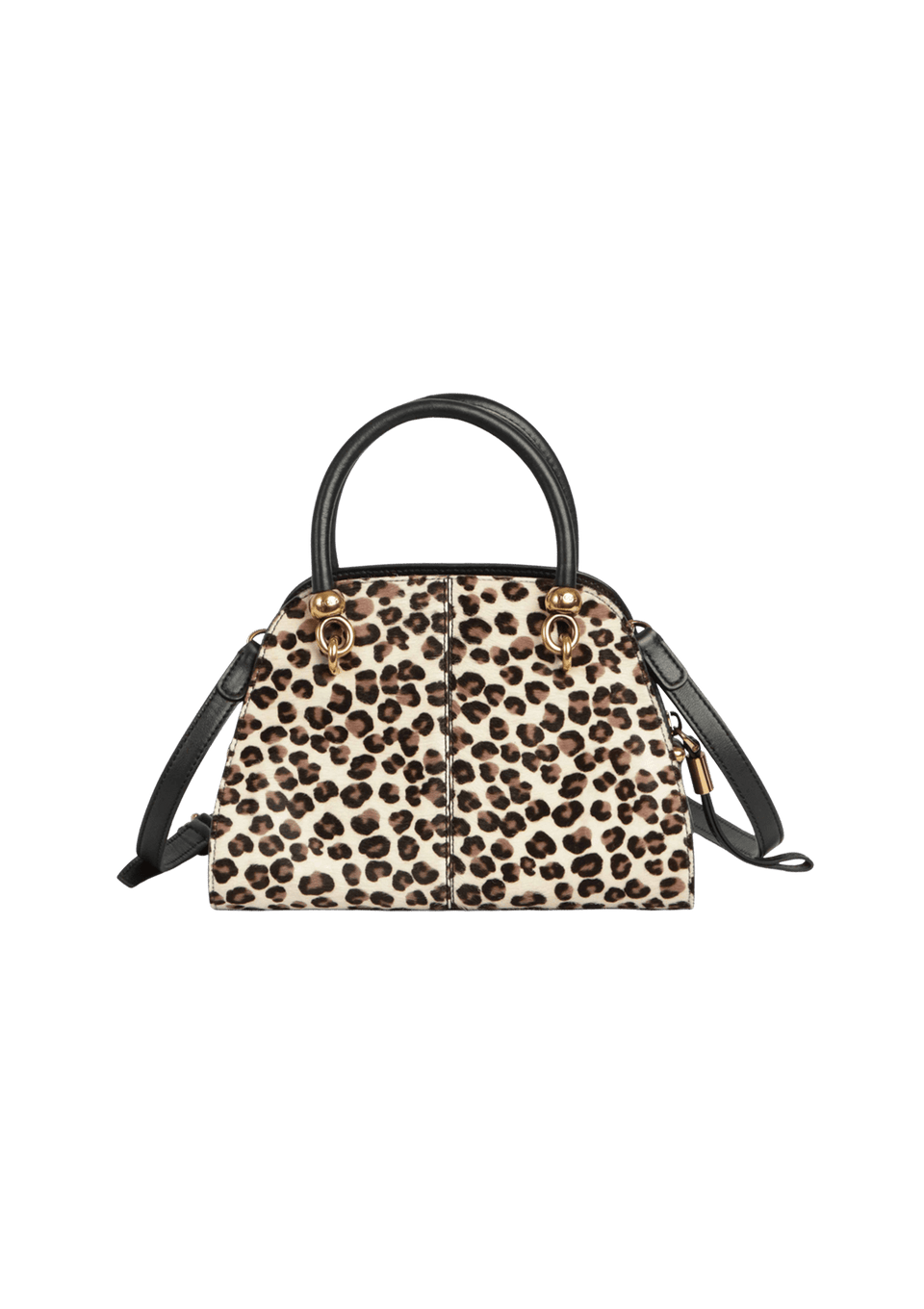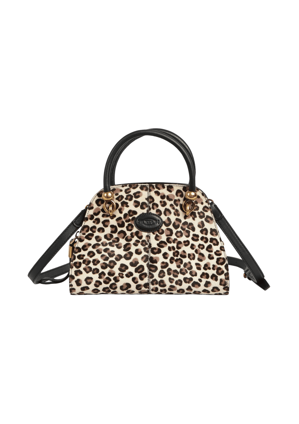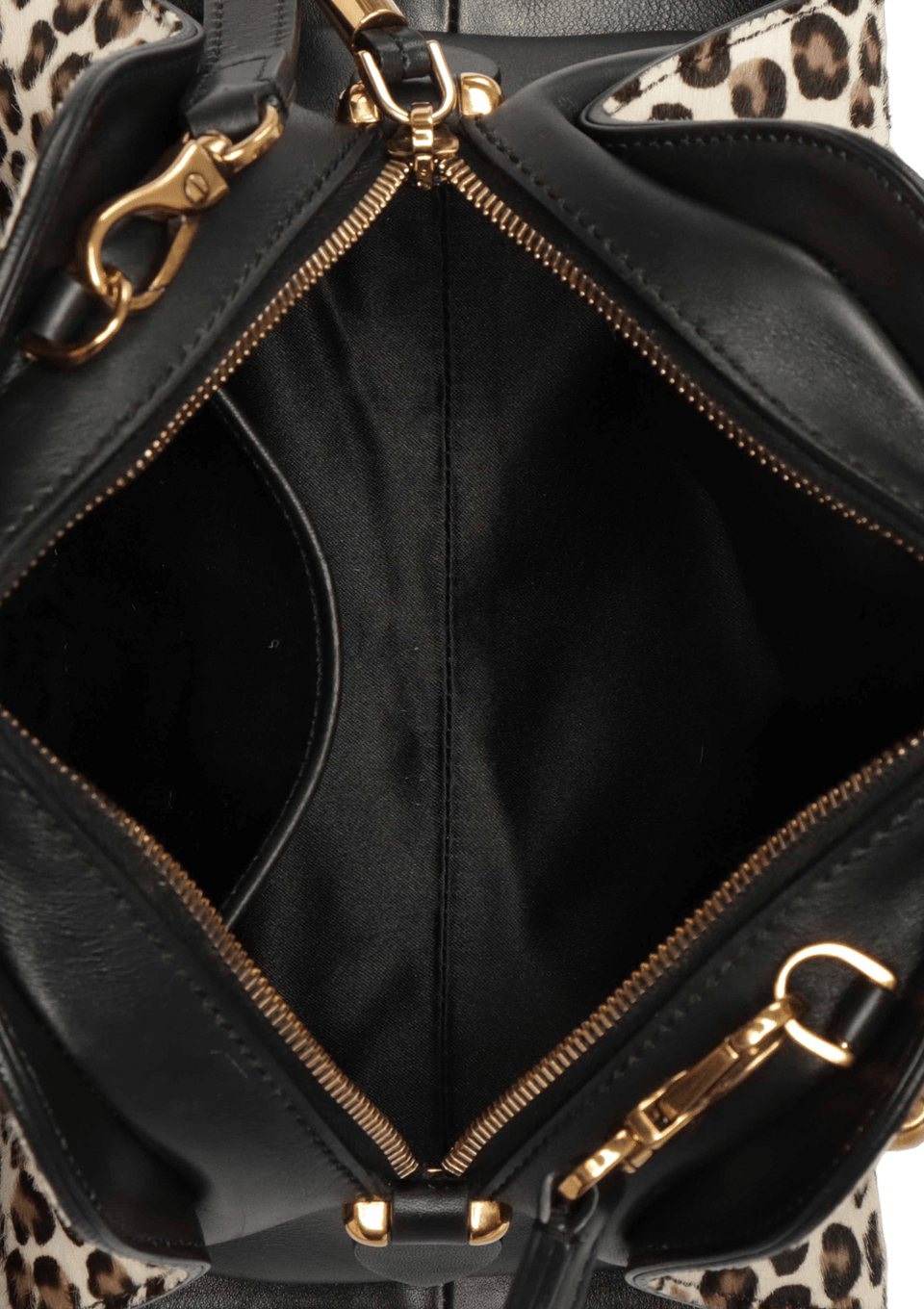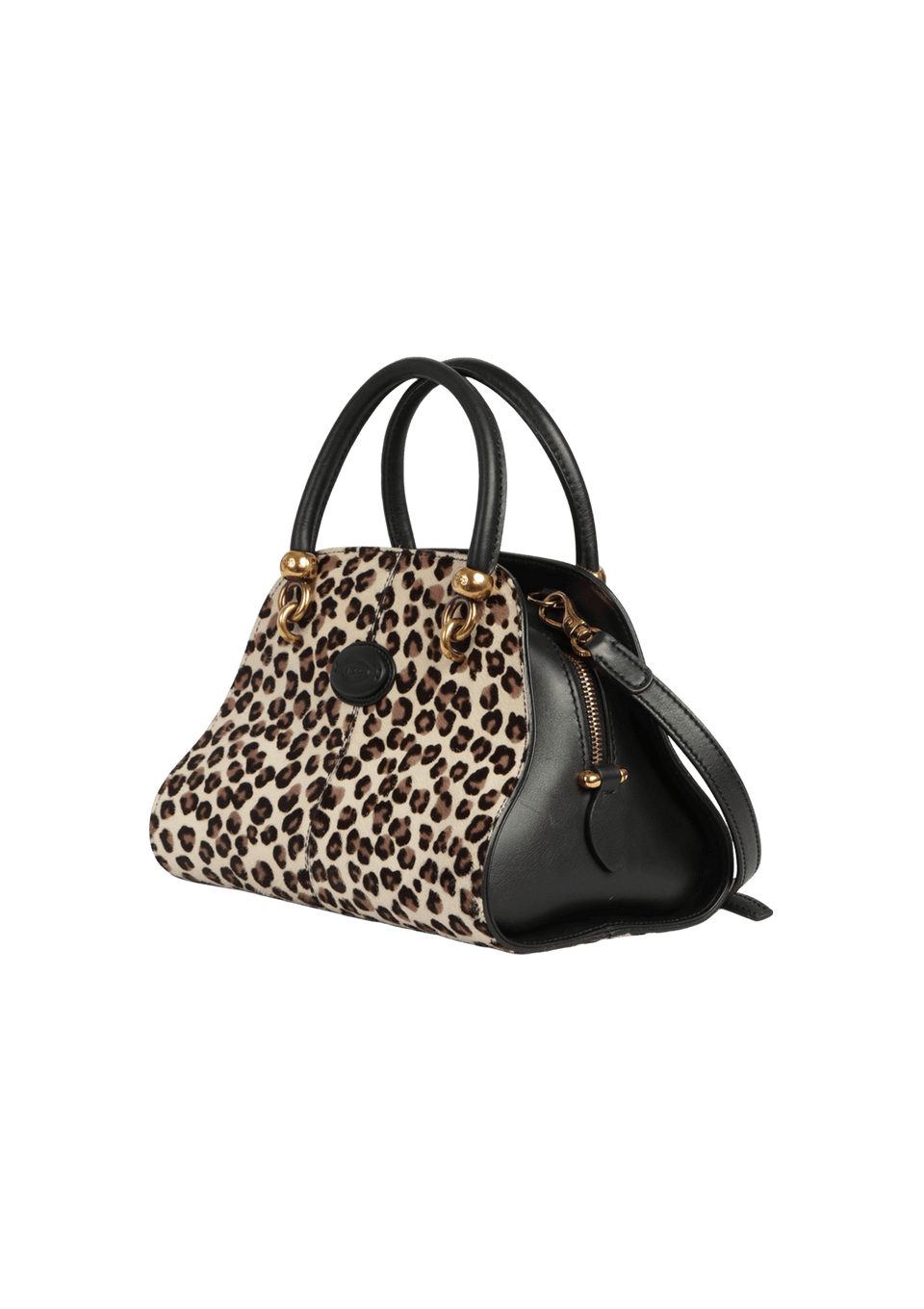 - Couro preto e pelugem com estampa de leopardo bege, preto e marrom;