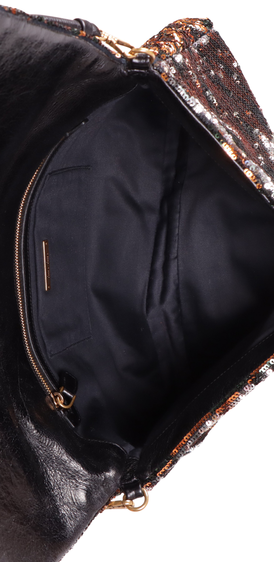 Descrição do Material: Tecido com lantejoulas pretas, laranjas e prateadas e detalhes em couro calfskin preto