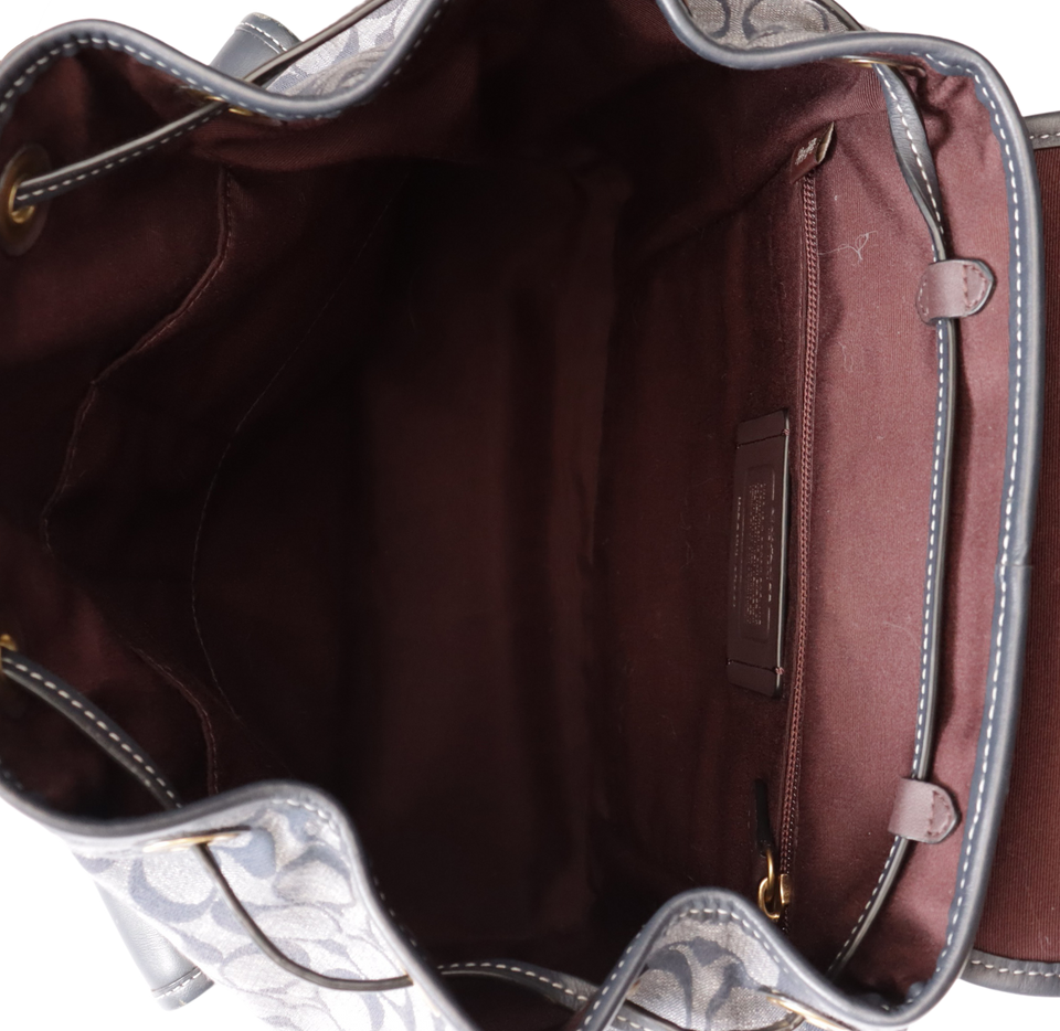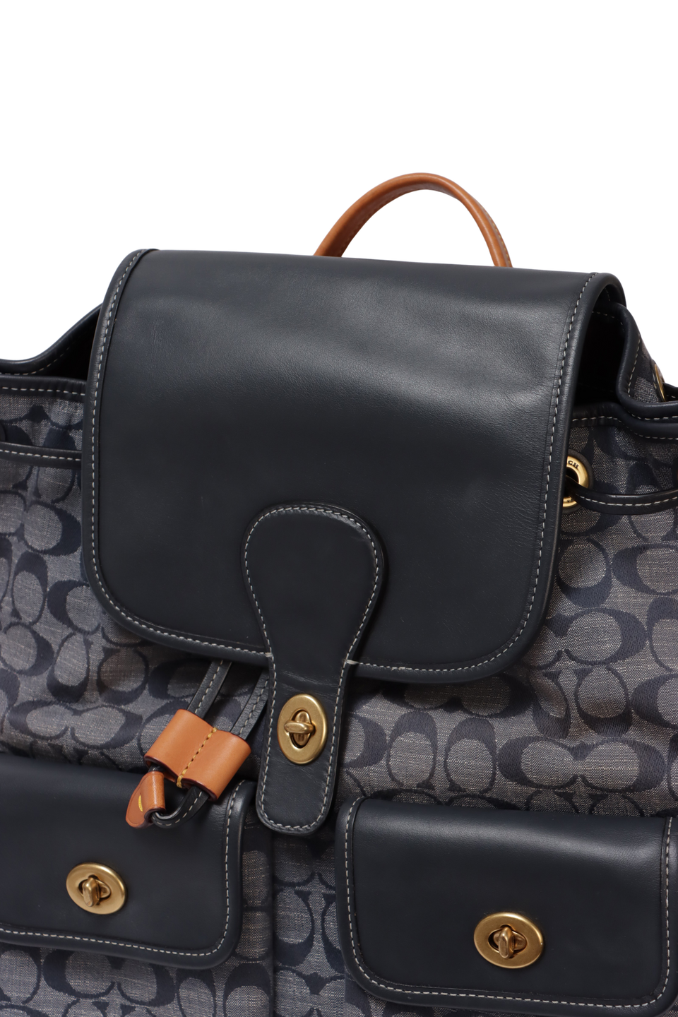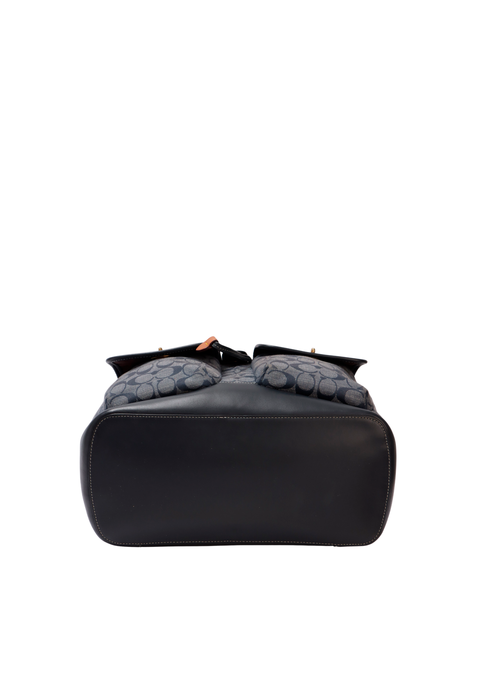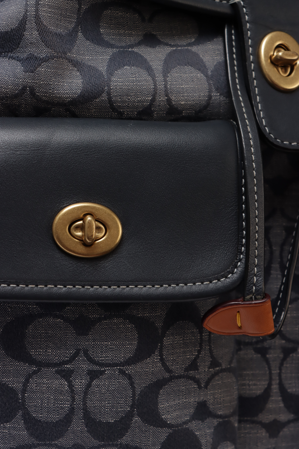 Bom, com aparência de usado. Apresenta leves marcas e manchas de uso nos detalhes em couro, principalmente na parte inferior frontal da aba, na parte inferior frontal, nos detalhes das alças e base, leve deformidade pela estrutura na parte central frontal, pequenas marcas de uso, descolorações e oxidações nas ferragens dos fechos e nos detalhes superiores, pequenas manchas de uso pelo canvas, especialmente na parte inferior frontal e mínimas manchas de uso na parte superior frontal do forro.