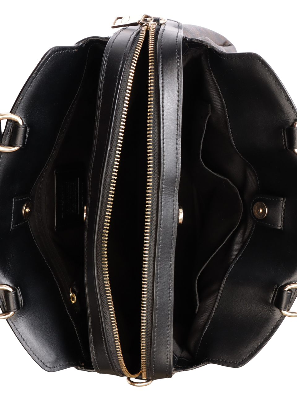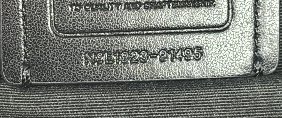 Bom, com aparência de usado. Apresenta leves desgastes e marcas de uso pelo canva, especialmente nos cantos da base e na parte frontal inferior do lado esquerdo, pequenos desgastes, marcas de uso e manchas esbranquiçadas pelo couro, principalmente nos acabamentos superiores e na base, leves fissuras e desgastes nas selagens, principalmente nos acabamentos superiores do compartimento frontal, pequenas marcas de uso nas ferragens, especialmente na logo e nos ganchos e leves desgastes, manchas esbranquiçadas e escurecidas no forro, principalmente no compartimento central.
