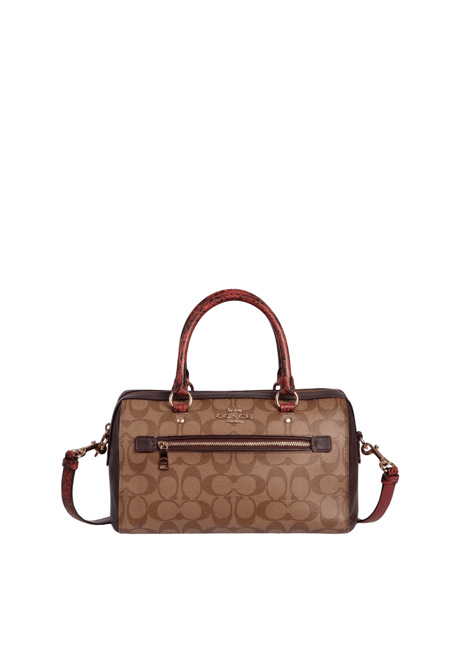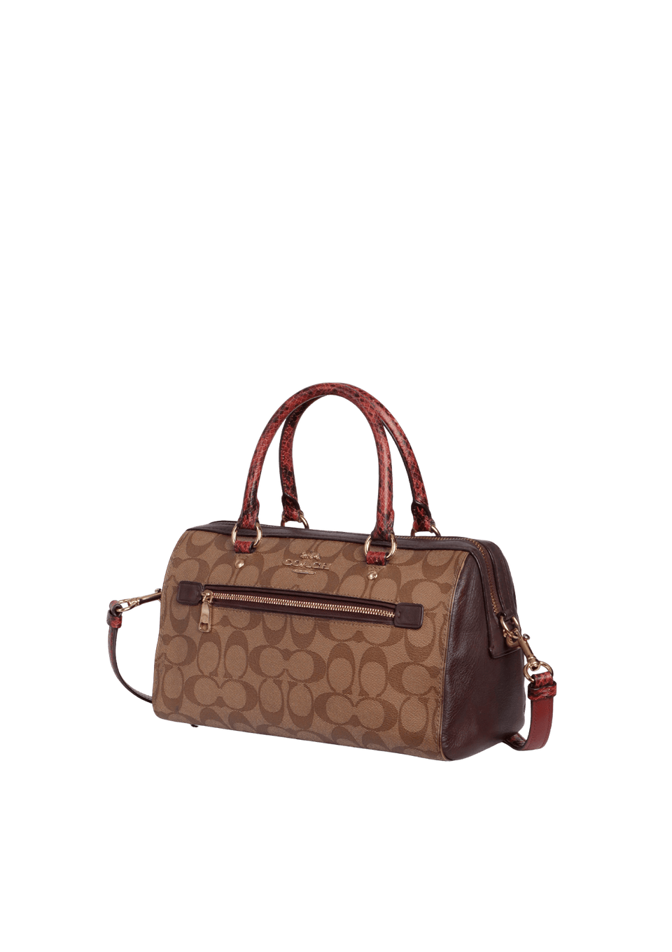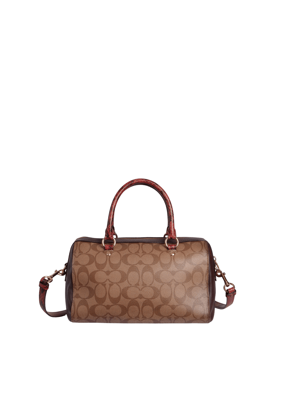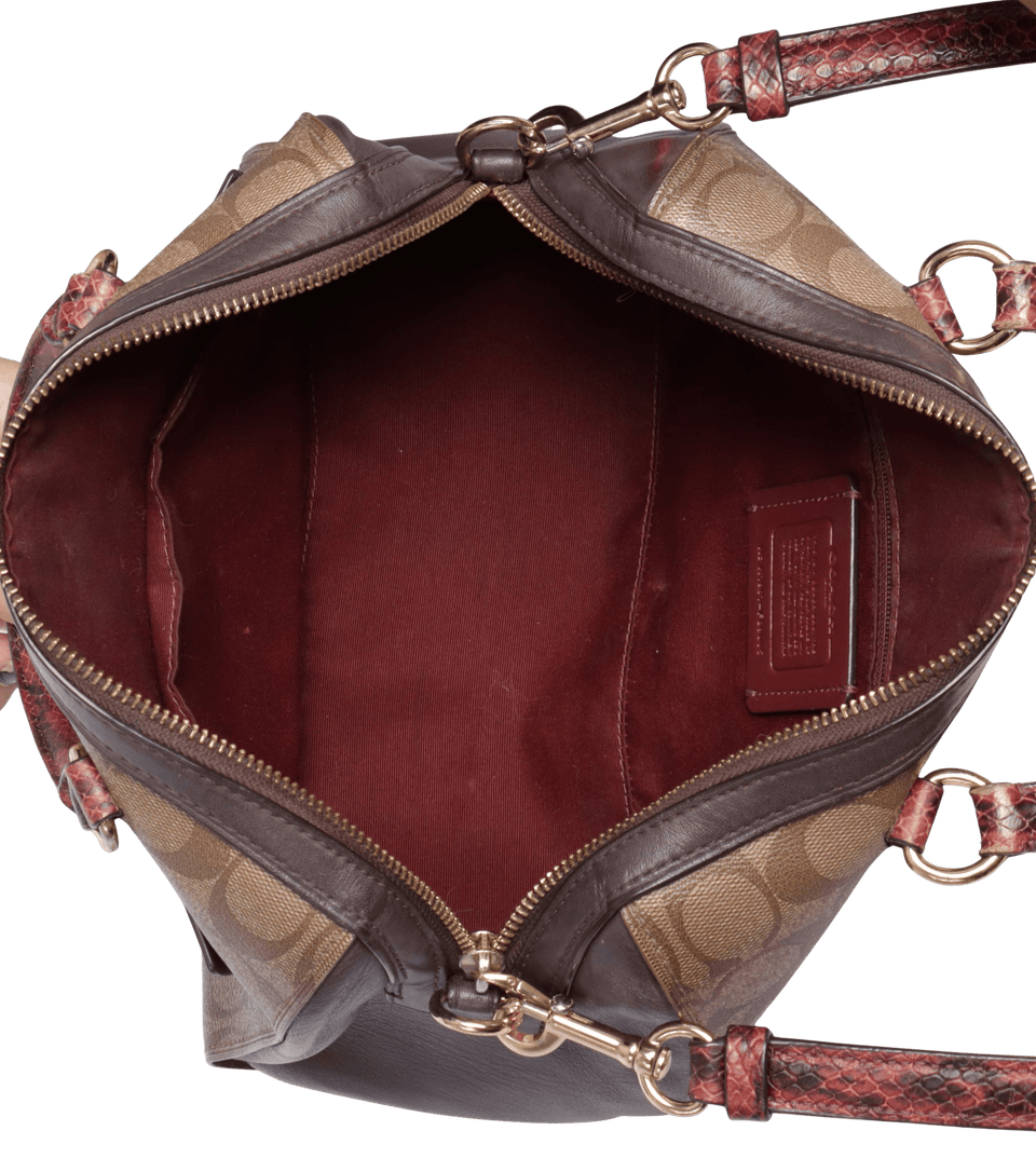 Descrição do Material: Canvas Signature marrom com detalhes em couro calfskin bordô e efeito de pele de cobra