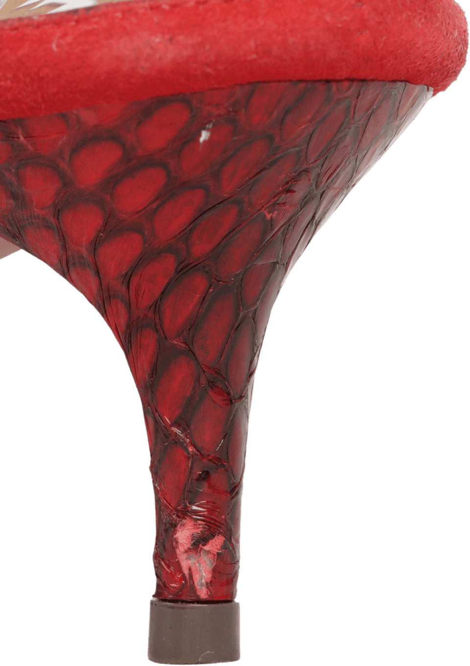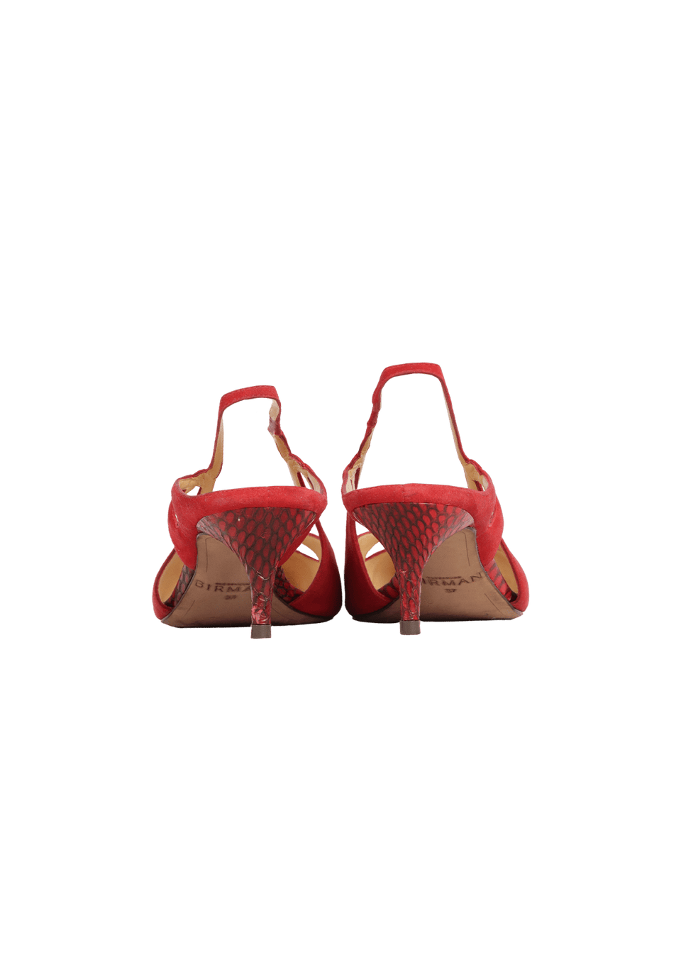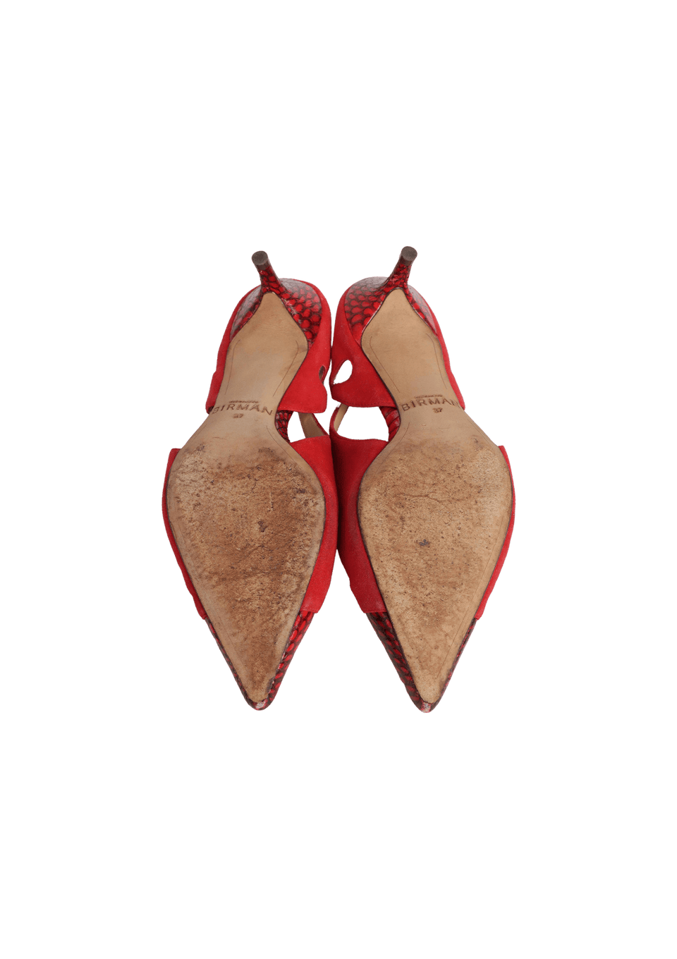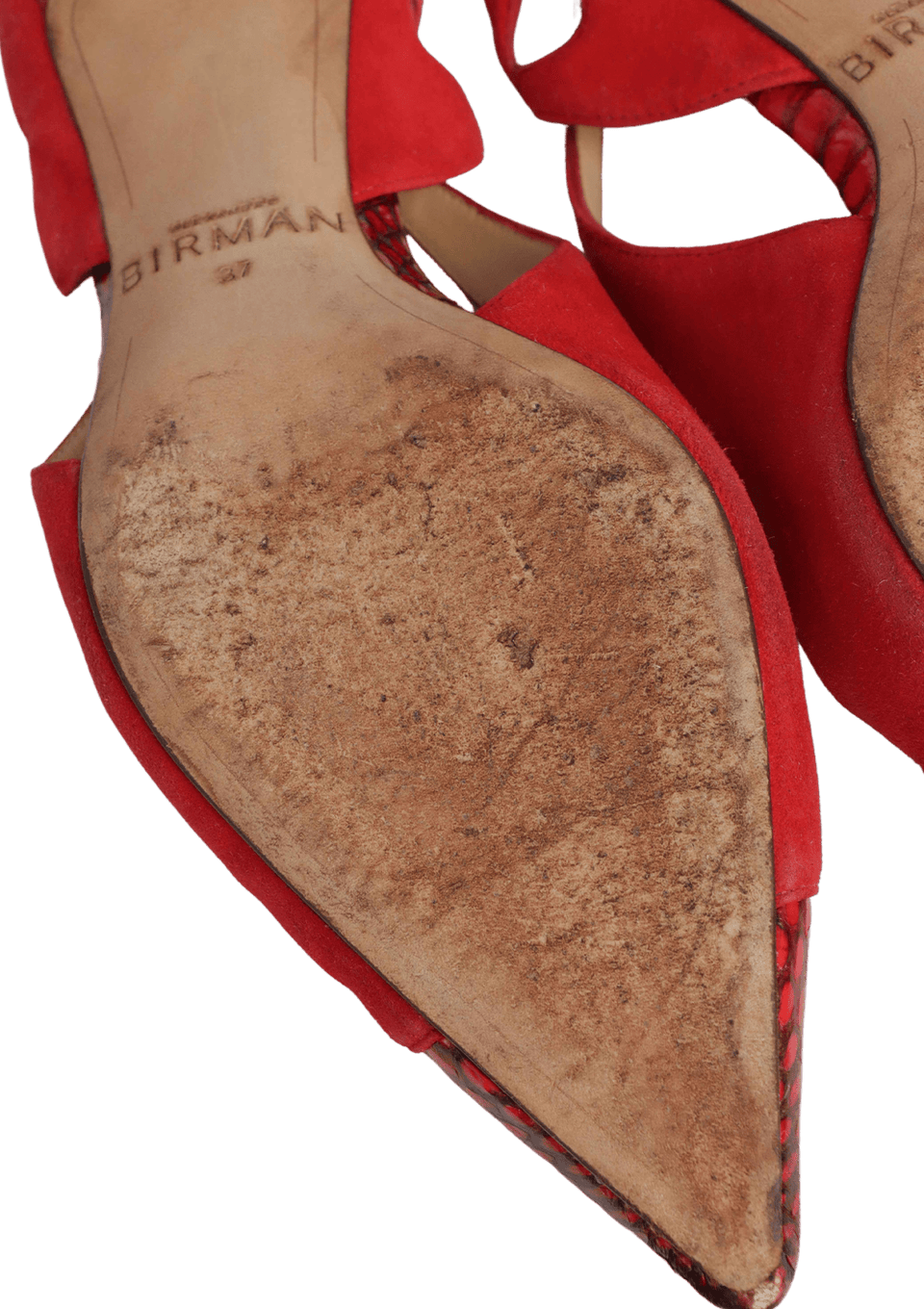 - Suede vermelho e couro vinho.