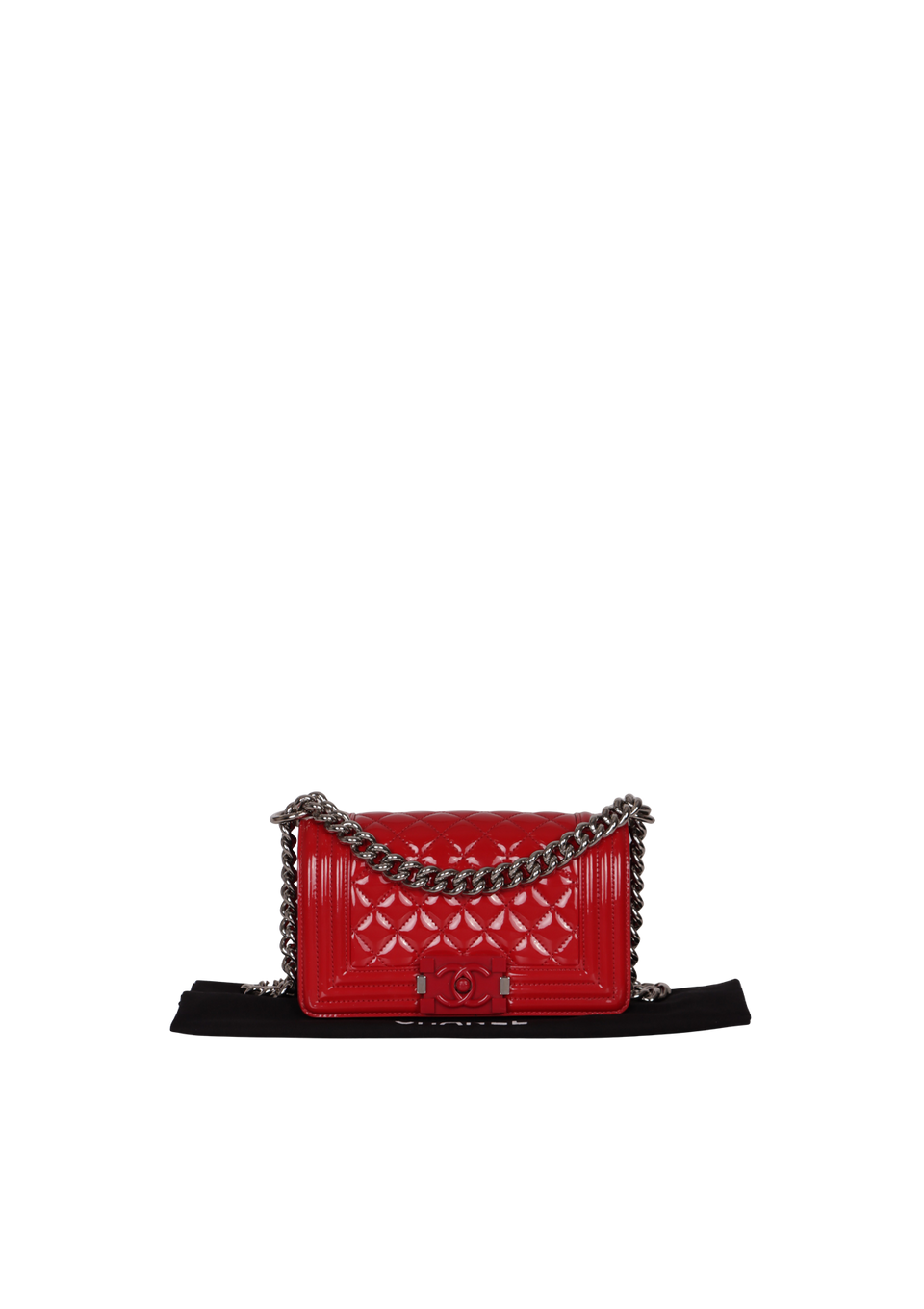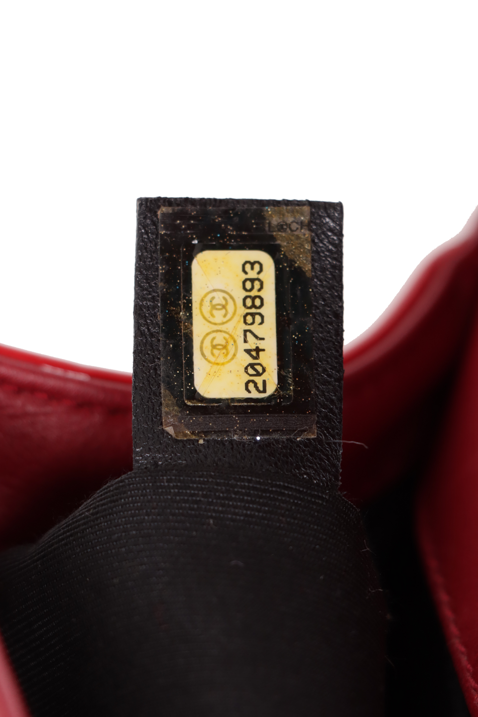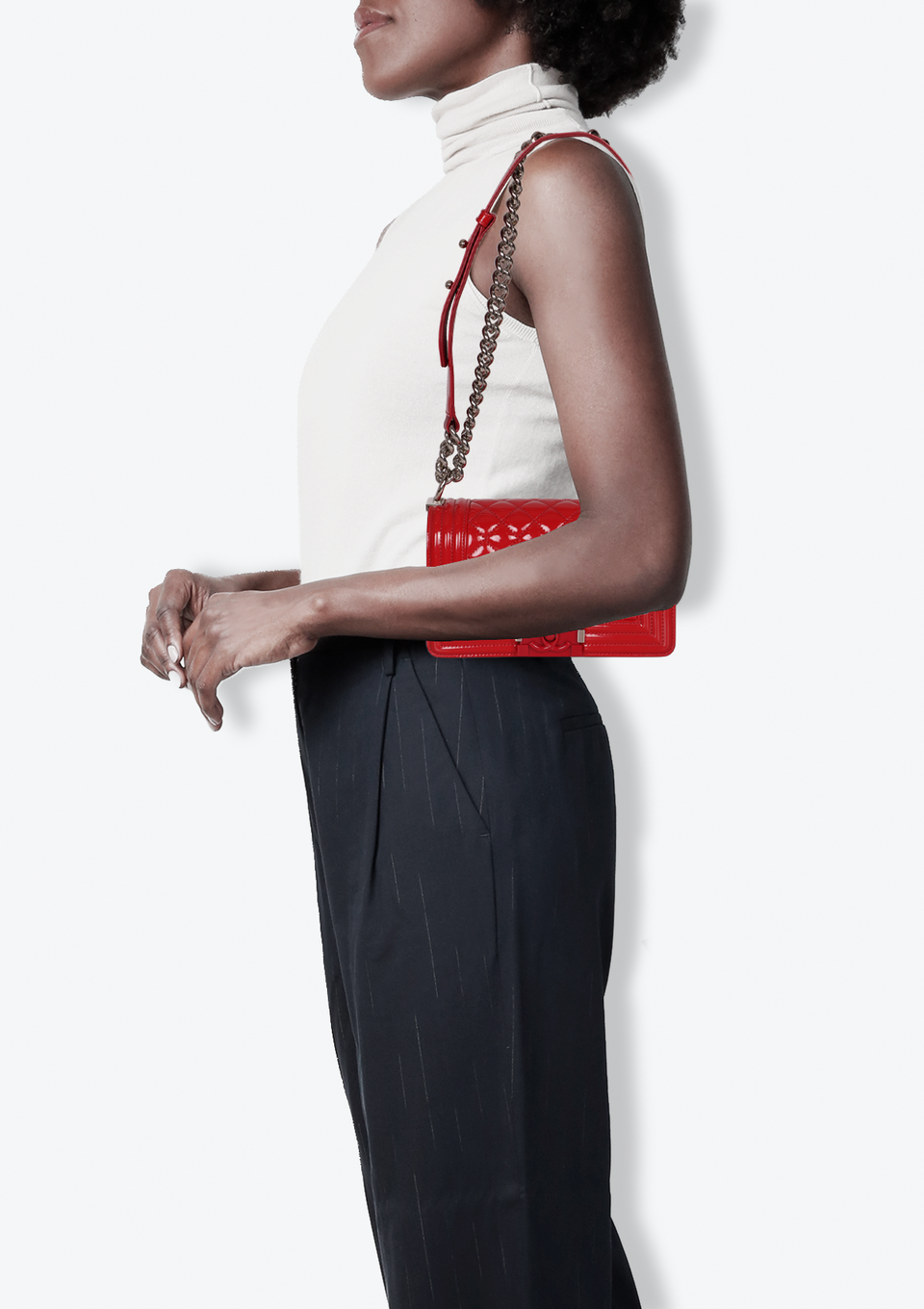 Descrição do Material: Couro calfskin vermelho com acabamento matelassê revestido por verniz