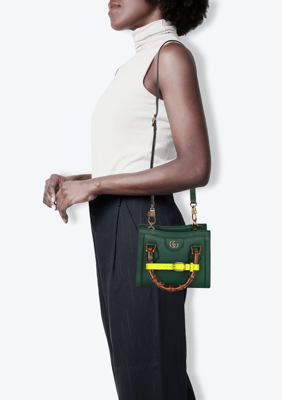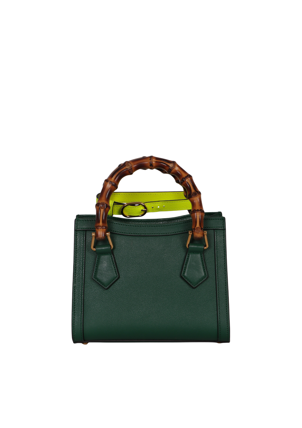 Bom, com aparência de usado. Apresenta leves manchas de uso e marcas de contato pelo couro, especialmente no cinto da alça e na parte central frontal, pequenas marcas de uso nas ferragens da logo frontal, nos detalhes da alça e no botão magnético, leves deformidades pela estrutura da alça de ombro, pequenas fissuras nas alças de bambu e leves manchas de uso e puídos pelo forro. O produto não acompanha um dos cintos de alça e alça longa em faixa Web referentes ao modelo original.