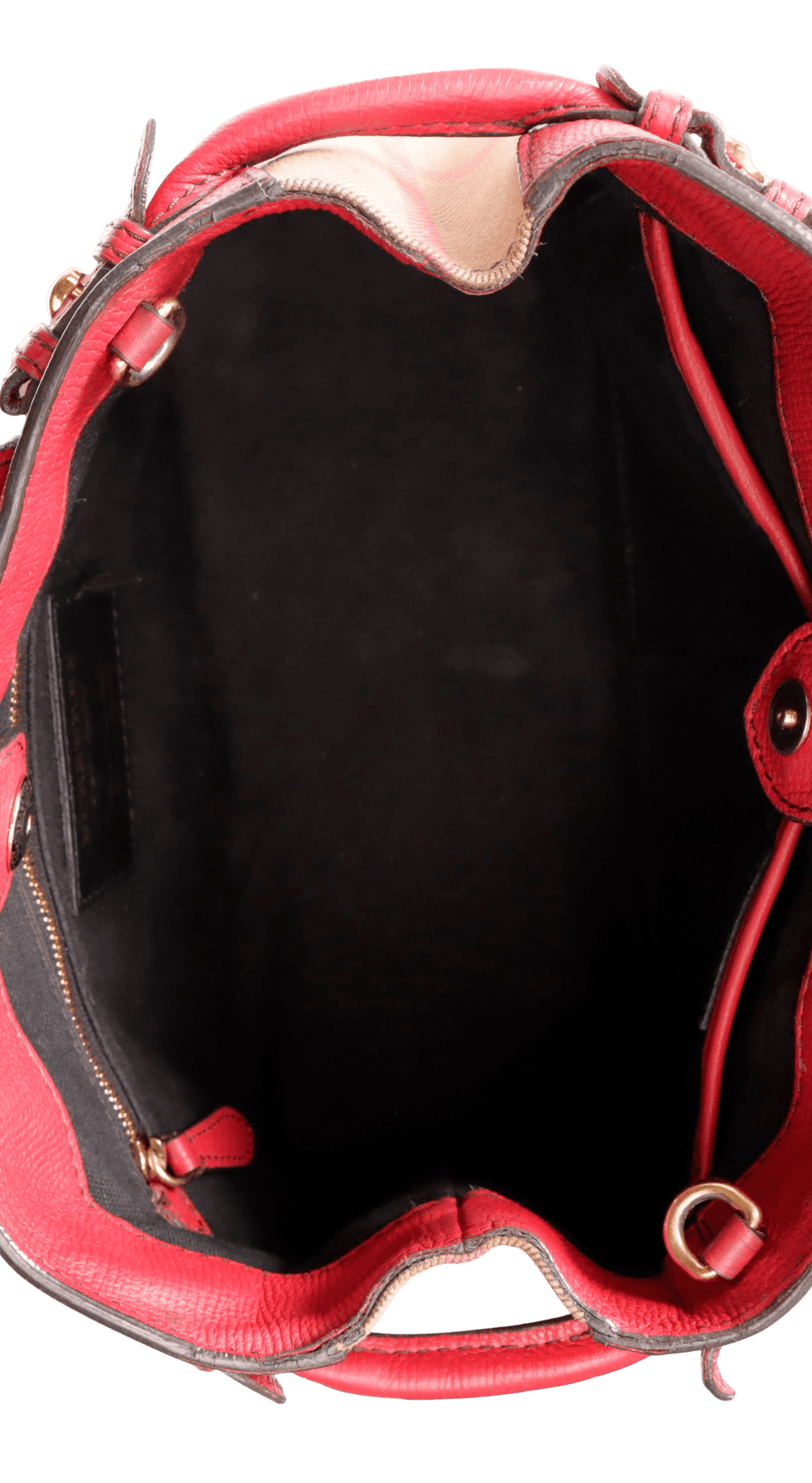Regular. Apresenta notável deformaçāo na estrutura da peça, especialmente na lateral esquerda inferior, severos desgastes pelo couro nos cantos da base, consideráveis fissuras nas selagens, principalmente do acabamento superior e alças, notáveis manchas escurecidas e esbranquiçadas pelo couro, consideráveis descolorações e marcas de uso pelas ferragens, couro consideravelmente ressecado e opaco, notáveis manchas esbranquiçadas no forro e considerável odor característico de item armazenado.