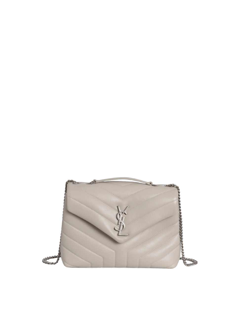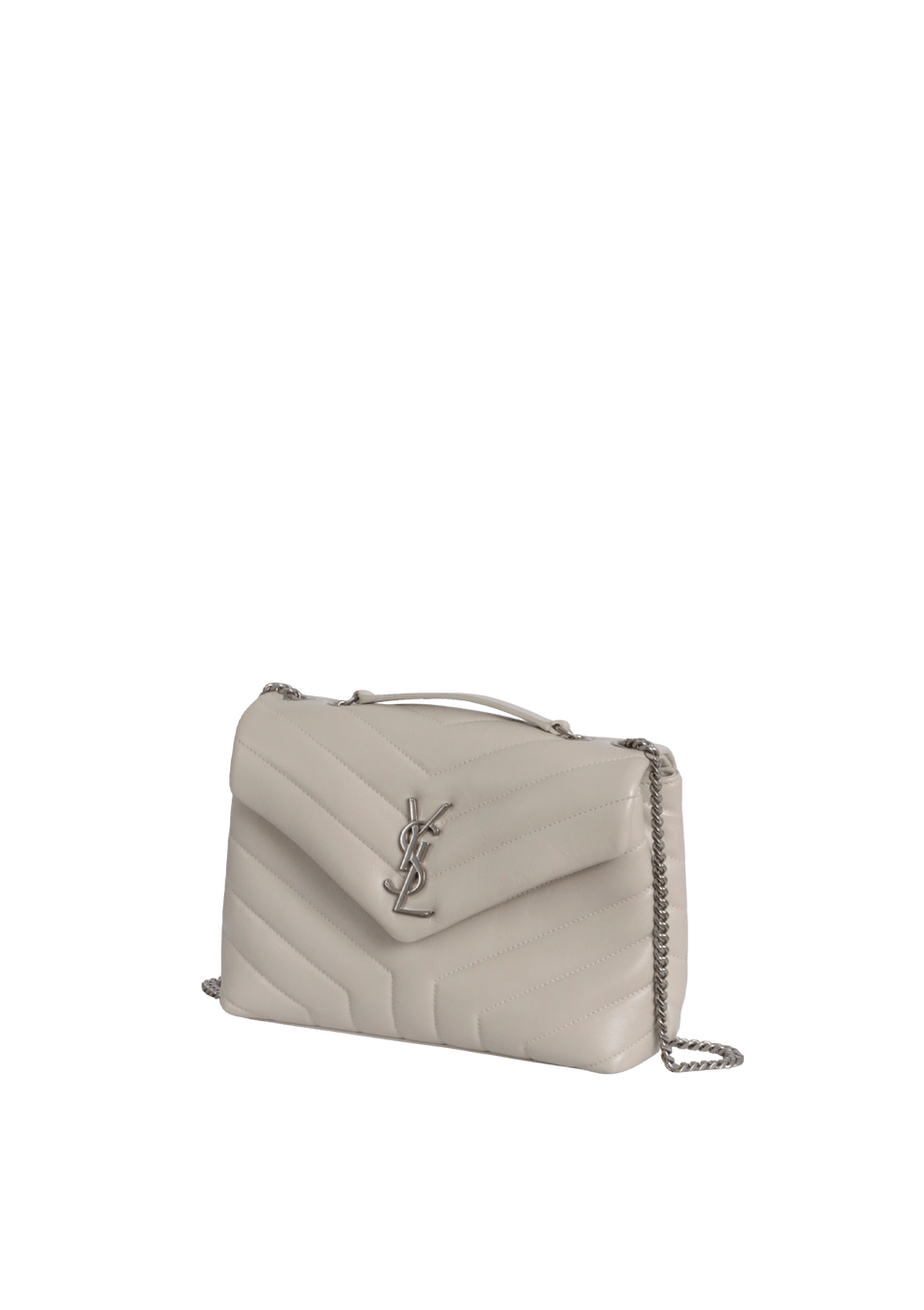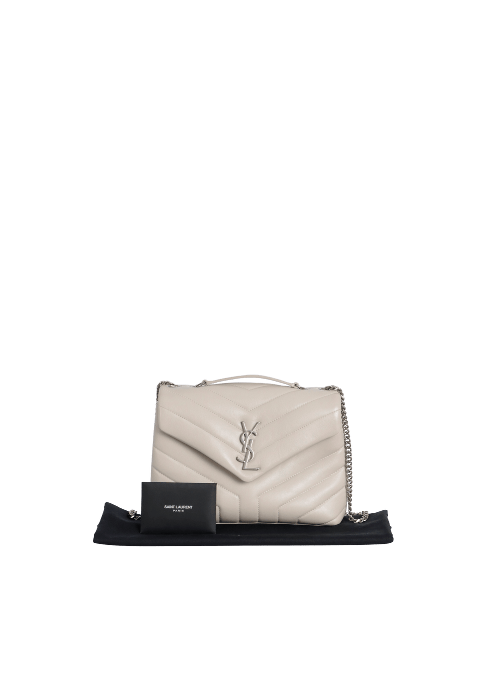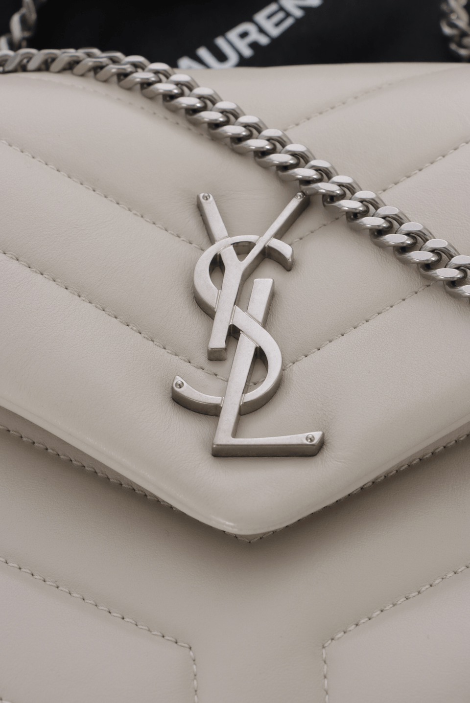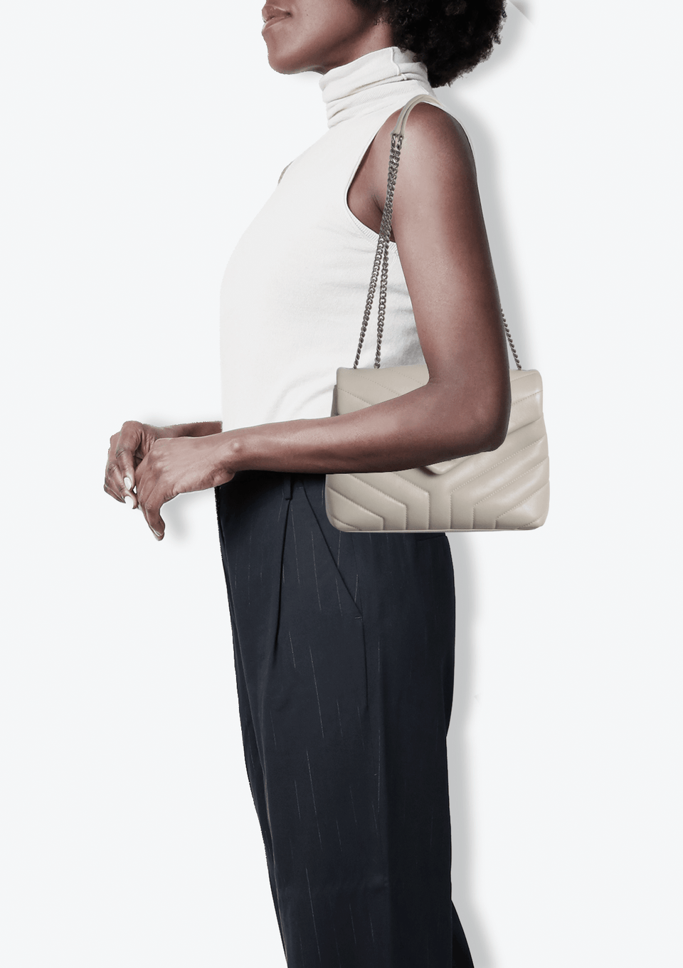 - Couro calfskin off white com acabamento matelassê chevron Y;