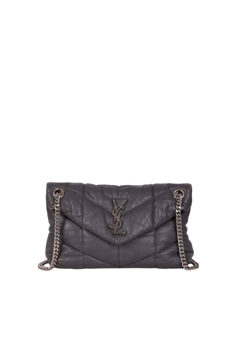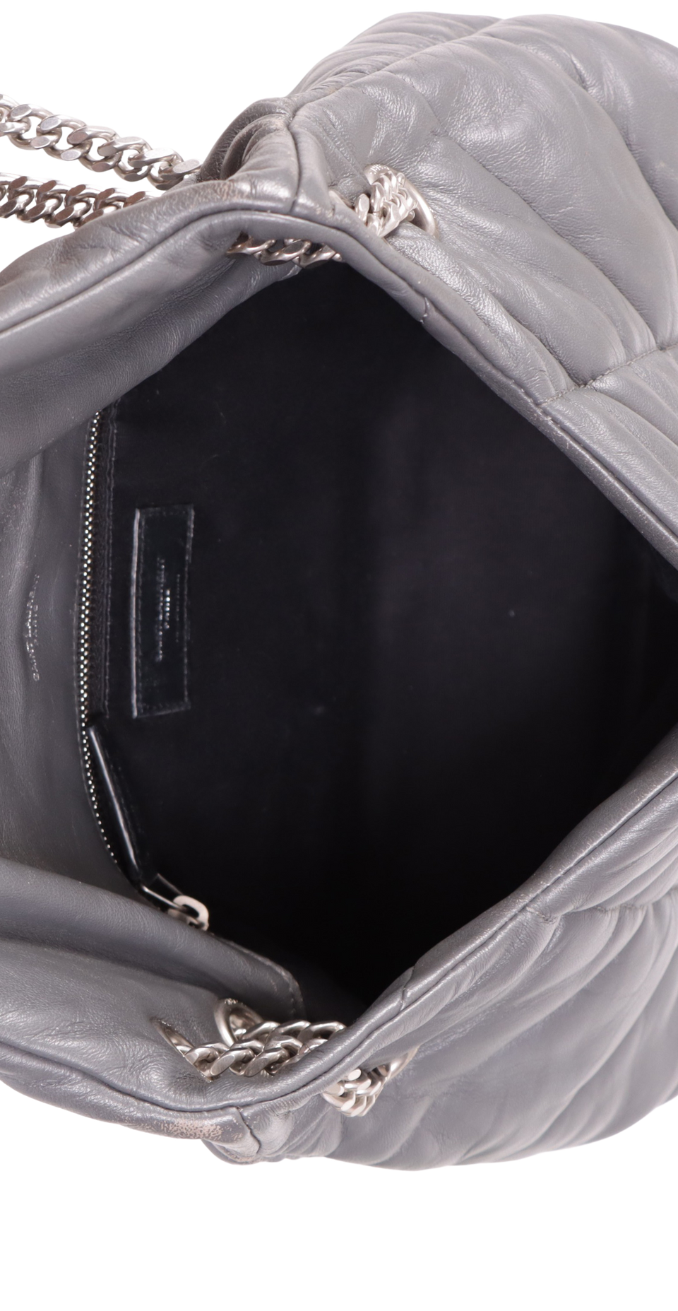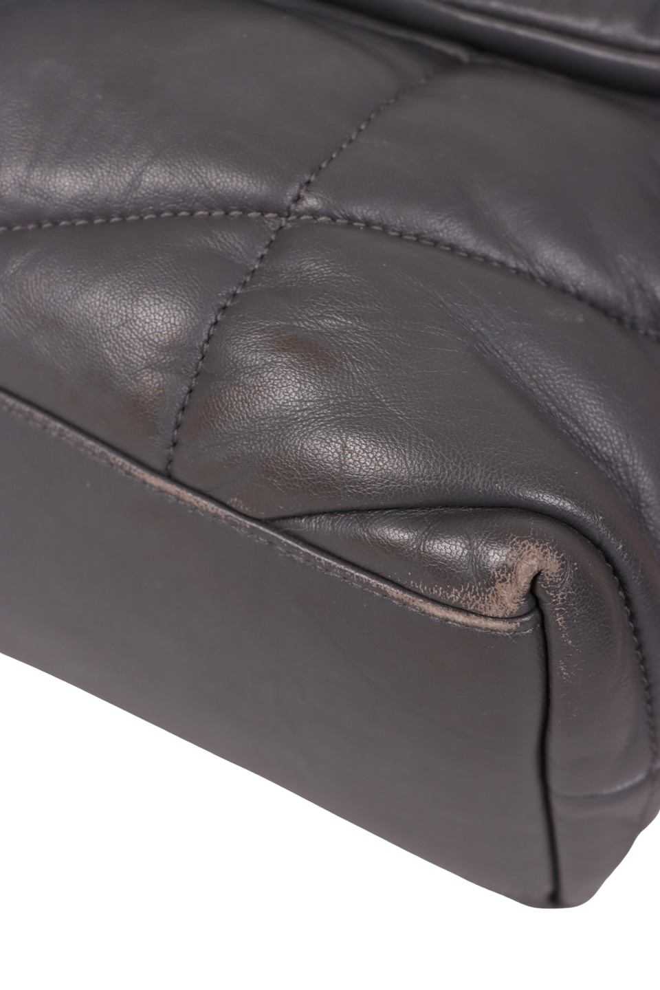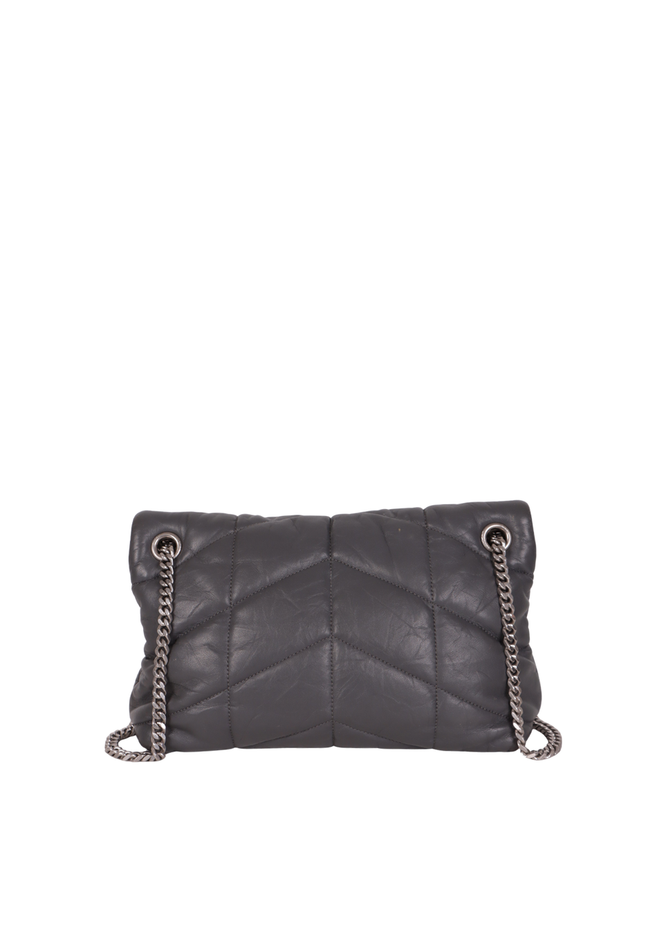 Descrição do Material: Couro lambskin cinza com acabamento matelassê chevron