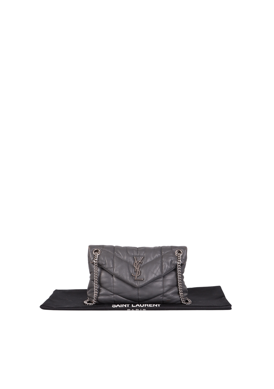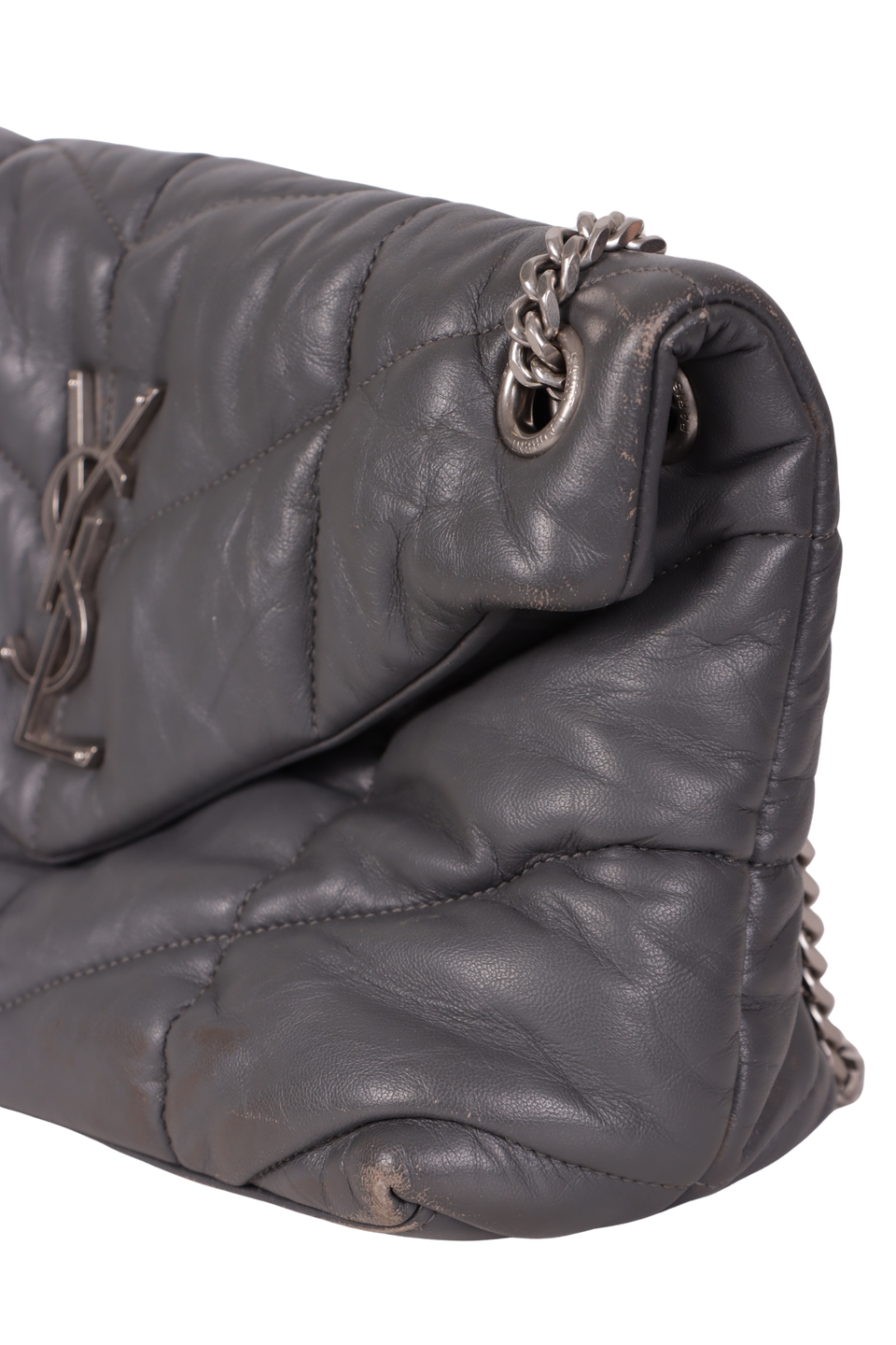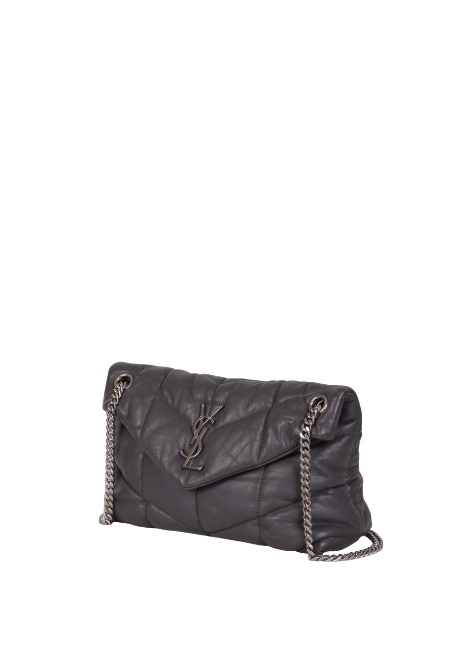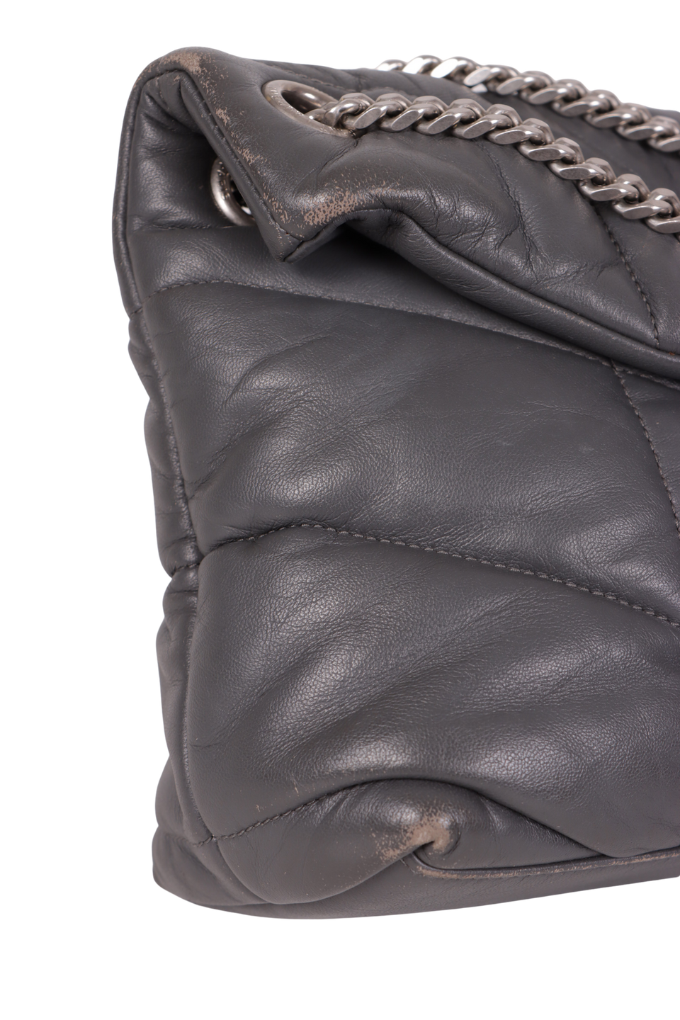 Descrição do Material: Couro lambskin cinza com acabamento matelassê chevron