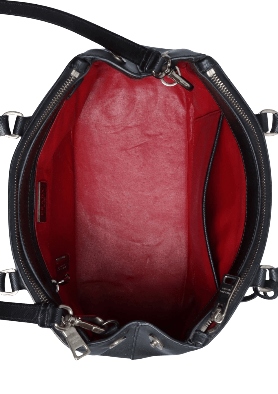 Condição: Bom, com aparência de usado. Apresenta leves manchas esbranquiçadas por todo o couro, especialmente na base, pequenos desgastes no couro dos quatro cantos inferiores da bolsa, leves marcas de uso nas alças, pequenas deformações nos pontos de ajuste da alça longa, leves marcas de uso nos acabamentos superiores, leves desgastes e manchas escurecidas nas ferragens, especialmente nos puxadores dos cursores e leves desgastes e marcas de uso nas partes internas.