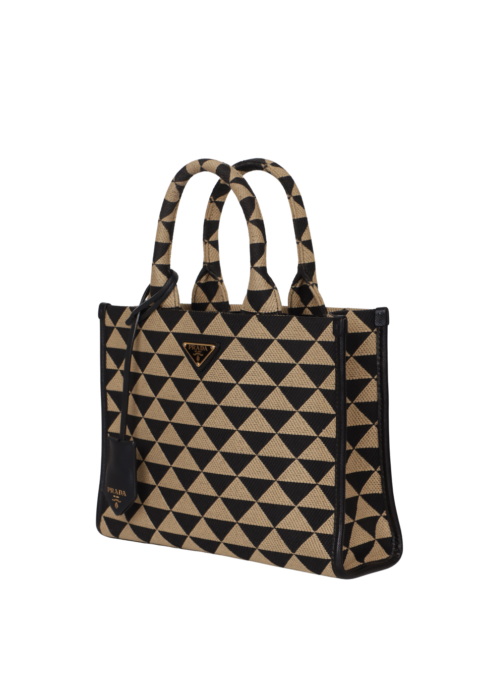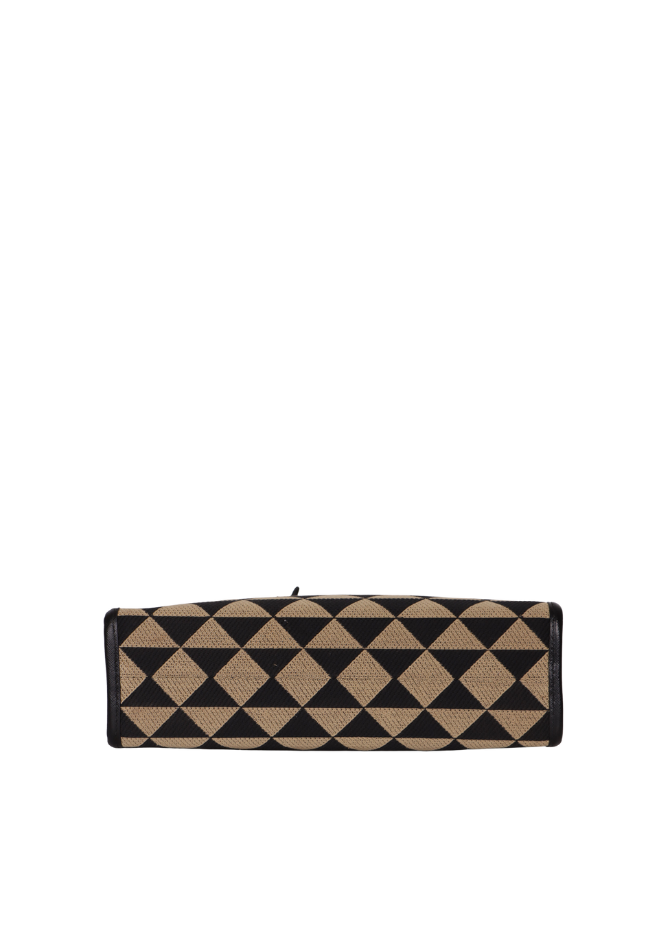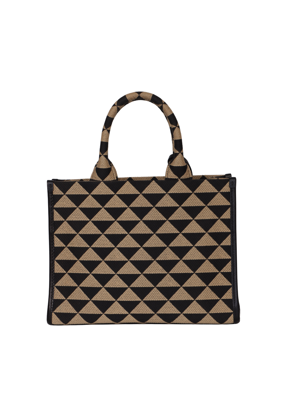 Descrição do Material: Canvas Jacquard com estampa de triângulos nas cores preto e bege e couro Saffiano preto