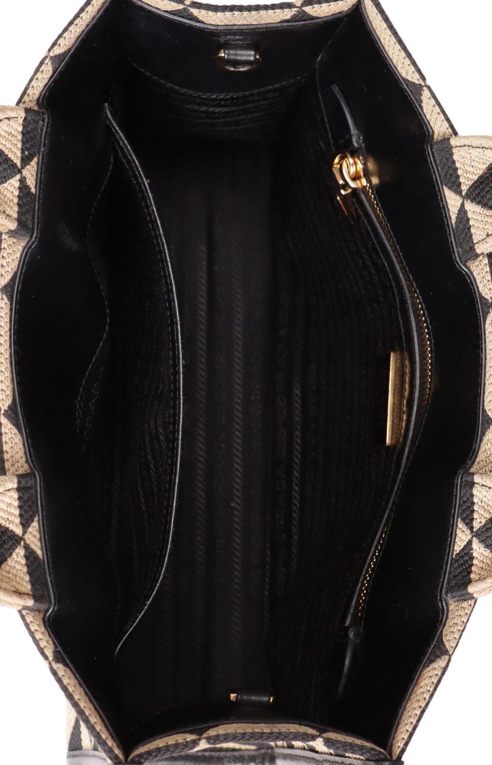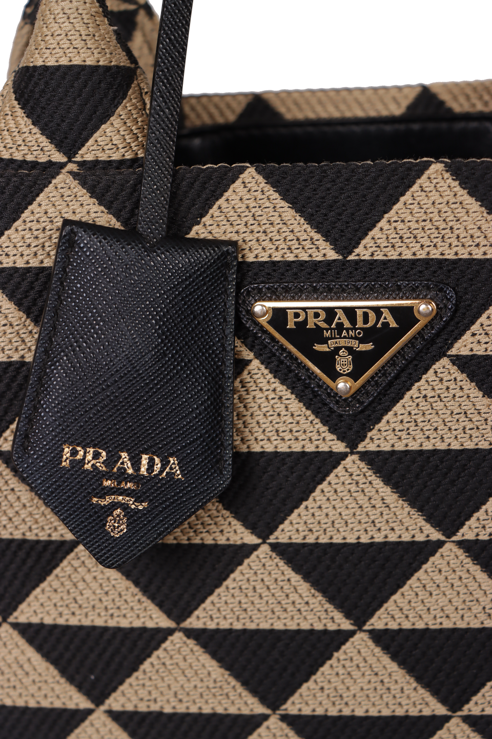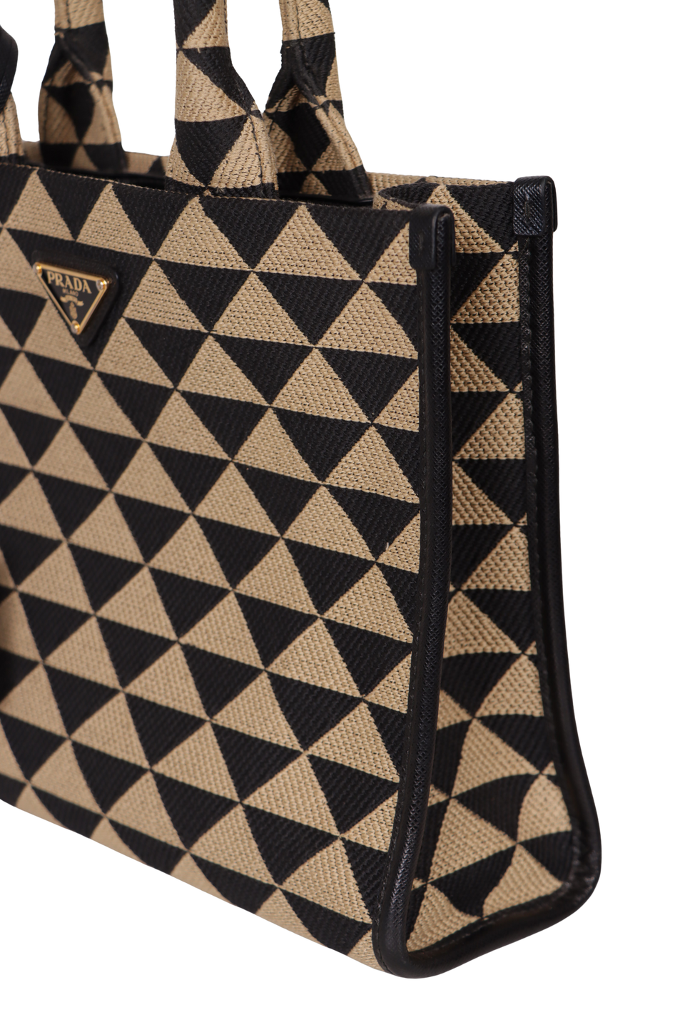 Descrição do Material: Canvas Jacquard com estampa de triângulos nas cores preto e bege e couro Saffiano preto