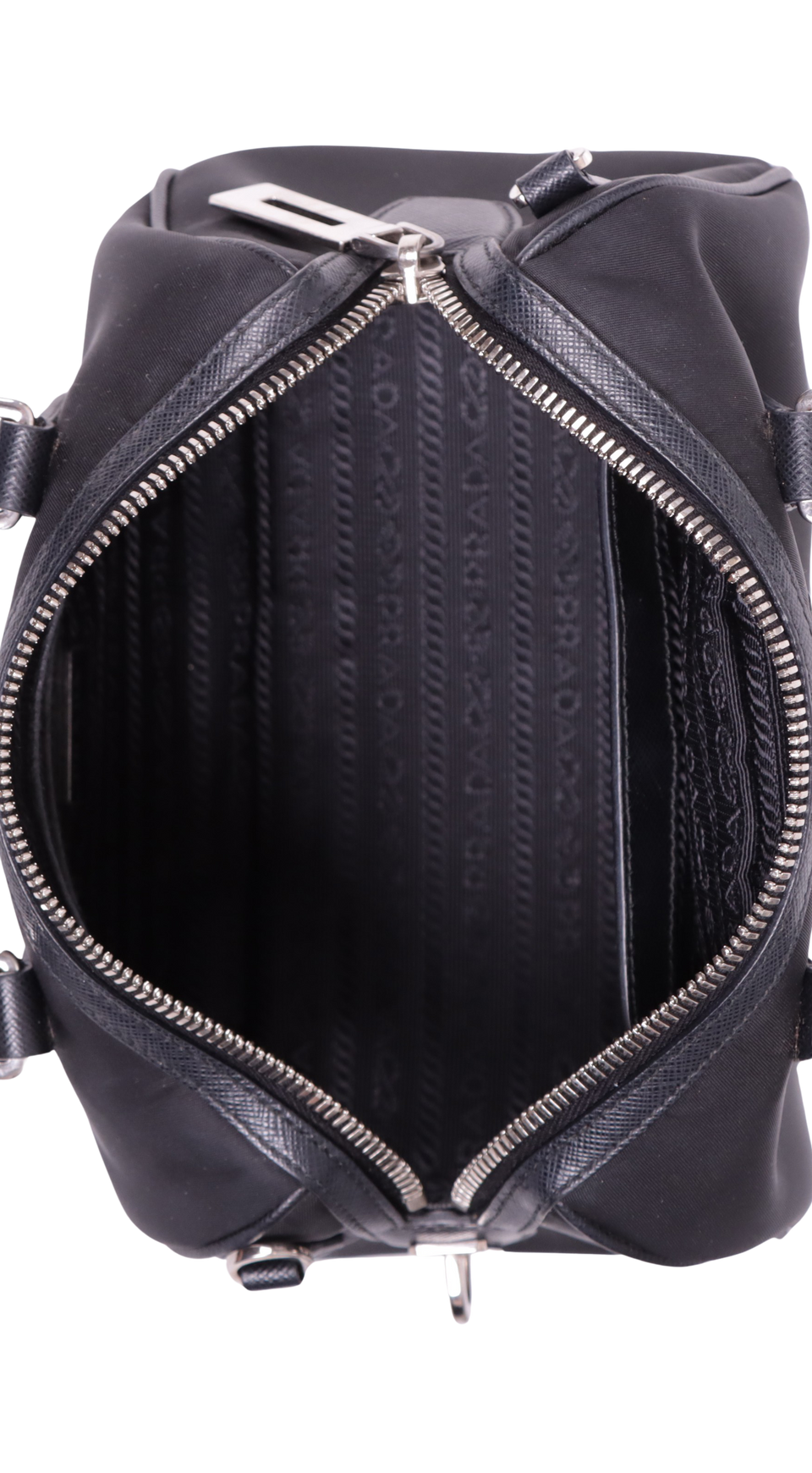 Descrição do Material: Nylon preto com detalhes em couro calfskin preto e acabamento saffiano