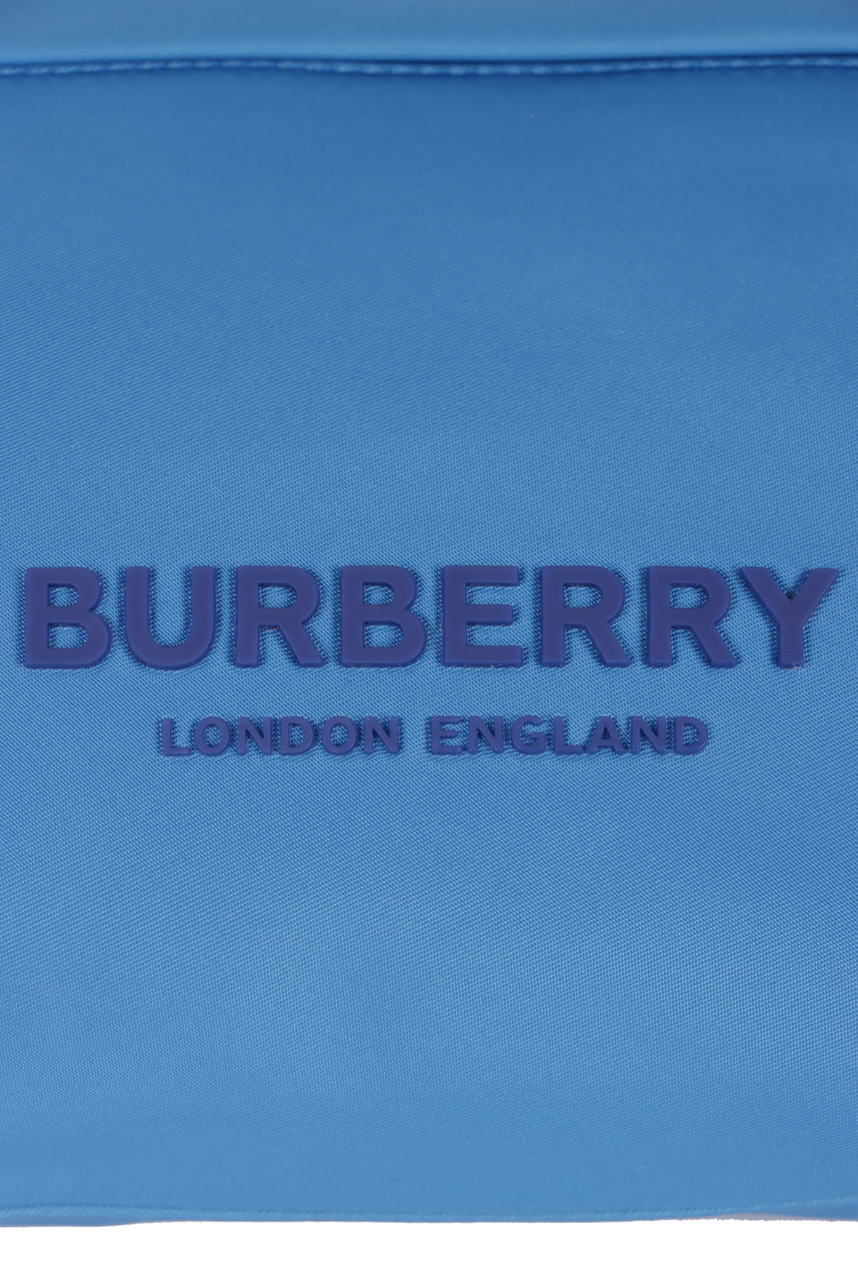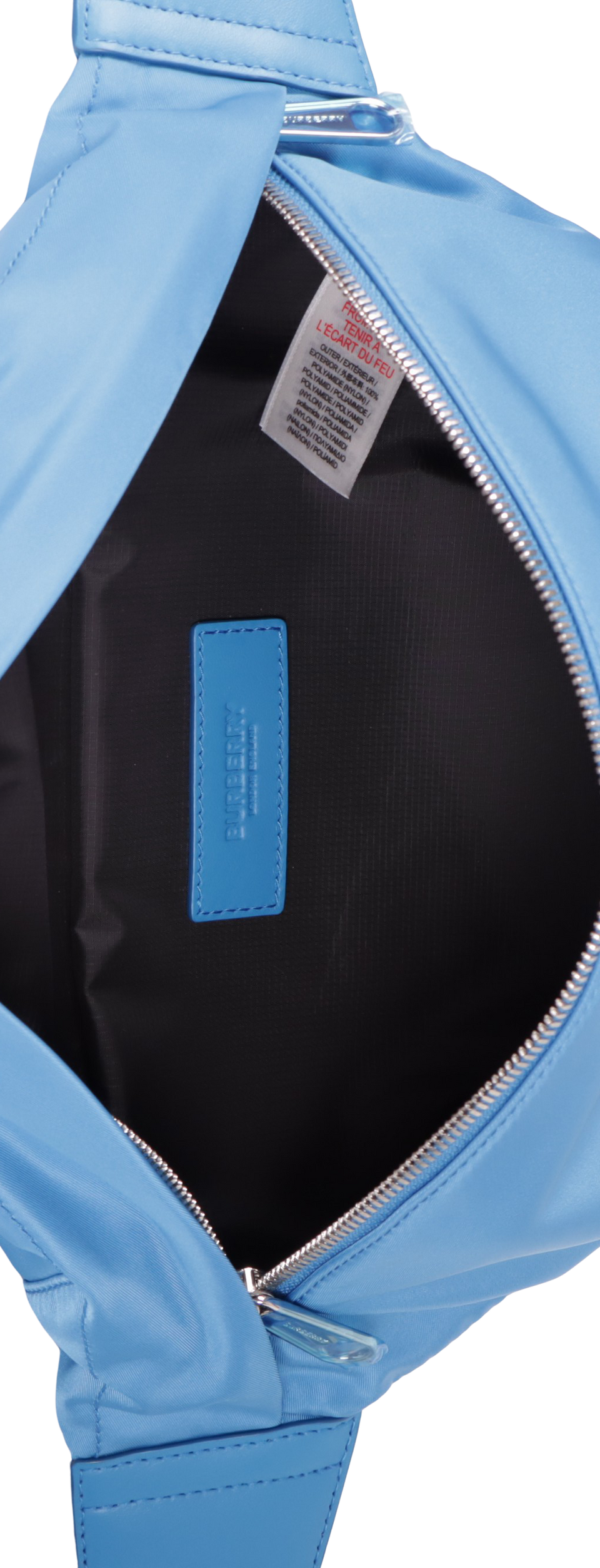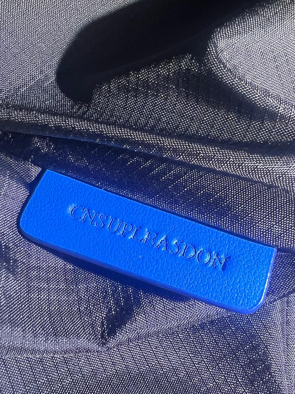 Descrição do Material: Nylon azul com detalhes em couro calfskin e borrachas azuis