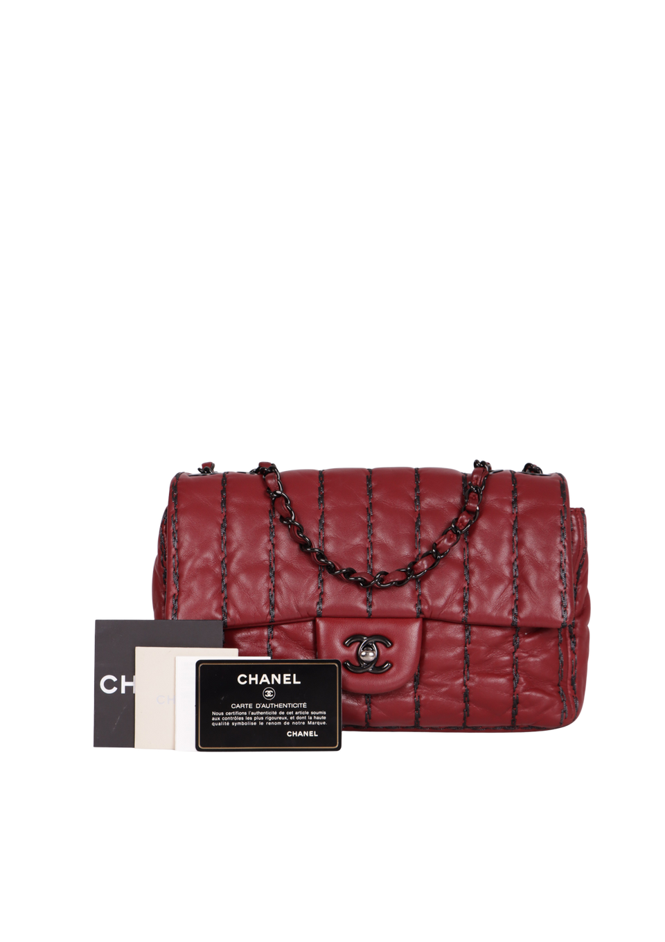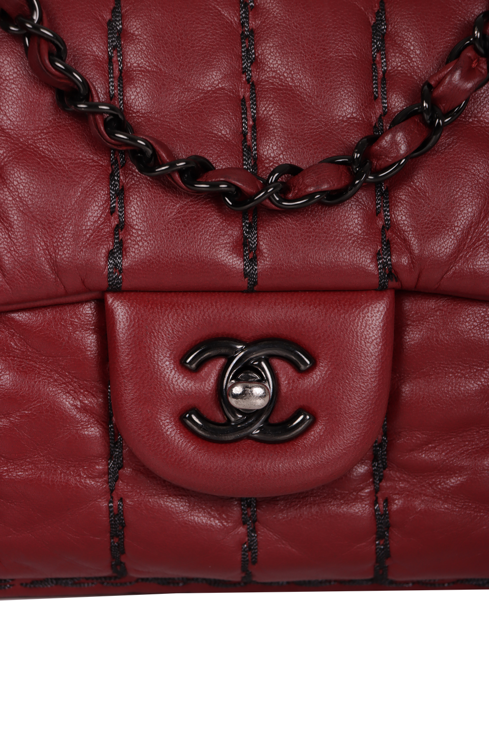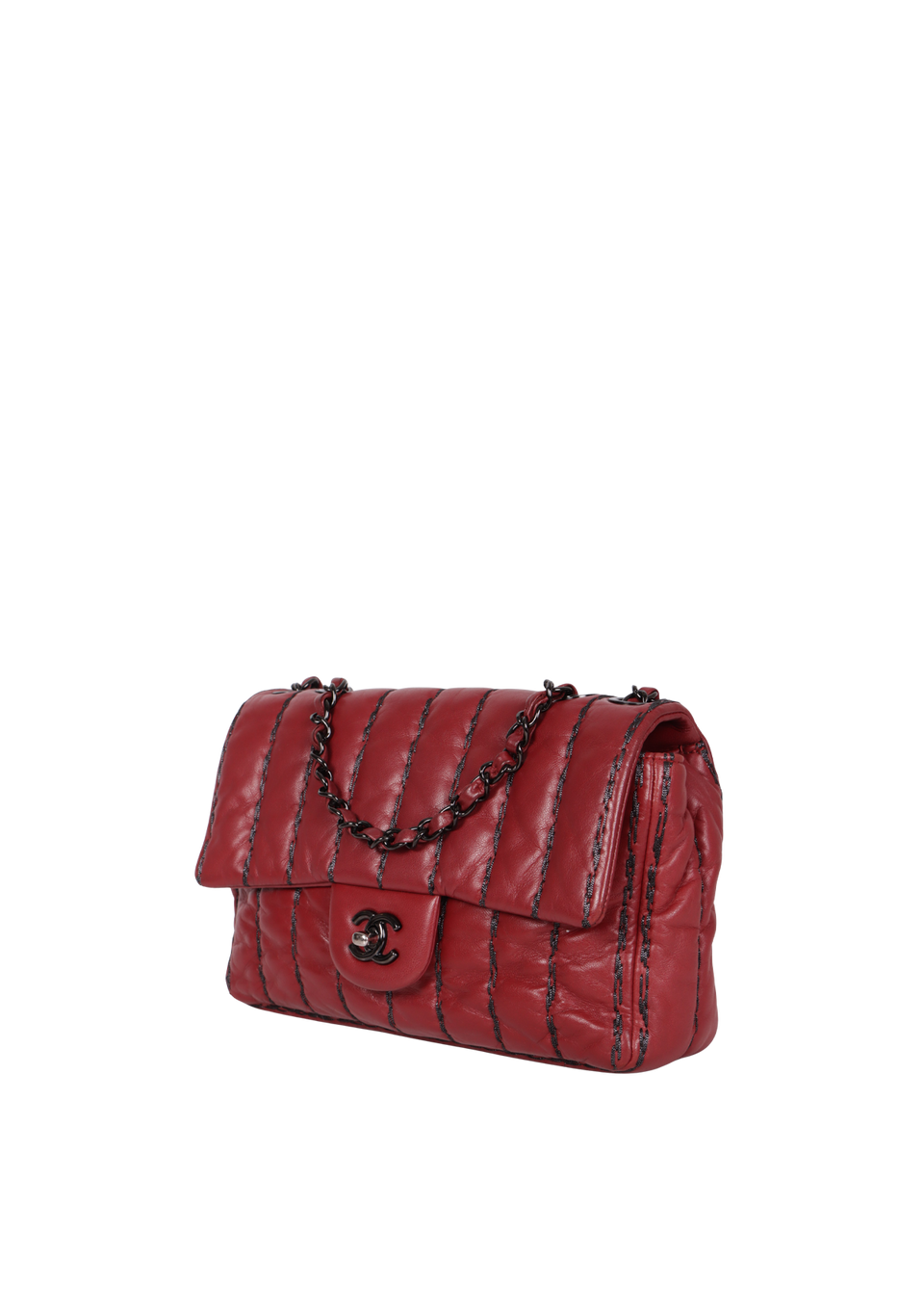 Descrição do Material: Couro lambskin bordô com tiras de lurex pretas