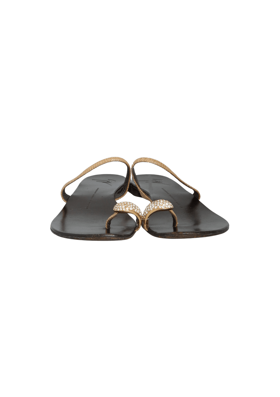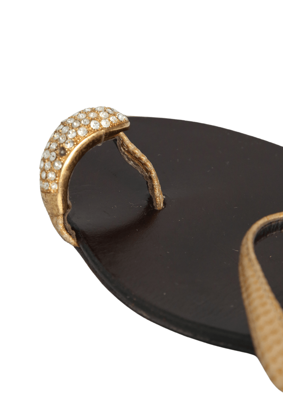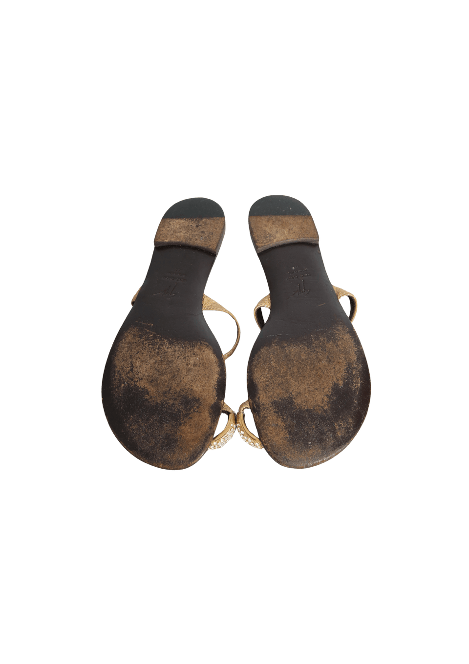 Condição: Bom, com aparência de usado. Apresenta pequeno descolamento na tira da frente dos dois pés, ausência de um strass, um em cada pé, leves desgastes e riscos nas palmilhas, especialmente na parte da frente do pé esquerdo e pequenos desgastes nas solas.