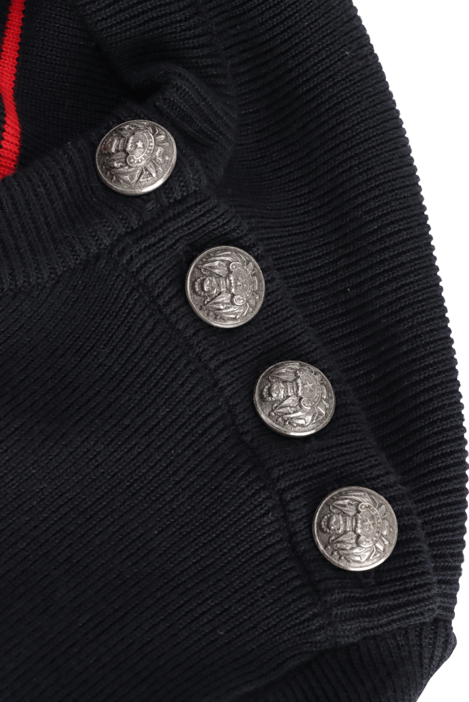 Bom, com aparência de usado. Apresenta leve perda das aplicações e rupturas das linhas no detalhe frontal, pequenos puídos de contato, manchas e desgastes pelo tecido, especialmente na parte inferior das mangas, leves marcas de uso nas ferragens e pequenos puídos e pillings na parte interna, principalmente na gola.
