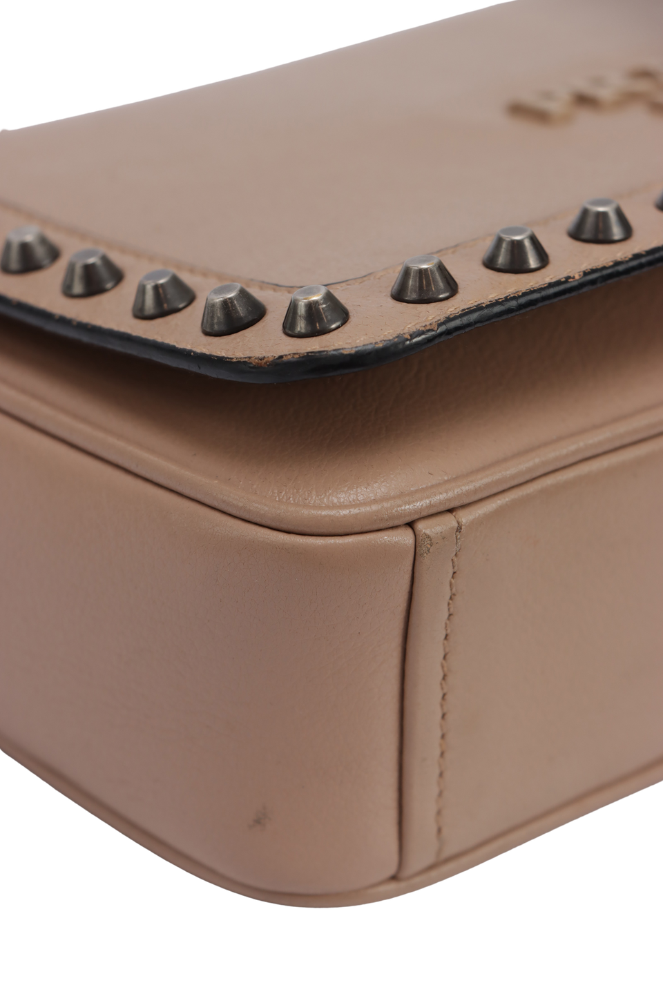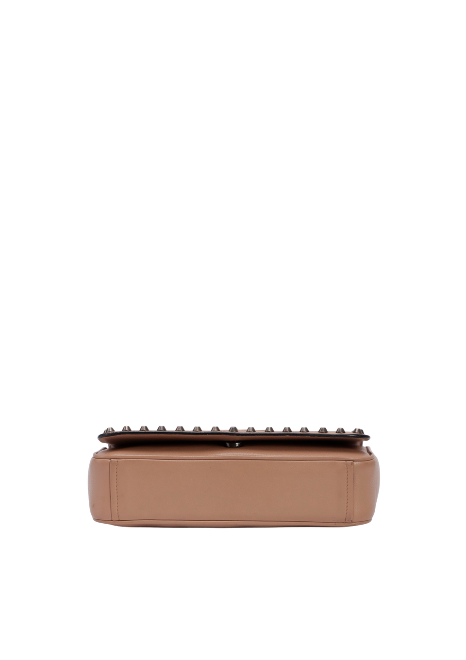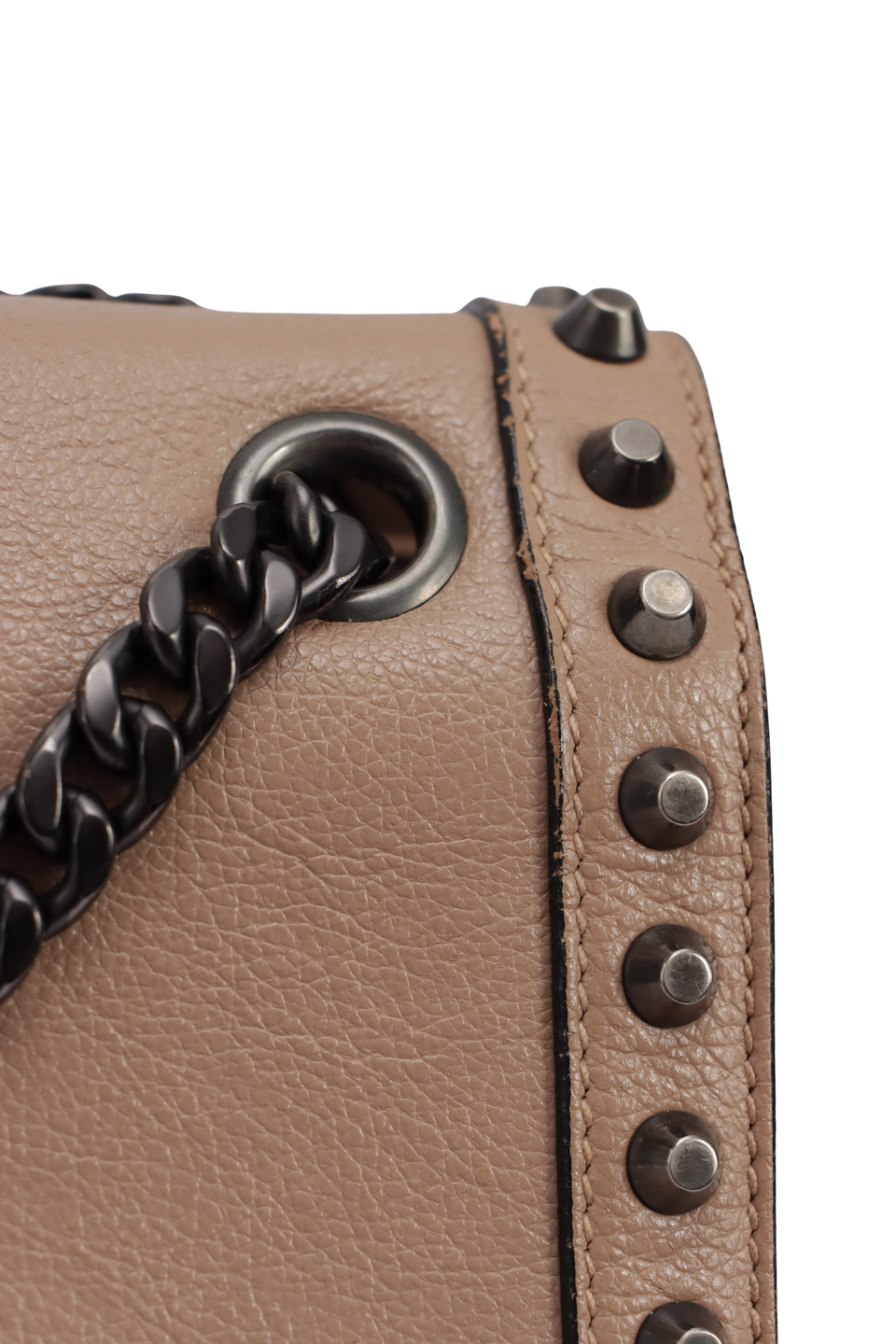 Bom, com aparência de usado. Apresenta leves manchas e desgastes pelo couro, especialmente na parte frontal, parte inferior da lateral esquerda e base, pequenas marcas de uso e descolorações pelas ferragens, principalmente na logo frontal e nos studs, pequenos desgastes pelas selagens das laterais e partes internas e leves manchas de uso pelo forro.