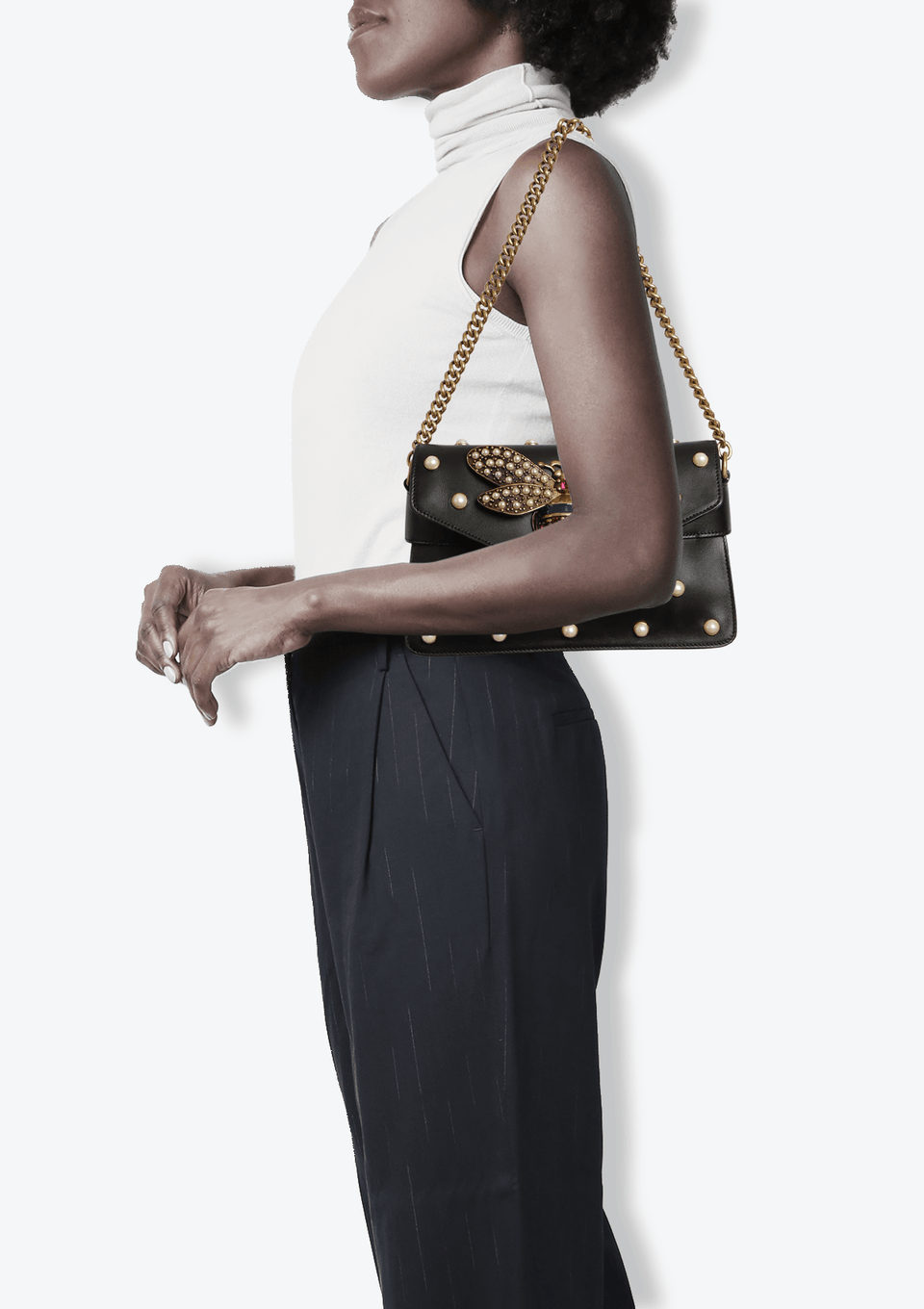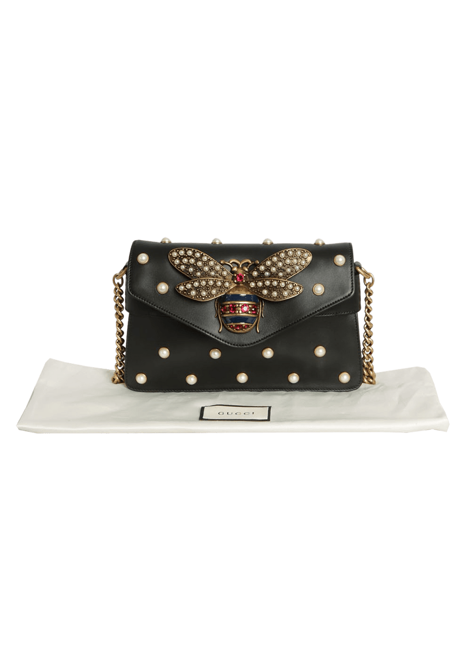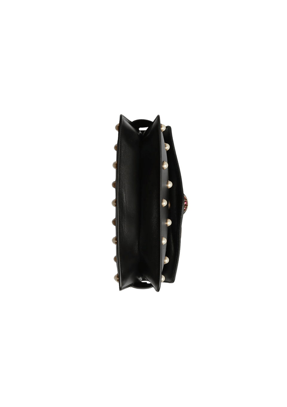 - Couro calfskin preto com aplicação de cristais vermelhos e pedrarias brancas;