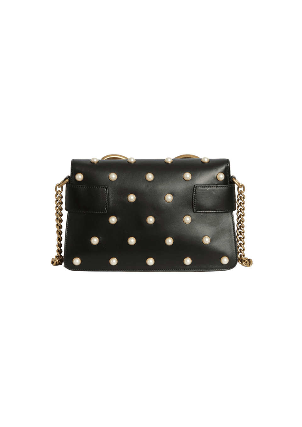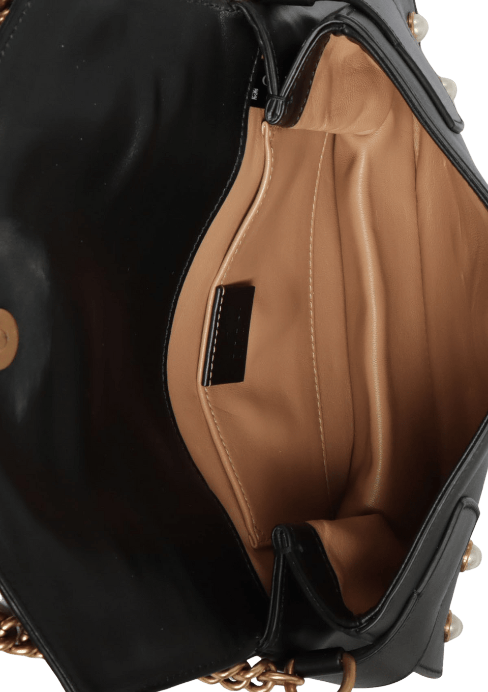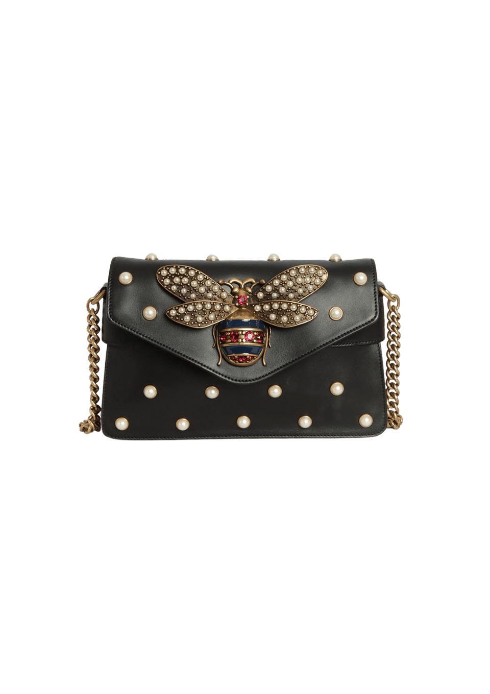 - Couro calfskin preto com aplicação de cristais vermelhos e pedrarias brancas;