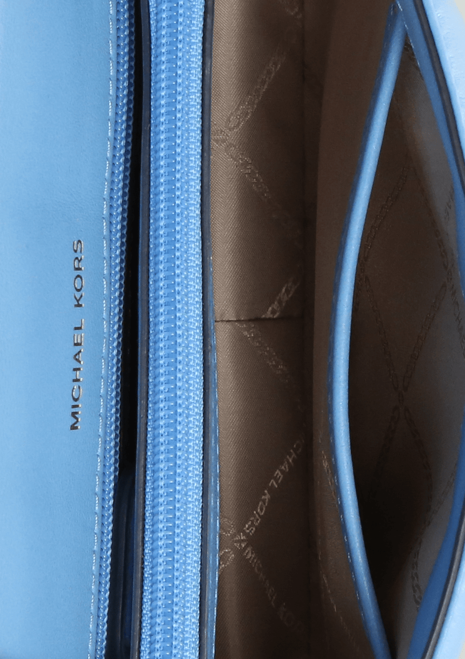 - Compartimento duplo com três bolsos internos, sendo um aberto e dois fechados por cursor, e um externo fechado por botão magnético.