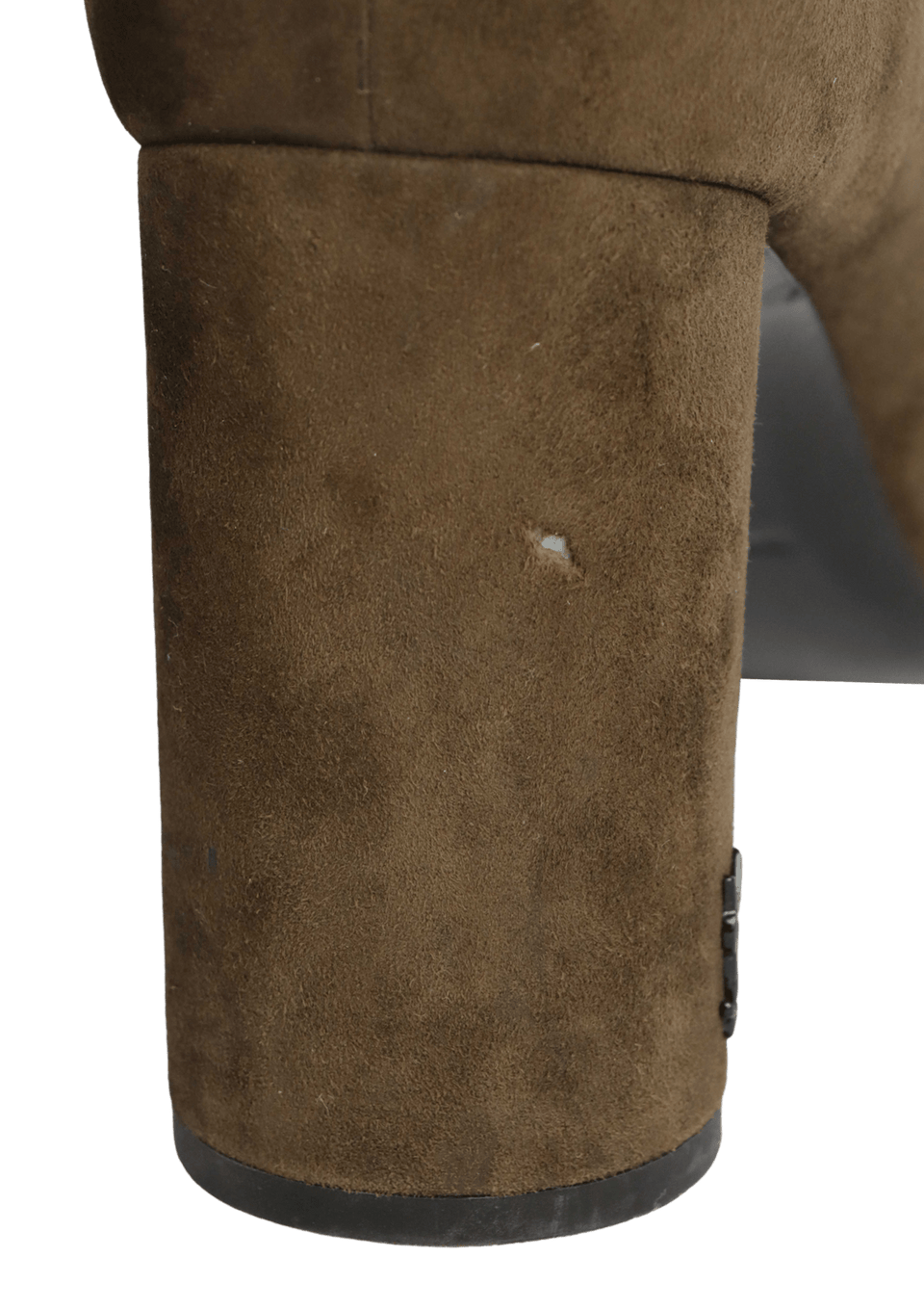Condição: Regular. Apresenta desgastes e um furo severo no suede do pé direito, fissuras e pequenos desgastes no couro, sola com desgastes severos de uso.