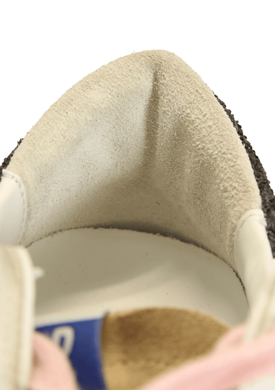 - Couro branco, suede bege e paetê preto;
