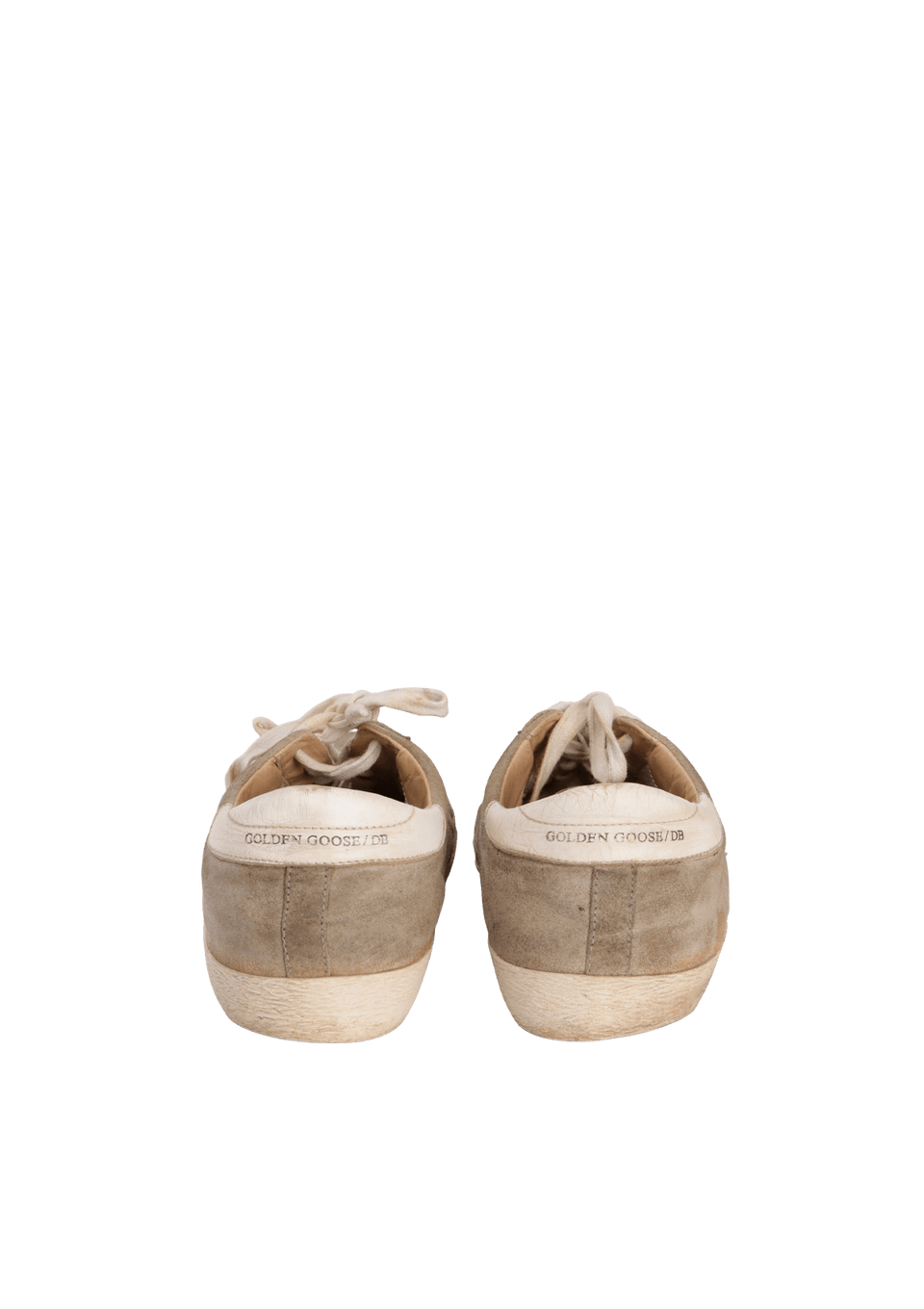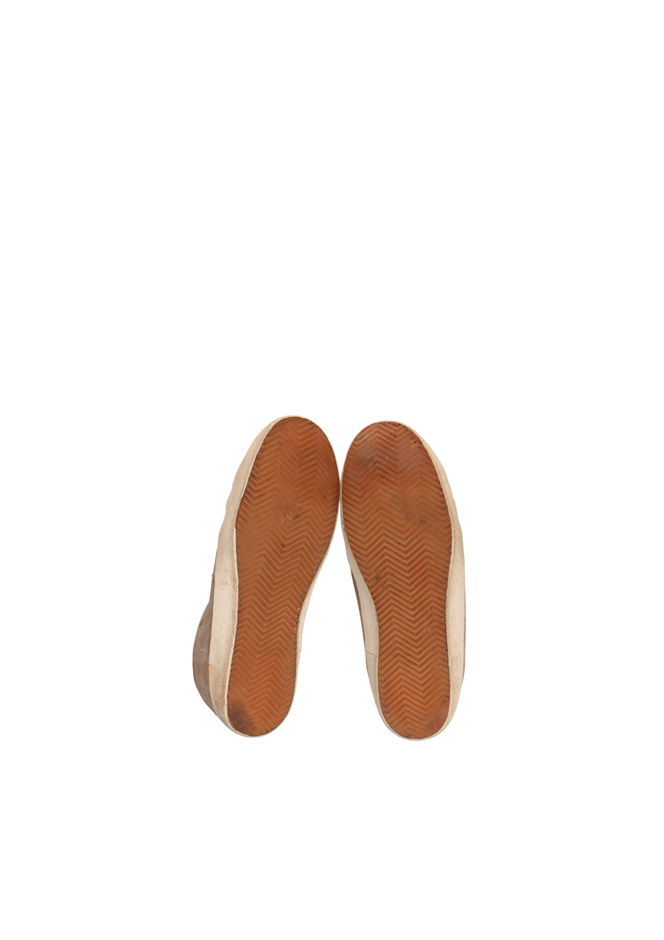 Bom, com aparência de usado. Apresenta pequena deformações nas estruturas, principalmente nas partes laterais dos cabedais, leves manchas amarronzadas pelos cabedais, especialmente na lateral do par direito, leve aspecto encardido e manchas pelos cadarços, pequenos desgastes e manchas escurecidas nas entressolas, principalmente nas partes frontais, leves marcas de uso e manchas na parte interna e leves marcas de uso nos solados. Apresenta manchas e desgastes característicos do design original.
