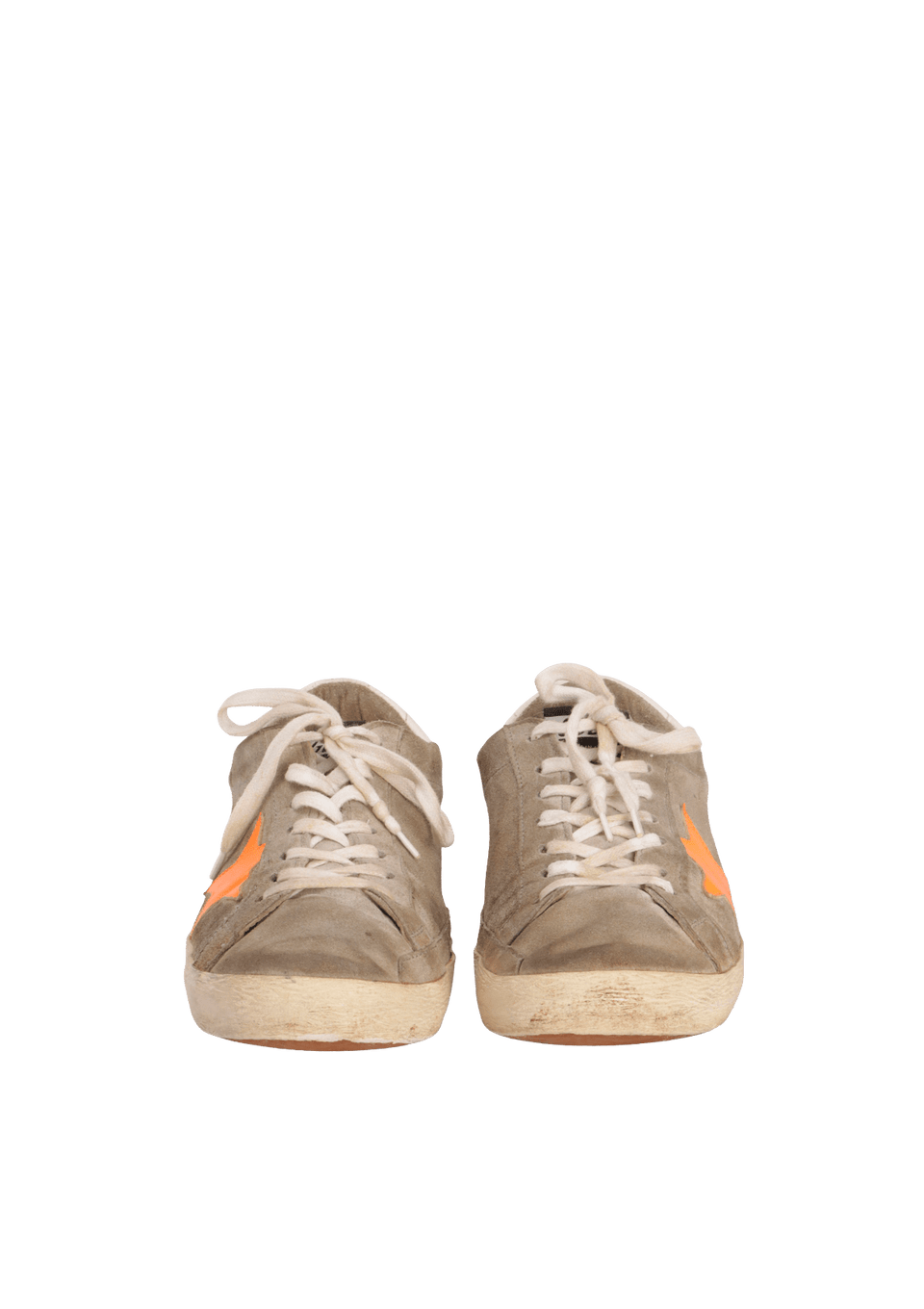 Descrição do Material: Nobuck cinza com detalhes em couro bovino laranja e off white e borracha off white