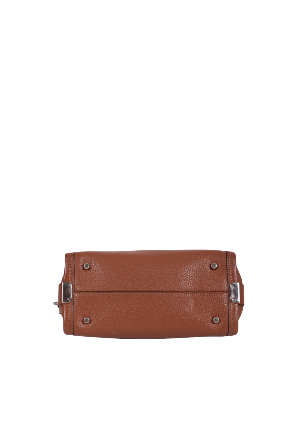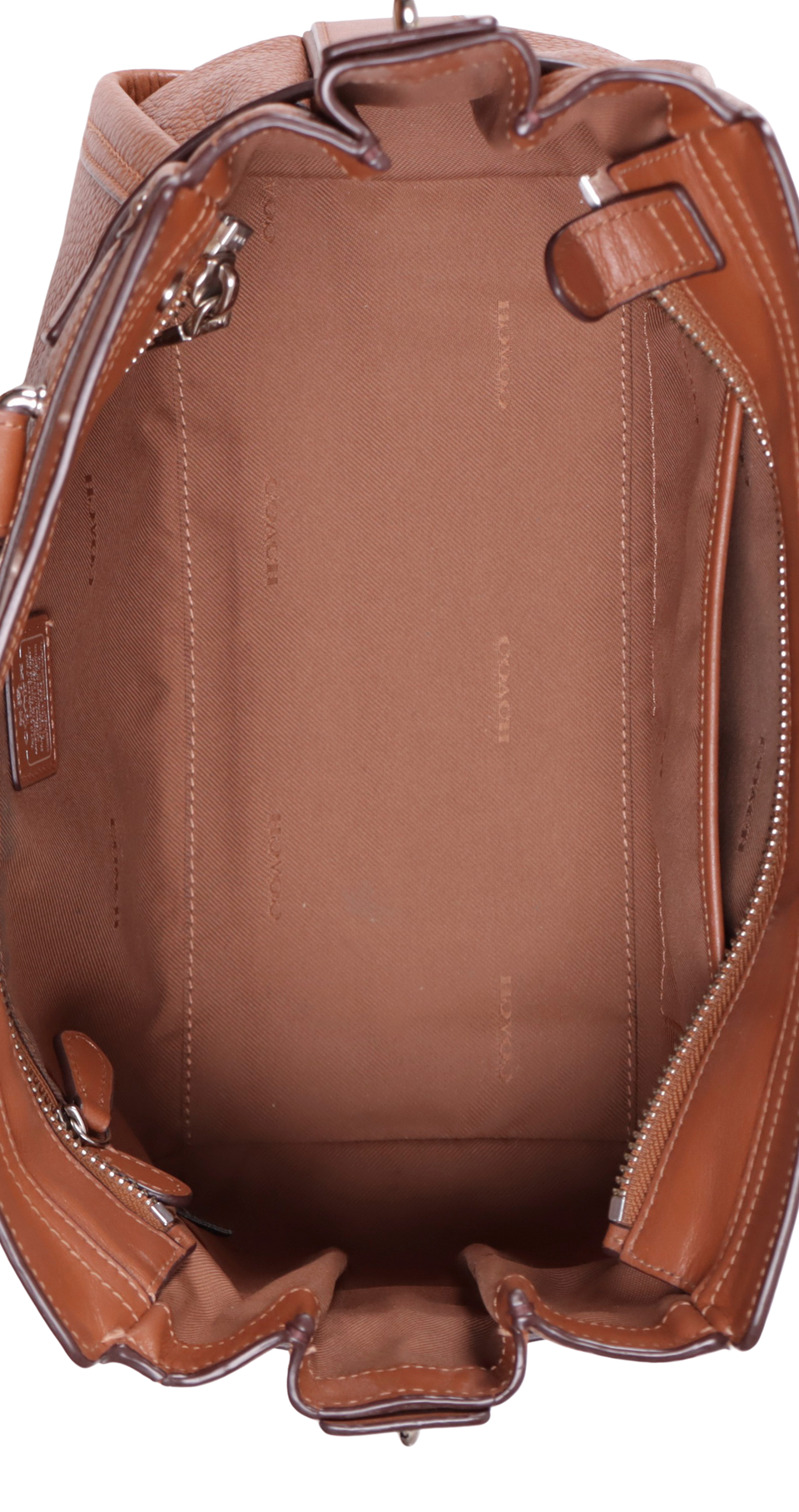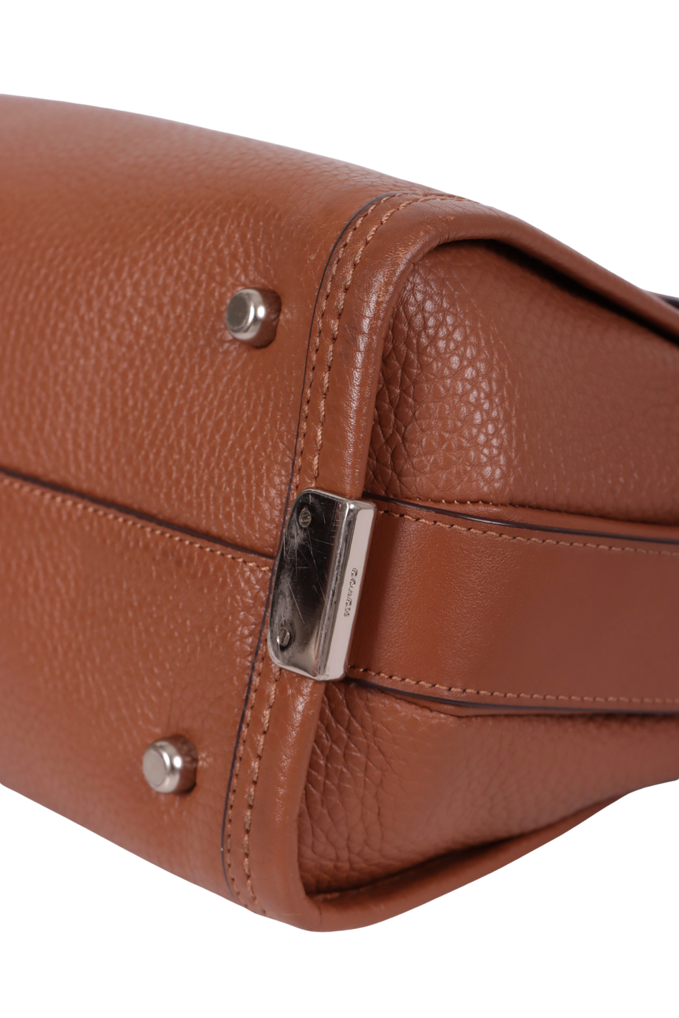 Bom, com aparência de usado. Apresenta leves desgastes, manchas escurecidas e marcas de uso pelo couro, especialmente nos cantos da base, pequenas marcas de uso nas ferragens do detalhe frontal, nos detalhes das alças, nos puxadores dos cursores e na tag de metal da marca, leves deformidades pela estrutura, principalmente na alça de mão e na parte inferior do lado direito frontal, pequenas fissuras nas selagens das extremidades superiores laterais e levíssimas manchas de uso pelo forro.