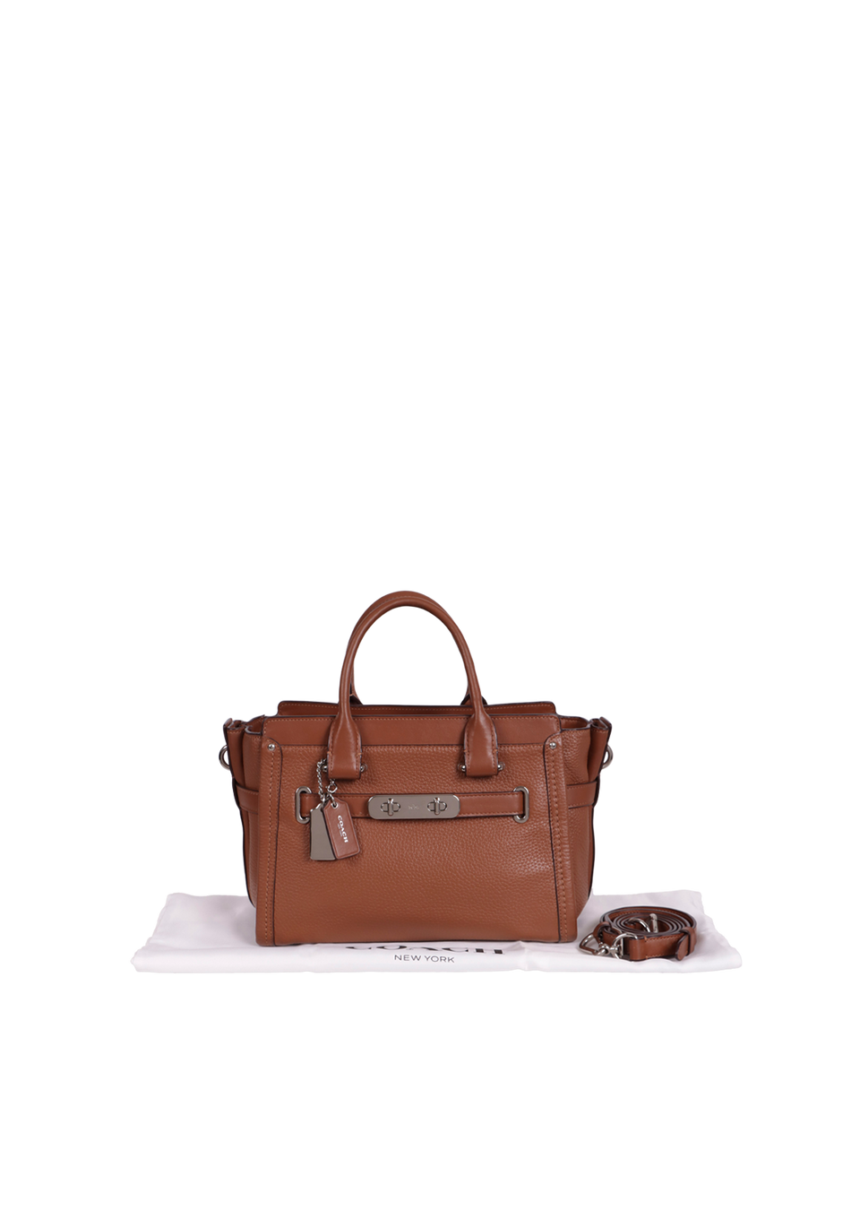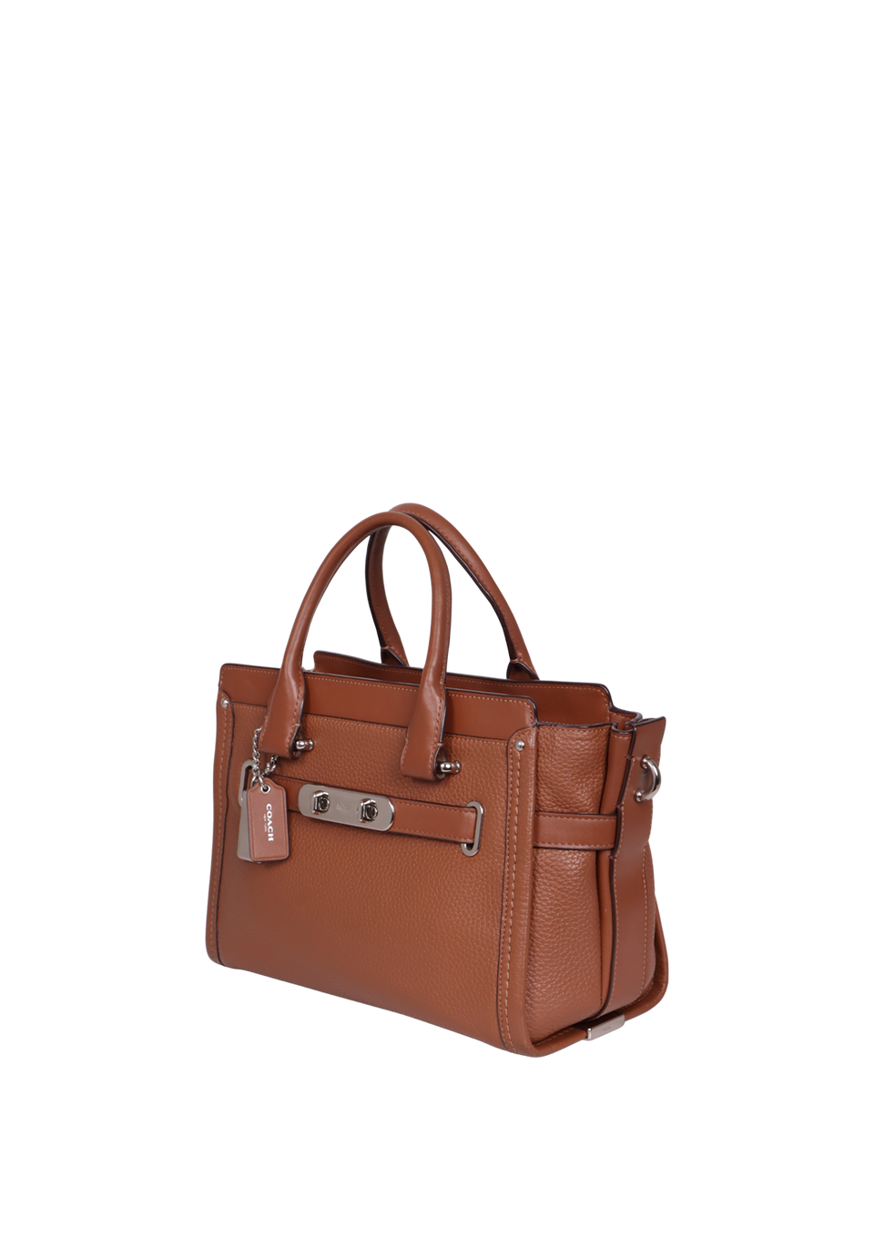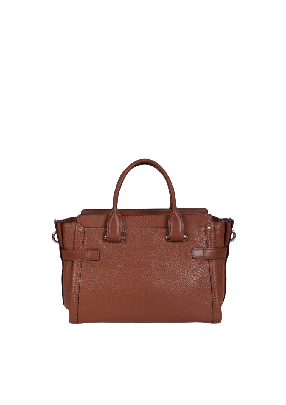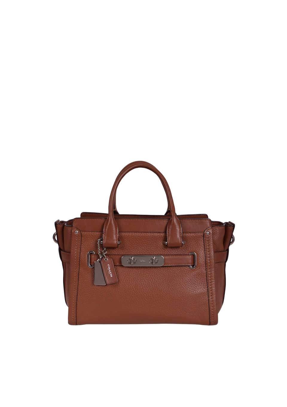 Bom, com aparência de usado. Apresenta leves desgastes, manchas escurecidas e marcas de uso pelo couro, especialmente nos cantos da base, pequenas marcas de uso nas ferragens do detalhe frontal, nos detalhes das alças, nos puxadores dos cursores e na tag de metal da marca, leves deformidades pela estrutura, principalmente na alça de mão e na parte inferior do lado direito frontal, pequenas fissuras nas selagens das extremidades superiores laterais e levíssimas manchas de uso pelo forro.