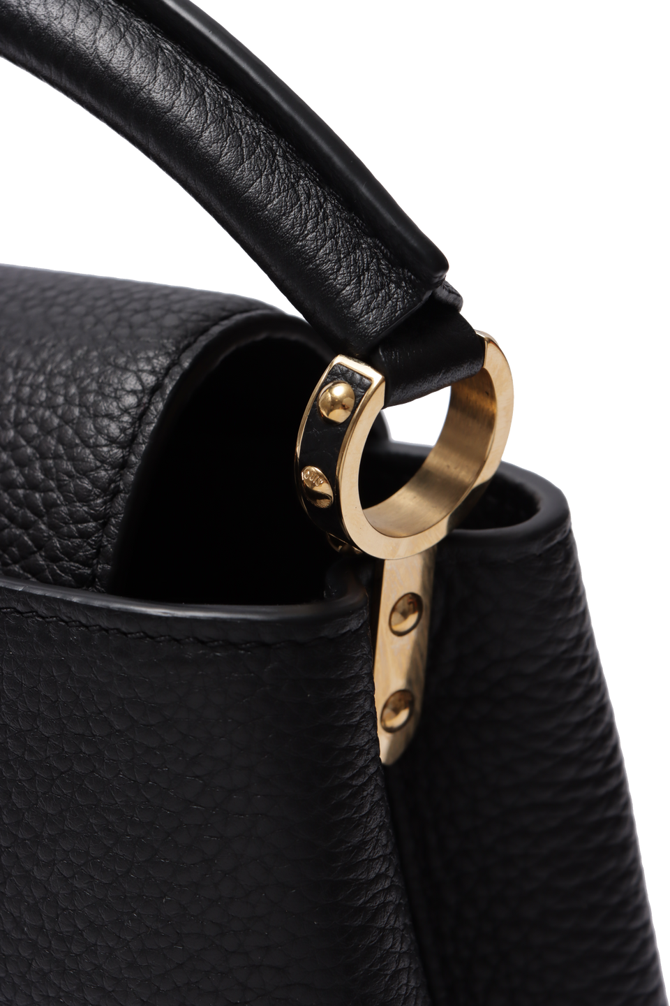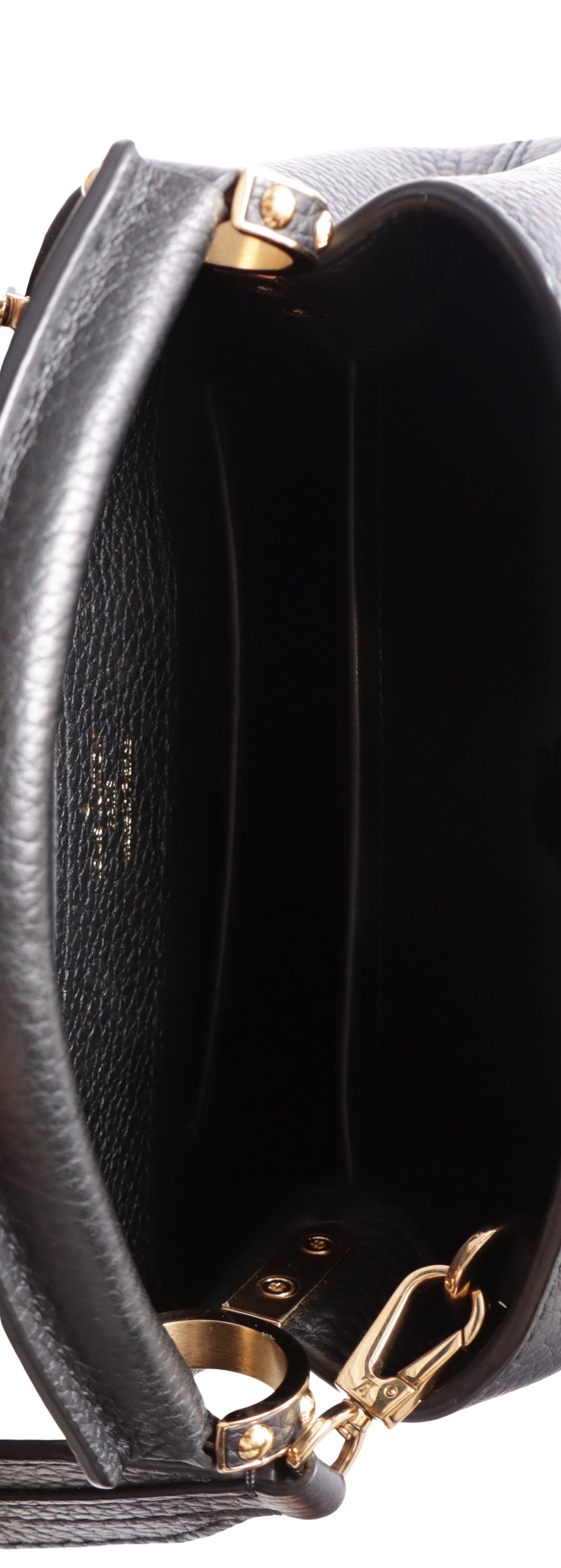 Muito bom, com aparência de seminovo. Apresenta levíssimos desgastes pelo couro, principalmente na alça de mão e no detalhe da aba, levíssimas marcas de uso e descolorações nas ferragens, especialmente na logo e nos acabamentos da base, mínimas fissuras nas selagens dos acabamentos do lado esquerdo da alça de mão e mínimos desgastes e marcas de uso nas partes internas.