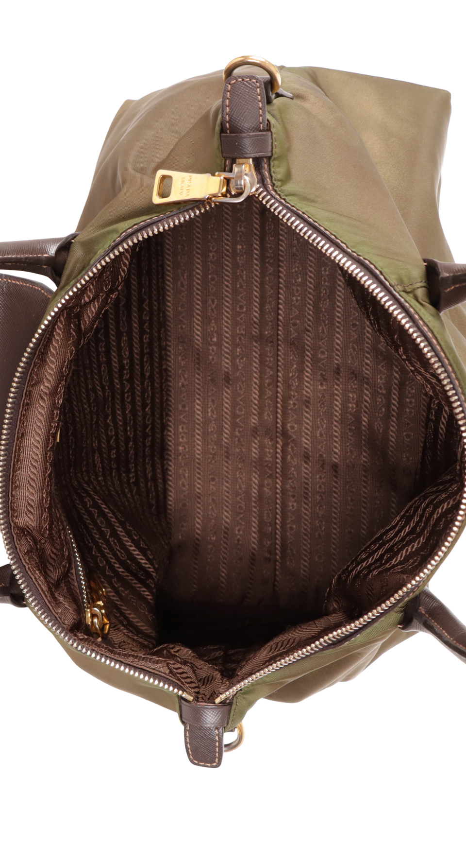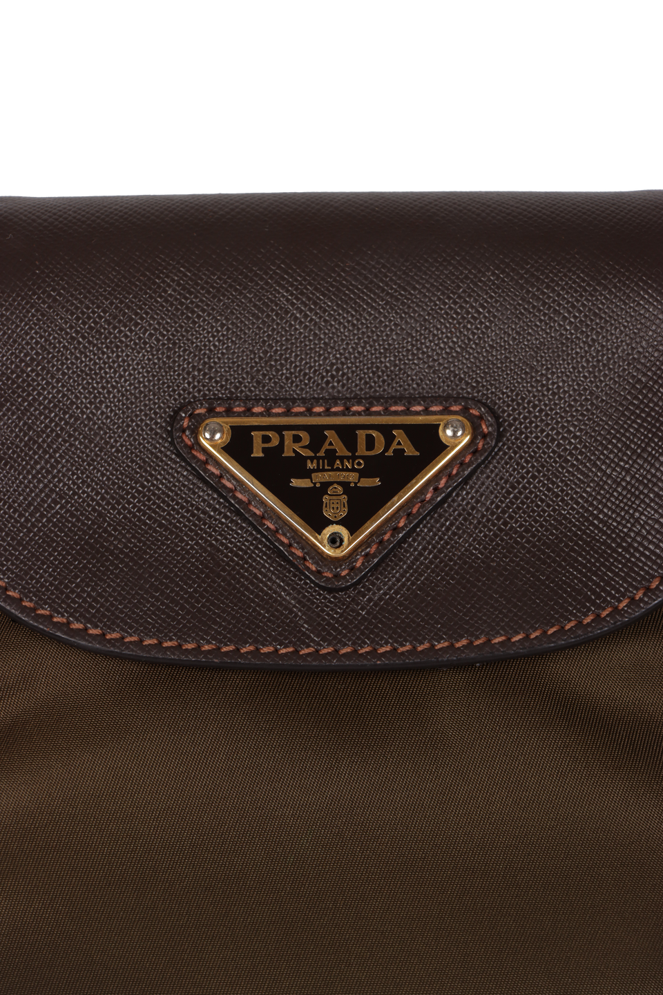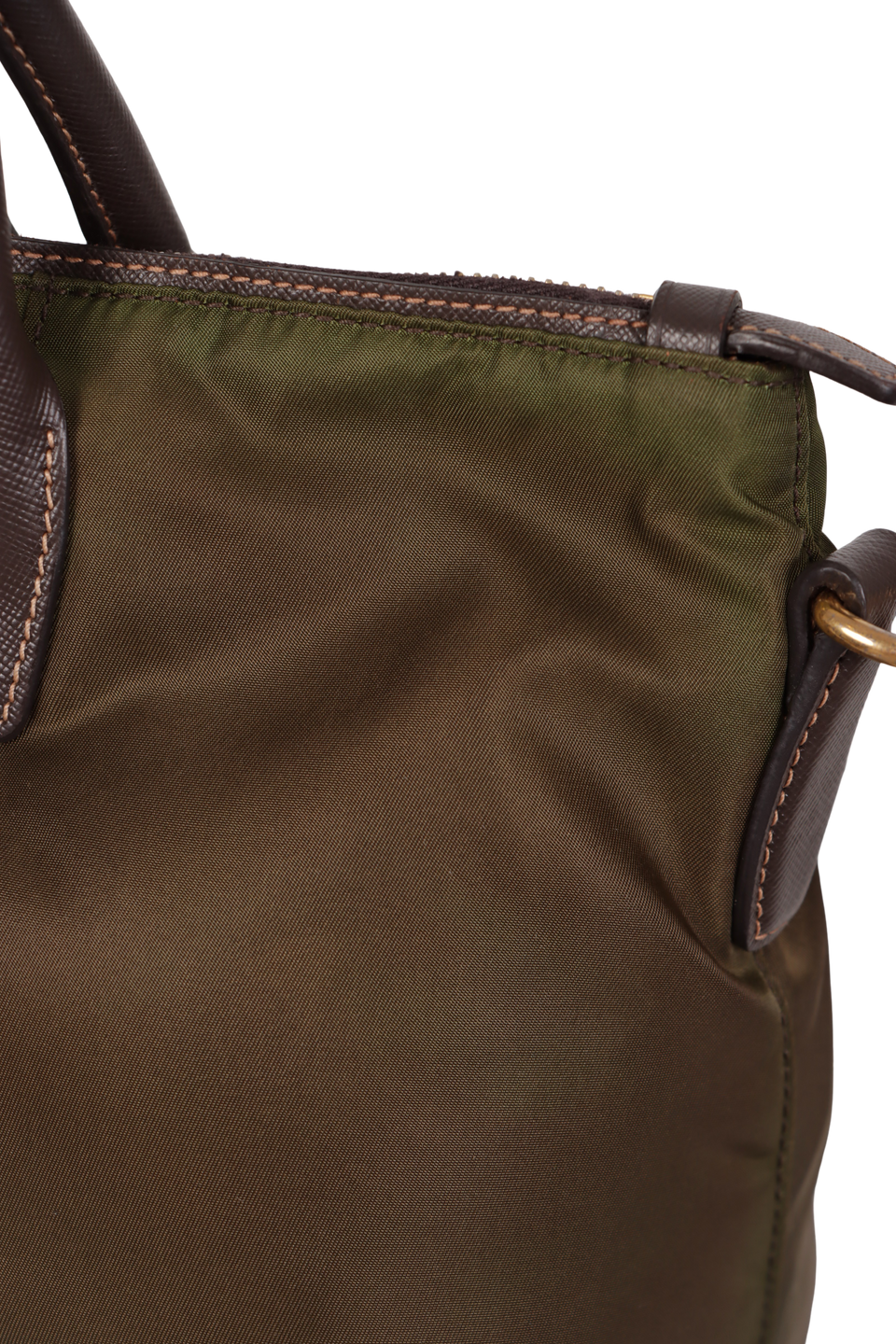 Descrição do Material: Nylon verde com detalhes em couro calfskin marrom com acabamento Saffiano