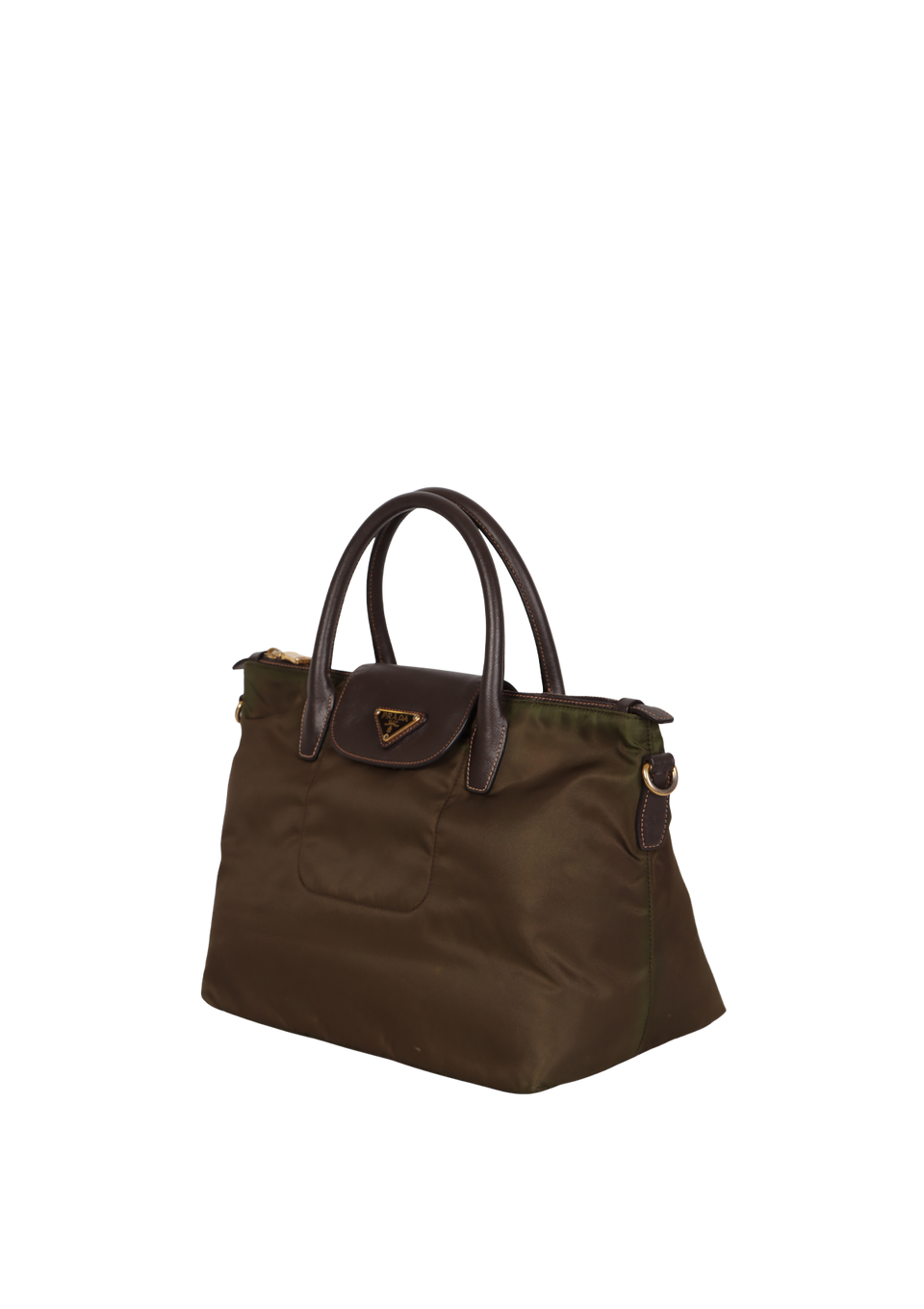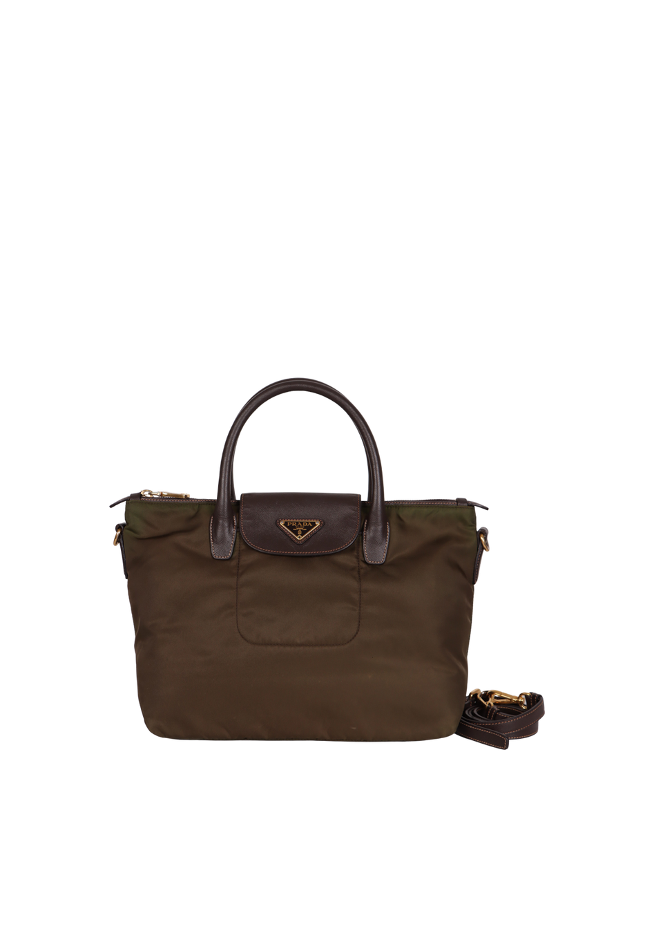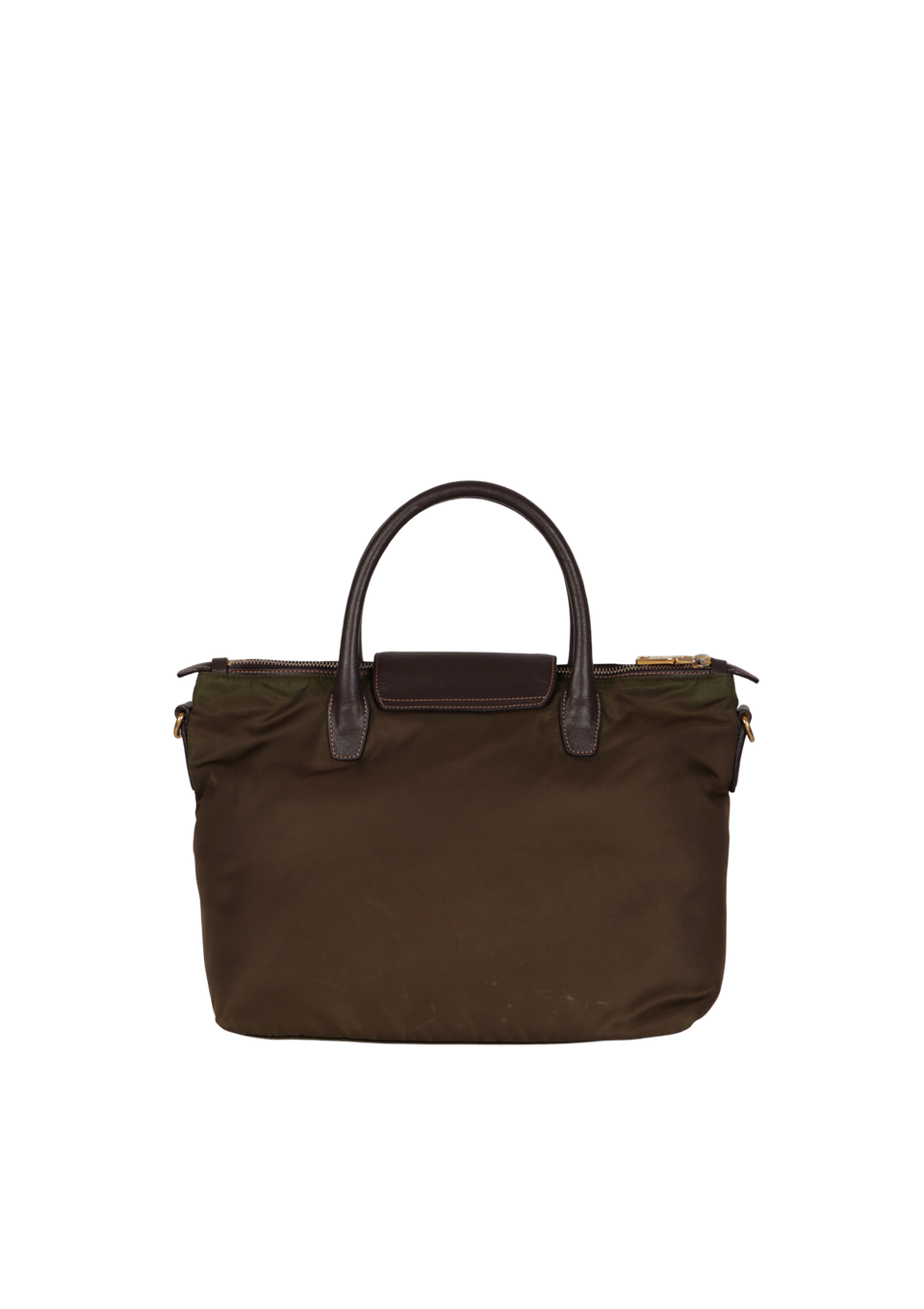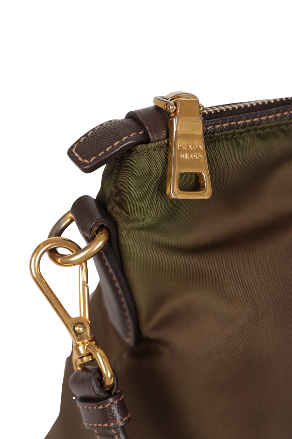 Descrição do Material: Nylon verde com detalhes em couro calfskin marrom com acabamento Saffiano