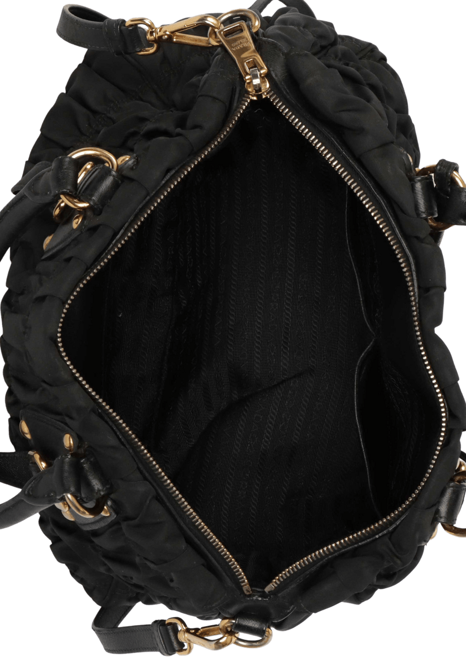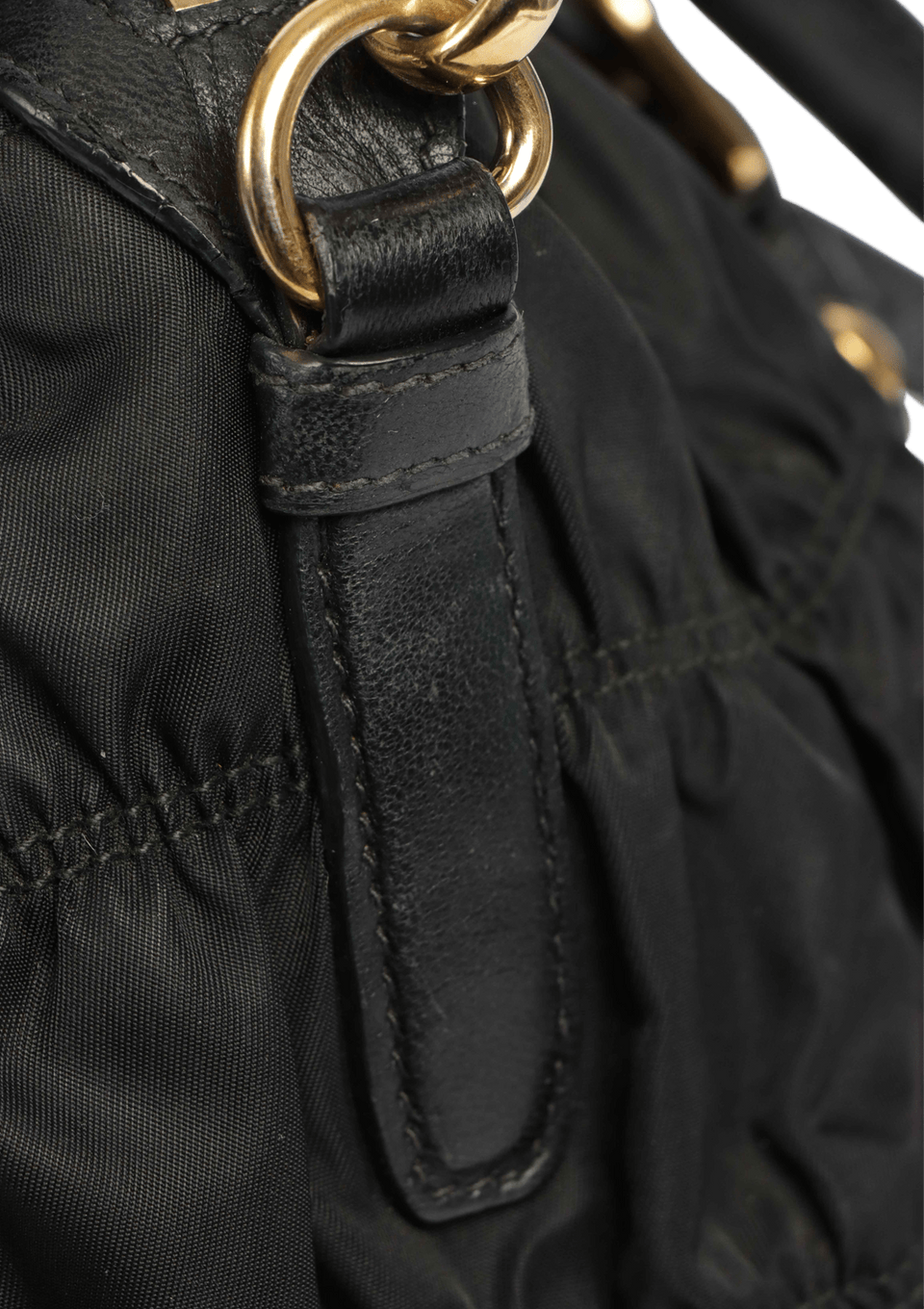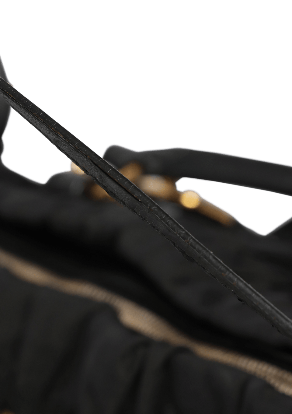 Condição: Regular. Apresenta desgastes e pequenas manchas nas alças e em todos os demais acabamentos em couro, desgastes, fissuras e descolamentos nas selagens das alças e dos acabamentos superiores, manchas pelo tecido da parte externa e riscos, desgastes e oxidações nas ferragens.