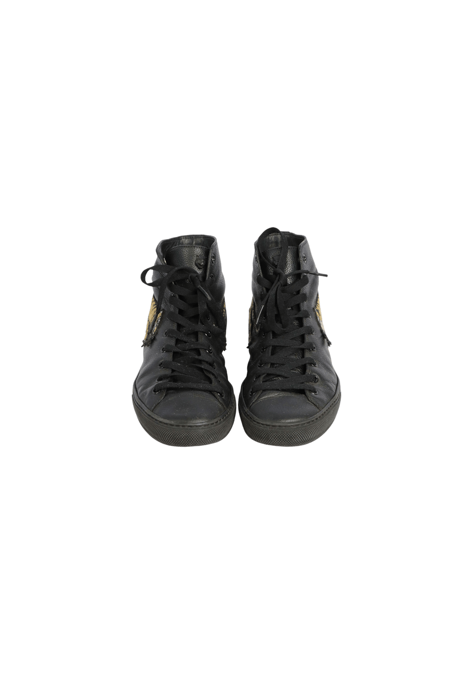 Condição: Regular. Apresenta severos desgastes no couro das palmilhas apresentando deformidade e fissuras pelo couro, riscos e cor com aspecto opaco na borracha, fios puxados na aplicação do tigre, leve descolamento entre a borracha e ouro nas laterais.