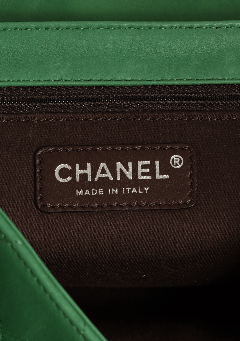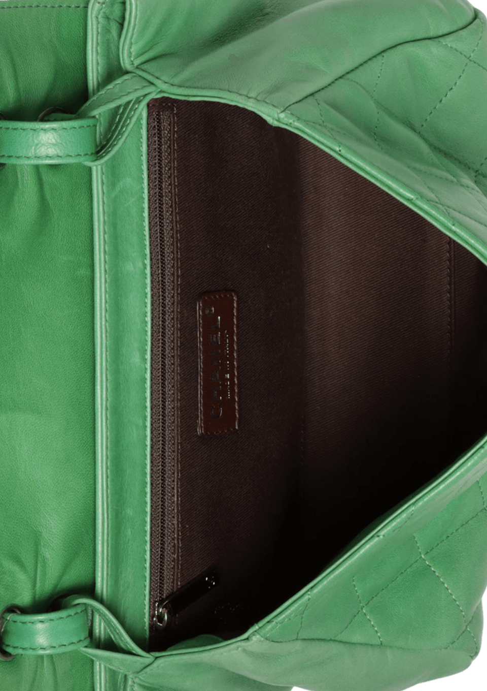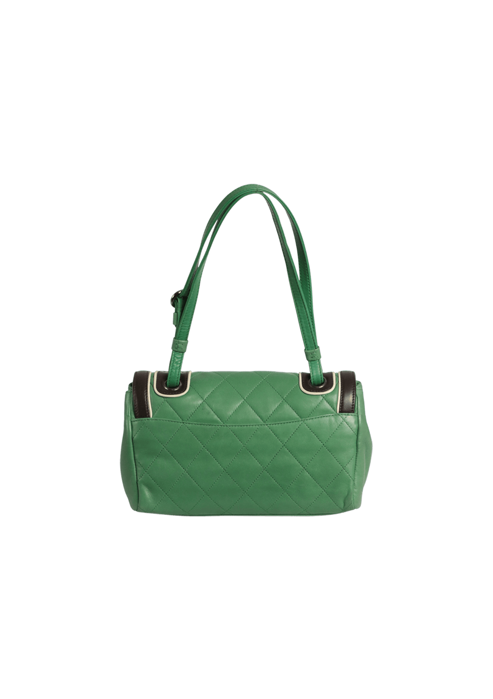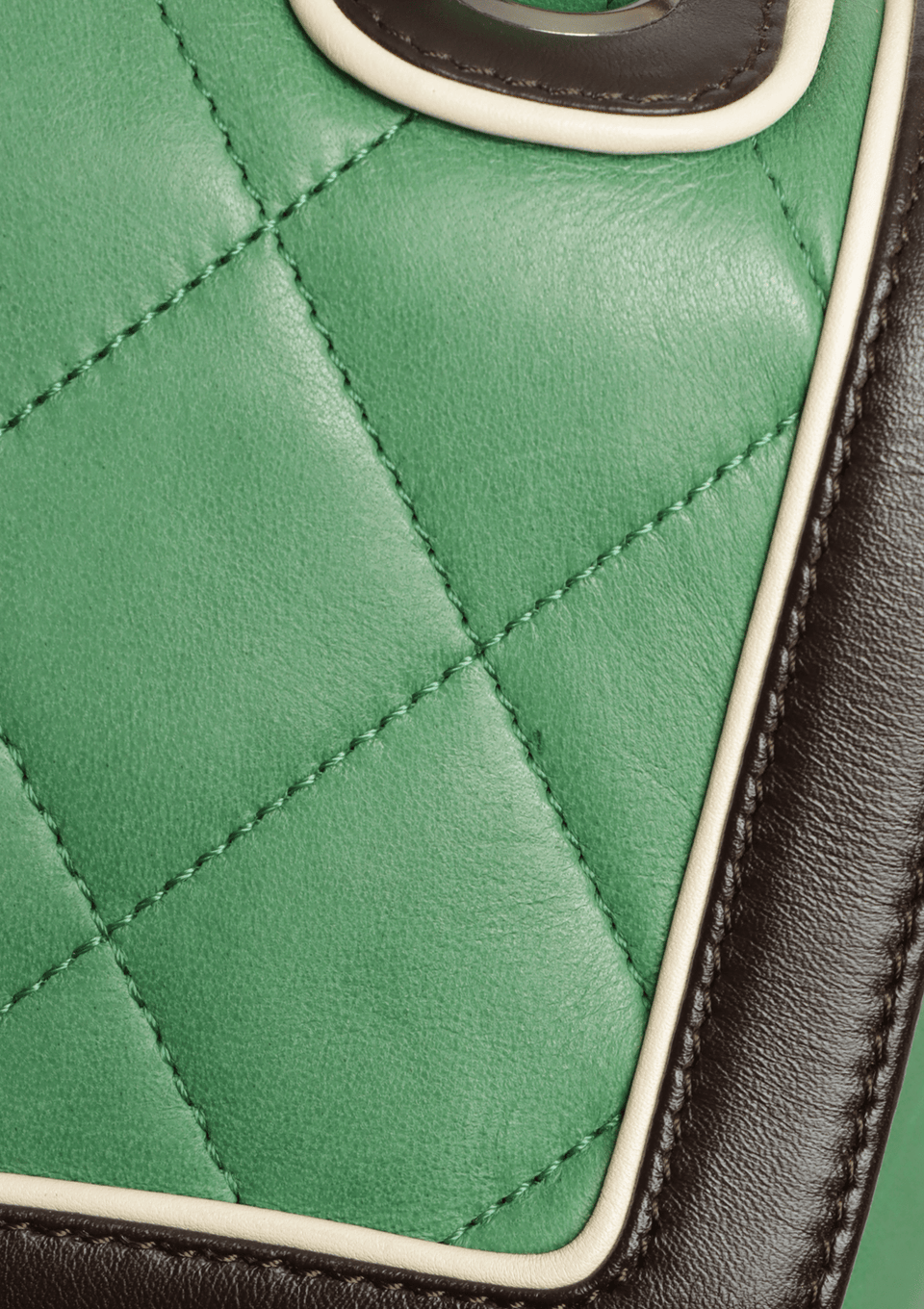 - Couro lambskin matelassê verde com detalhes marrom;