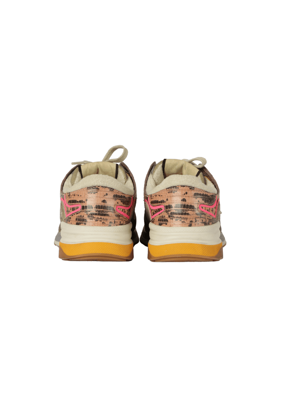 - Camurça bege, couro calfskin prateado, couro com textura croco bege alaranjado, tecido amarelo e cinza e borracha branca, bege, rosa, cinza e amarelo;