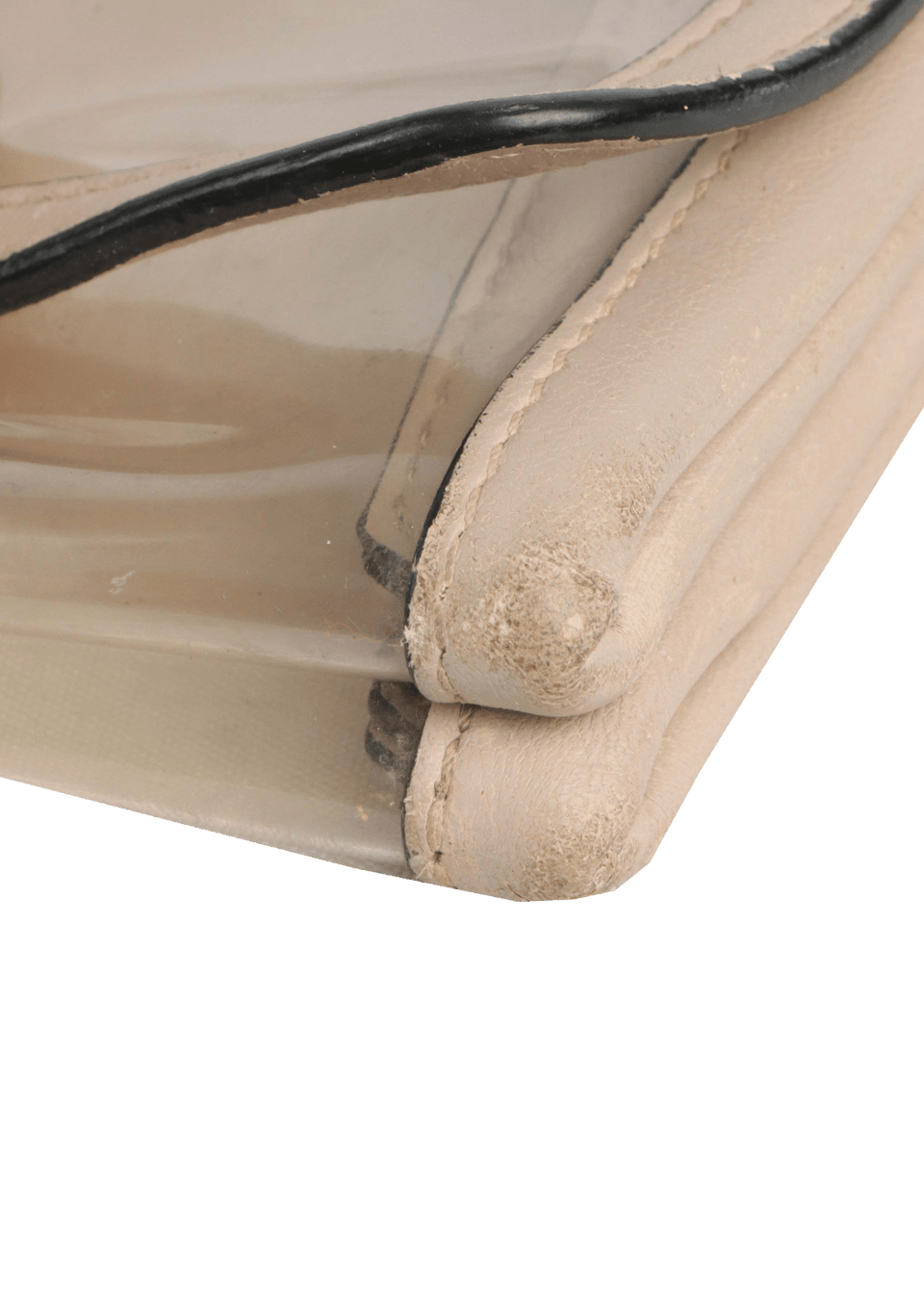 Condição: Regular. Apresenta severa deformação na aba de fechamento, desgastes de cor e no couro dos quatro cantos da base, fissuras no couro e risco de caneta na parte interna, riscos e coloração amarelada no pvc, craquelamento nas selagens de acabamento superiores e risco e oxidações nas ferragens.