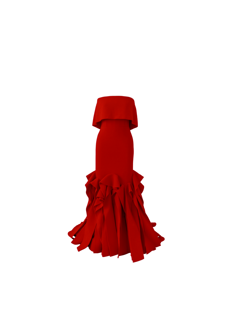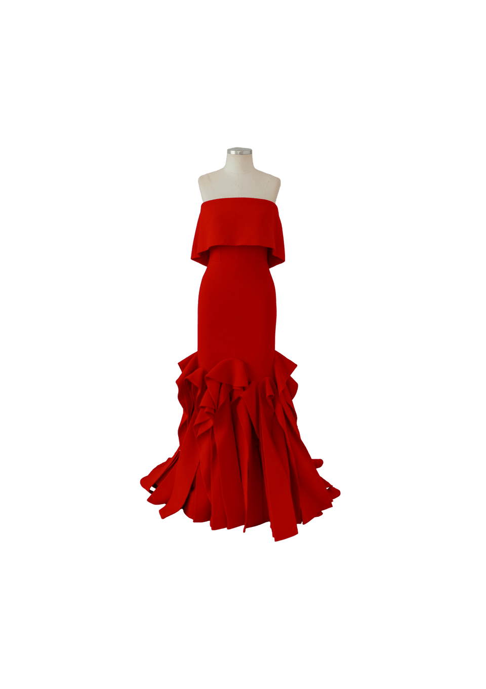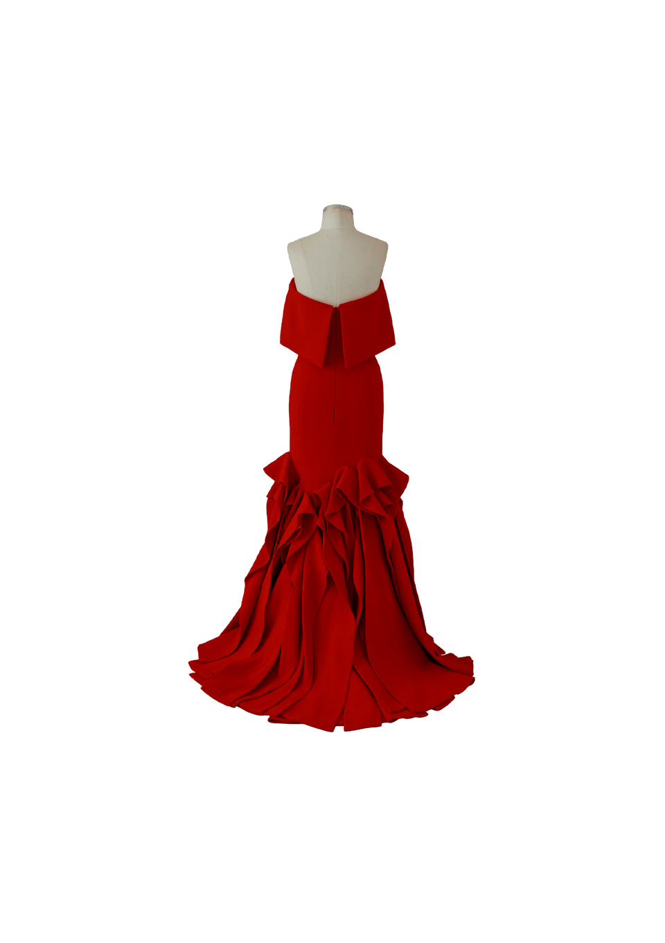Descrição: Vestido longo com corte semi sereia, base do busto reta com toma, detalhes dramáticos e assimétricos na saia e fechamento por cursor.