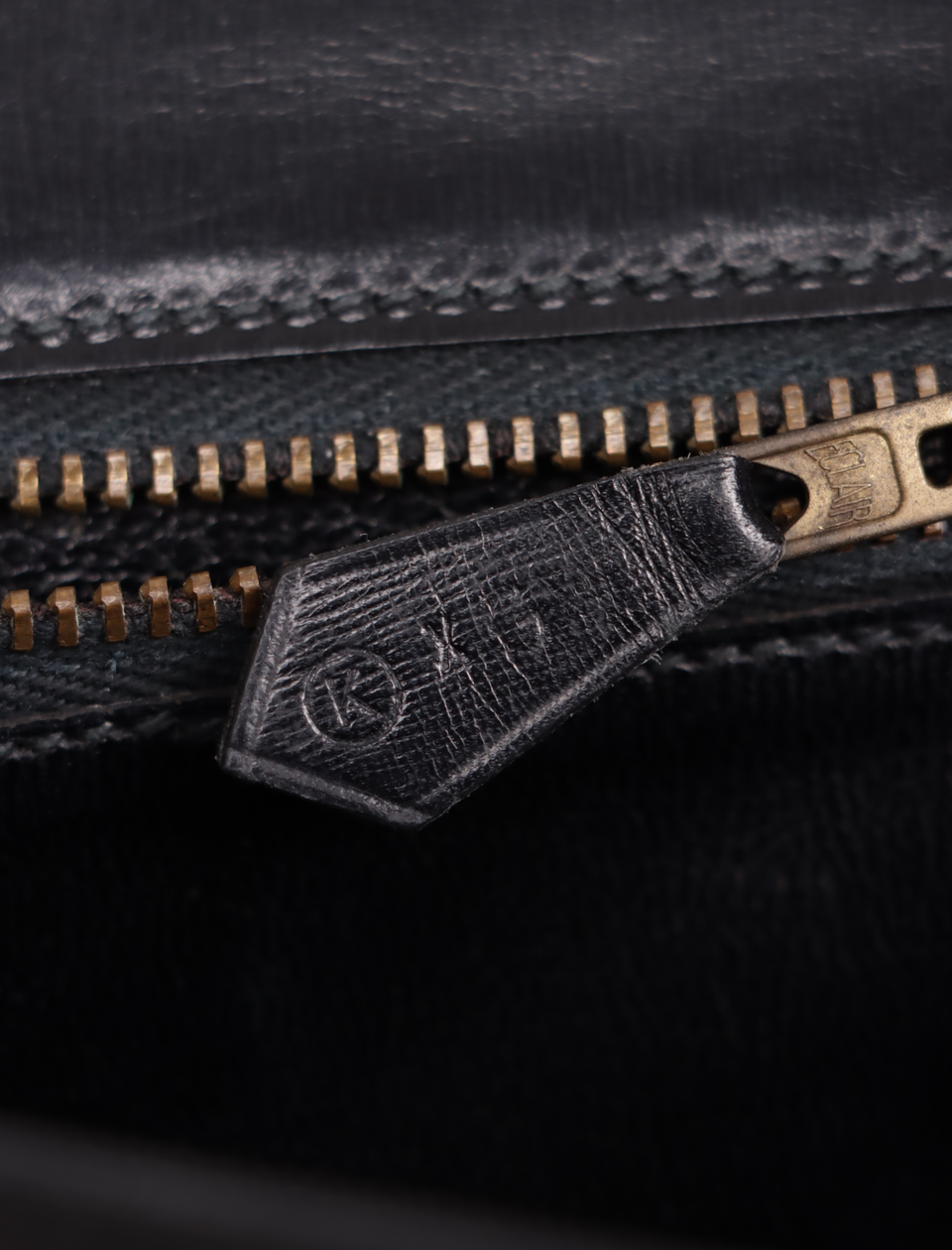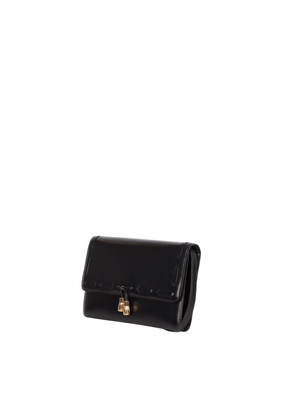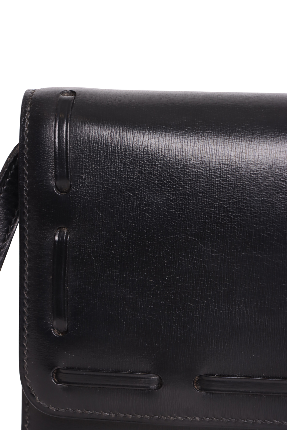 Bom, com aparência de usado. Apresenta leves marcas de uso e manchas esbranquiçadas pelo couro, especialmente na parte central frontal da aba, na partes inferior frontal e na parte central de trás, pequenas marcas de uso e descolorações nas ferragens dos detalhes frontais e no fecho, pequenas aberturas, fissuras e desgastes nas selagens da alça, nas laterais da aba, nos cantos superiores das laterais e nos cantos da base e leves manchas esbranquiçadas e marcas de uso pelo couro interno.