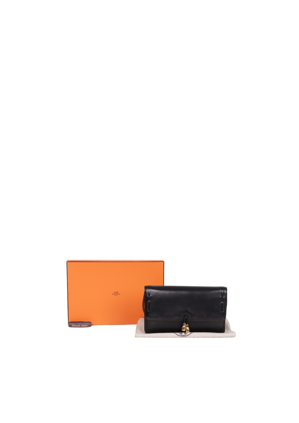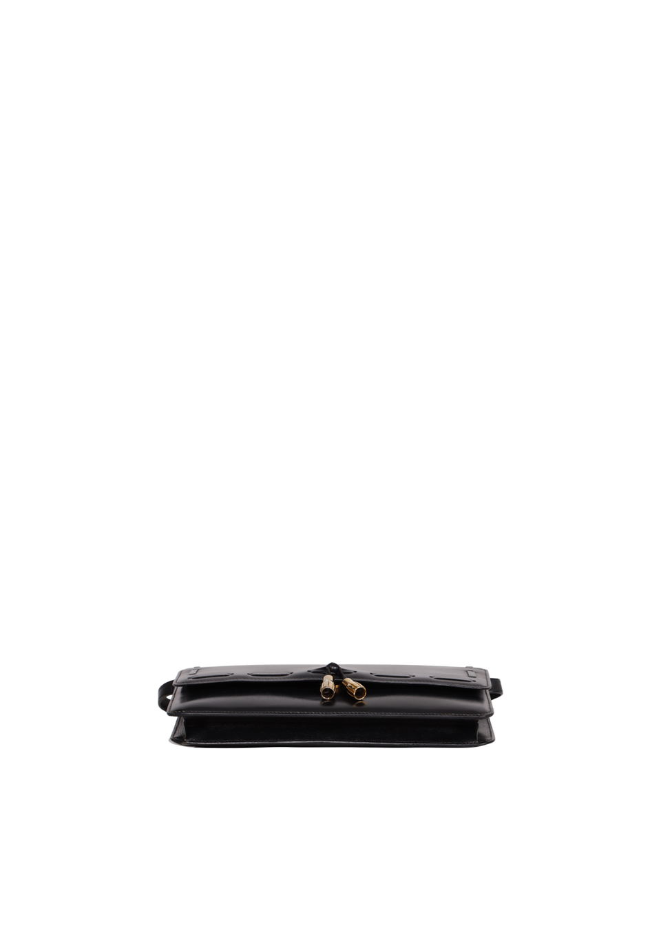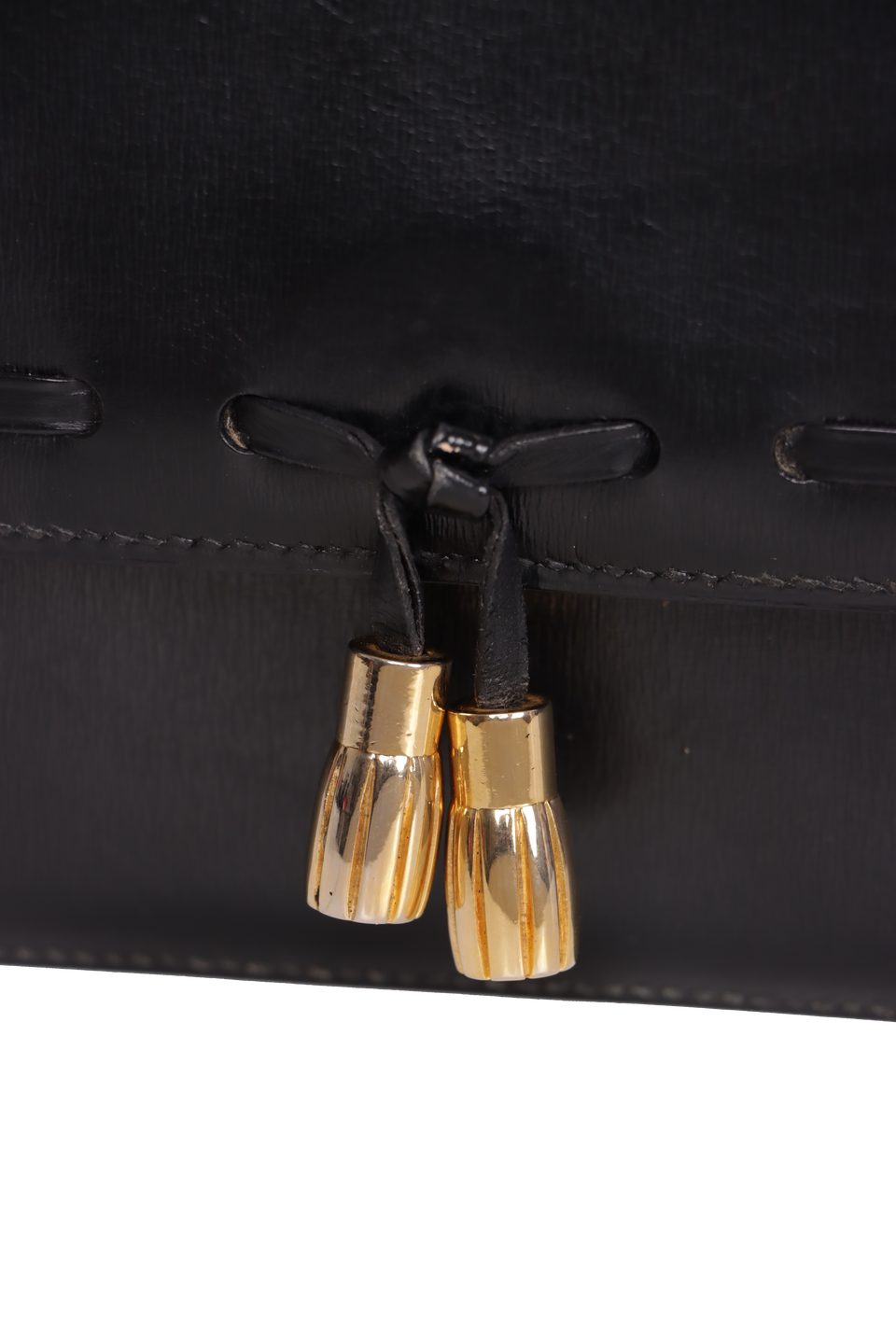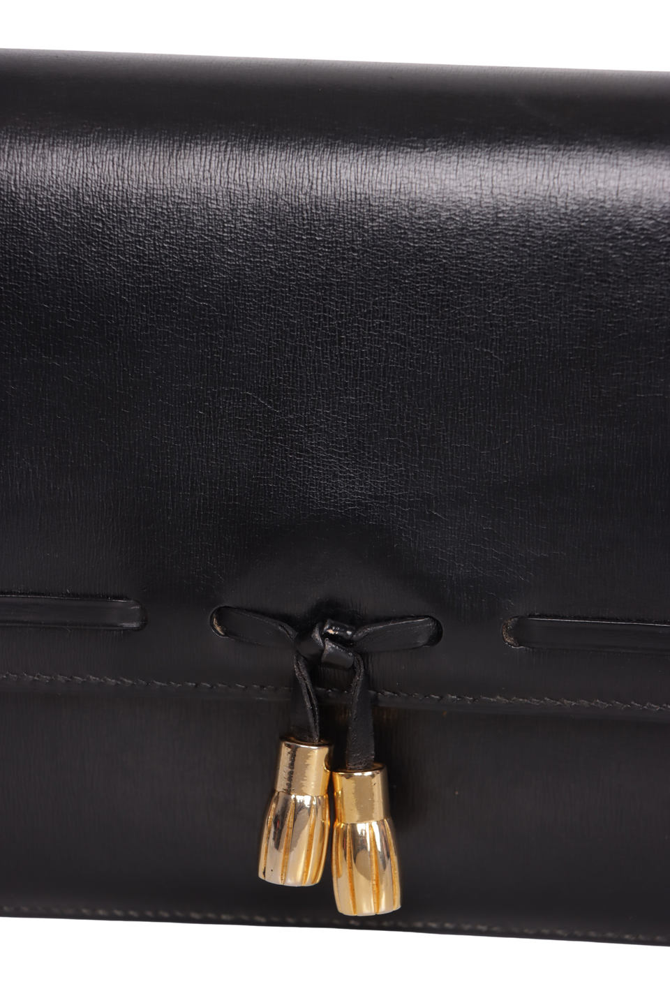 Bom, com aparência de usado. Apresenta leves marcas de uso e manchas esbranquiçadas pelo couro, especialmente na parte central frontal da aba, na partes inferior frontal e na parte central de trás, pequenas marcas de uso e descolorações nas ferragens dos detalhes frontais e no fecho, pequenas aberturas, fissuras e desgastes nas selagens da alça, nas laterais da aba, nos cantos superiores das laterais e nos cantos da base e leves manchas esbranquiçadas e marcas de uso pelo couro interno.