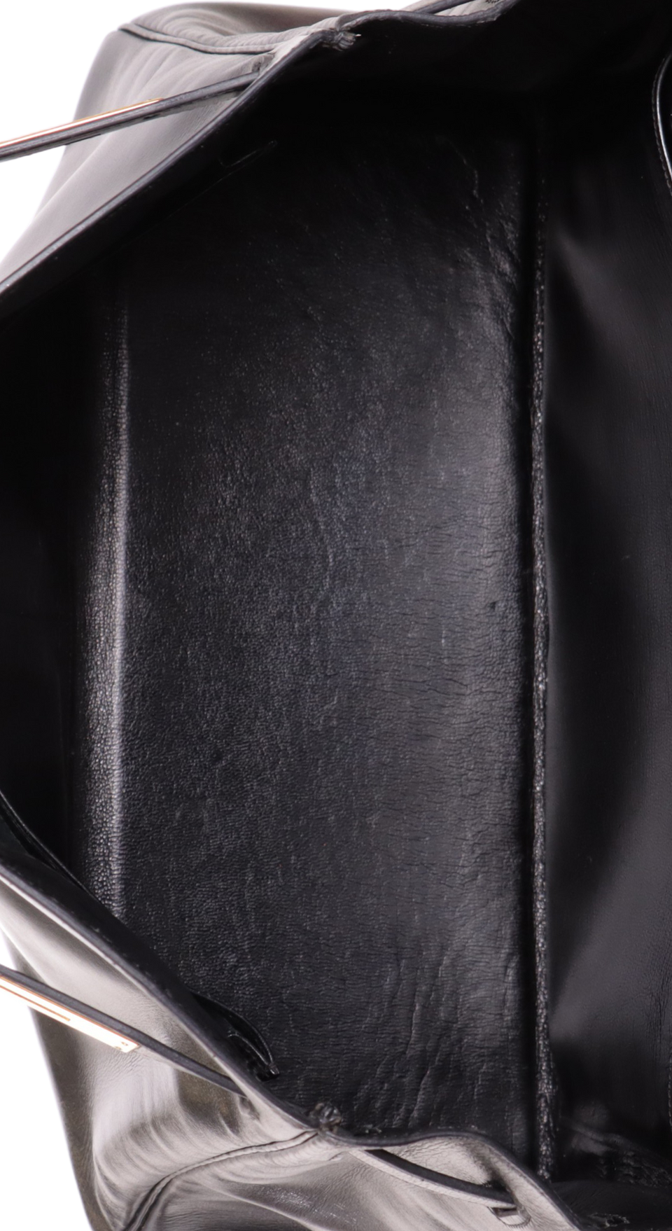 Regular. Apresenta severas deformidades pela estrutura, especialmente do lado direito frontal e do lado direito da parte de trás, consideráveis marcas de uso e oxidações nas ferragens do fecho e nos detalhes da alça, notáveis fissuras, marcas de uso, manchas esbranquiçadas e desgastes pelo couro, principalmente nos cantos superiores, nas extremidades da base, na parte superior frontal e parte central de trás, severas fissuras, aberturas e degastes nas selagens da alça, nas laterais da aba e nas extremidades superiores, consideráveis manchas esbranquiçadas e marcas de uso pelo couro interno e notável odor de item guardado.