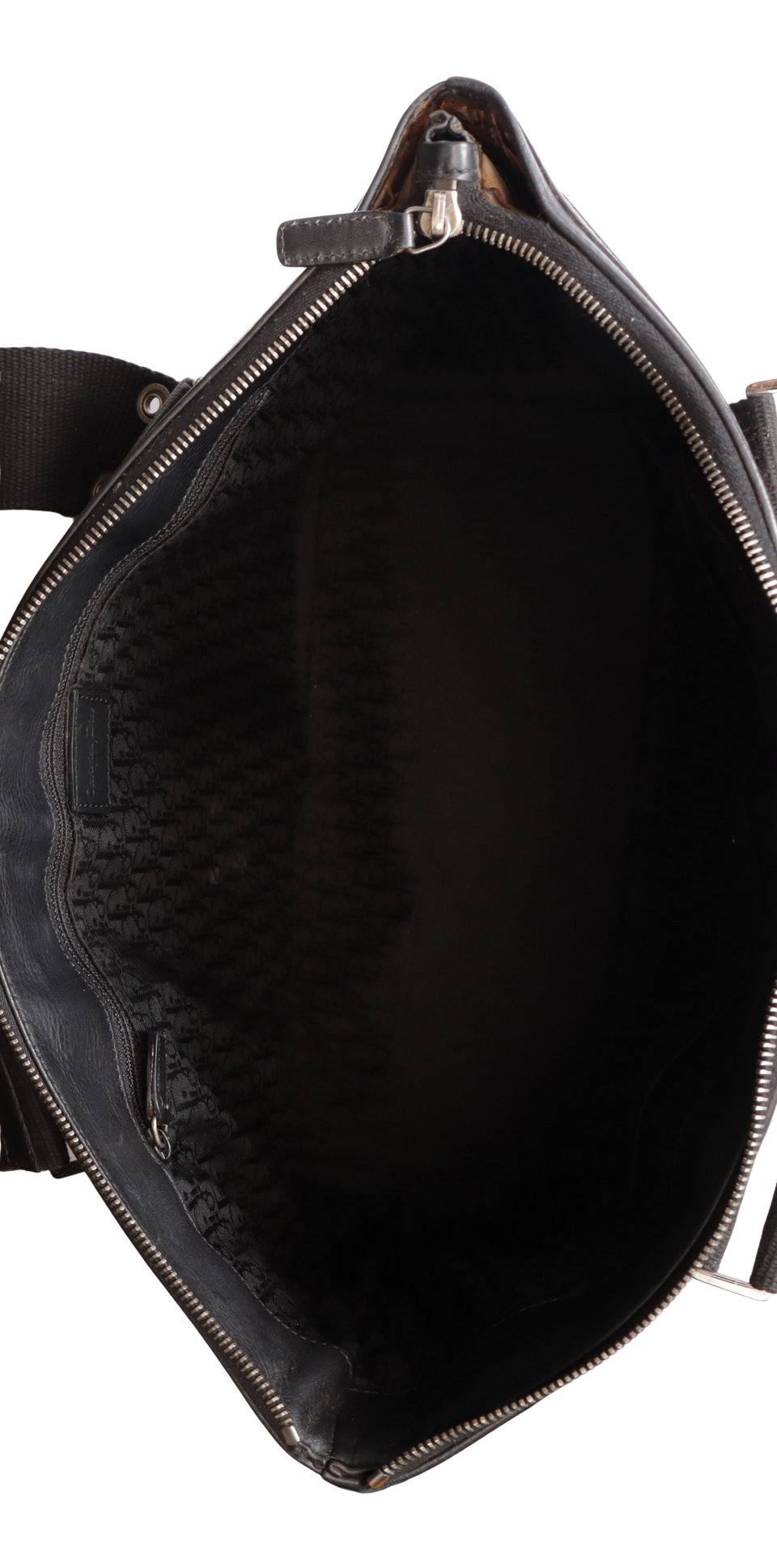 Bom, com aparência de usado. Apresenta leves marcas de uso, desgastes e manchas esbranquiçadas pelo couro, especialmente na parte frontal superior e nos acabamentos inferiores, pequenas fissuras, descolamentos e desgastes nas selagens, principalmente nos acabamentos da tira de fechamento e nos acabamentos internos das alças, leves marcas de uso, descolorações e oxidações nas ferragens, especialmente na logo, pequenos desgastes e manchas pelo tecido, principalmente nas tiras inferiores, pequena deformação na estrutura, especialmente na lateral inferior esquerda, leve odor de item armazenado e pequenas manchas esbranquiçadas e desgastes no forro, principalmente na base.