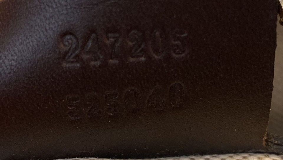 Condição: Bom, com aparência de usado. Apresenta riscos, desgastes e leves oxidações nas ferragens, manchas no forro, descolamento no couro de código interno, fissuras e leves descolamentos nas selagens das alças, pequenas manchas e desgastes na alça de ombro, manchas, desgastes e marcas de atrito nas alças de mão, mínimos desgastes pelo canvas e desgastes e fissuras pelos demais acabamentos em couro da parte externa, principalmente nos cantos da base.