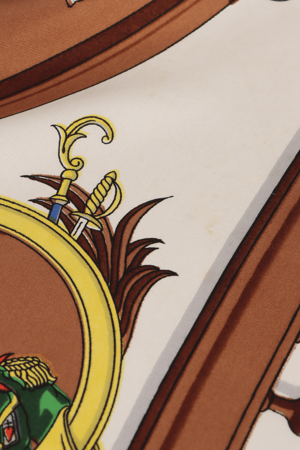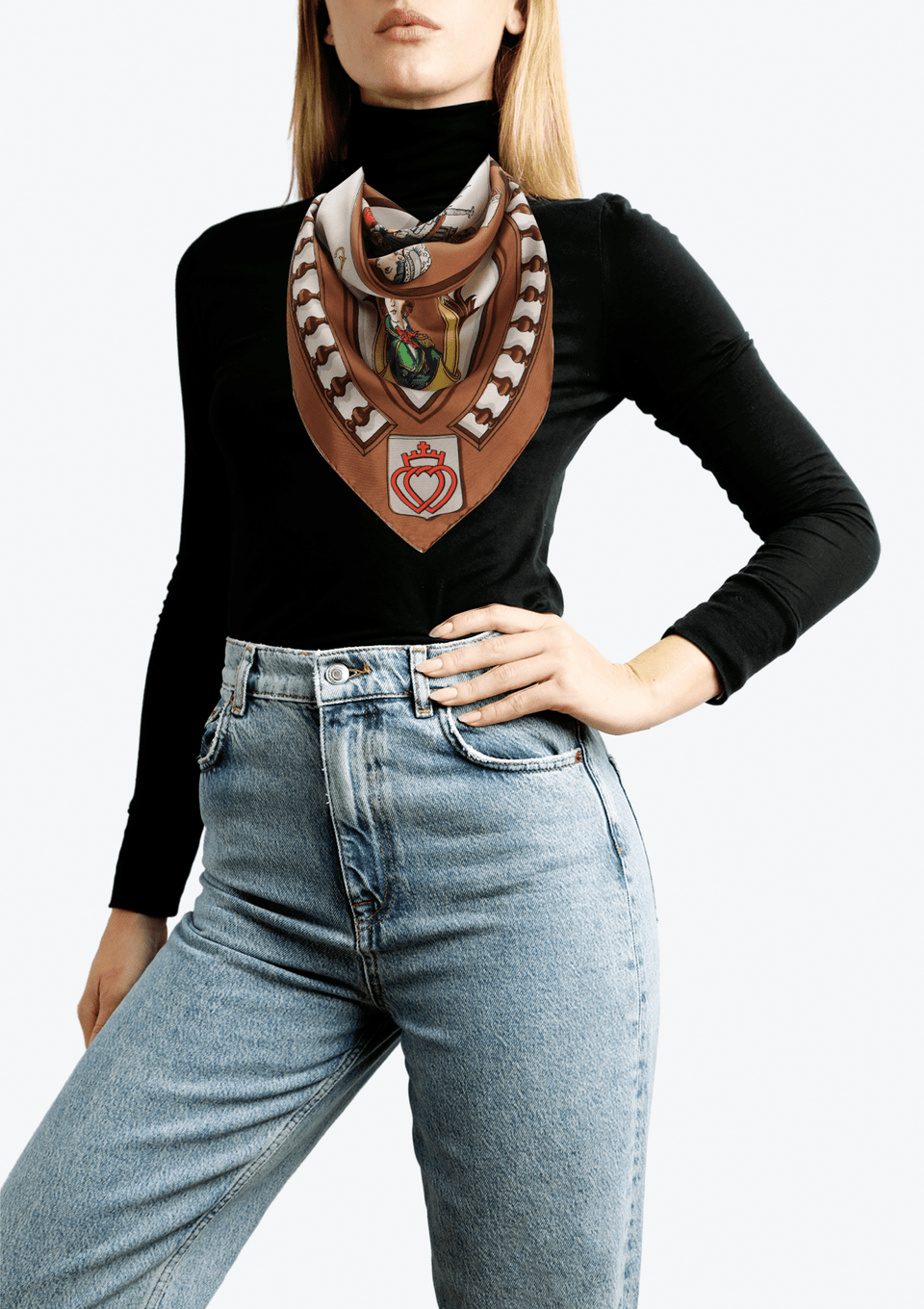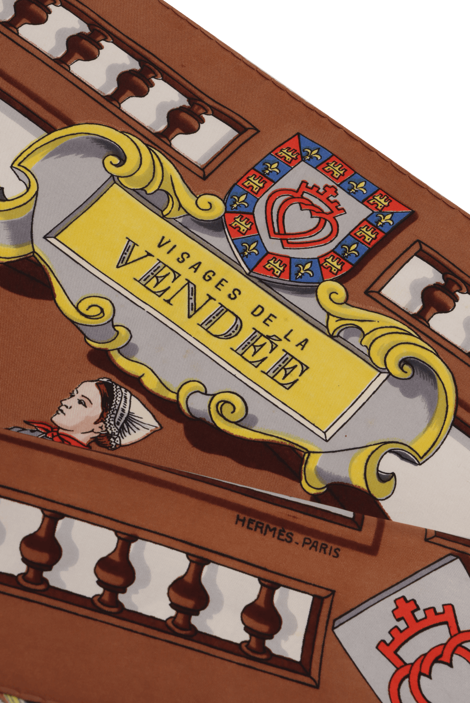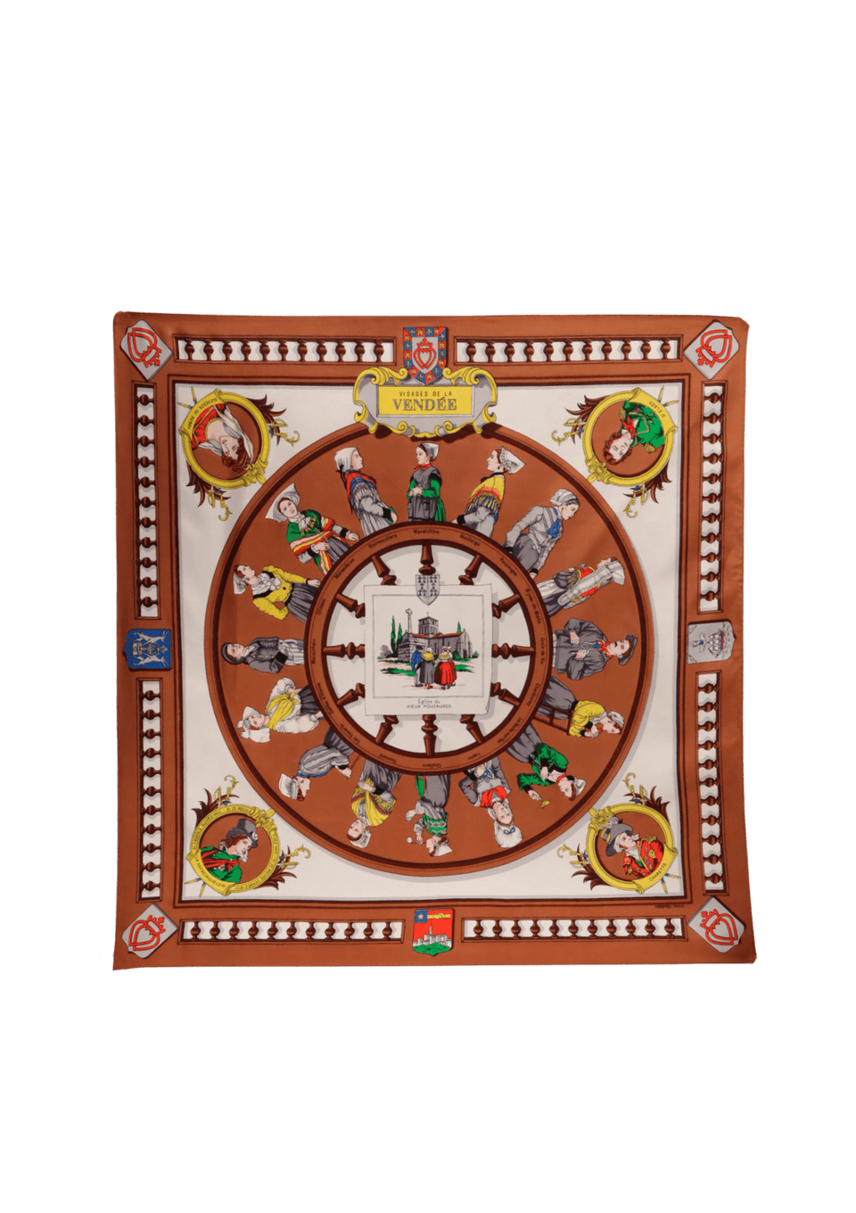Descrição do Material: Tecido marrom com estampa Visages De La Vendée com detalhes nas cores amarelo, azul e vermelho