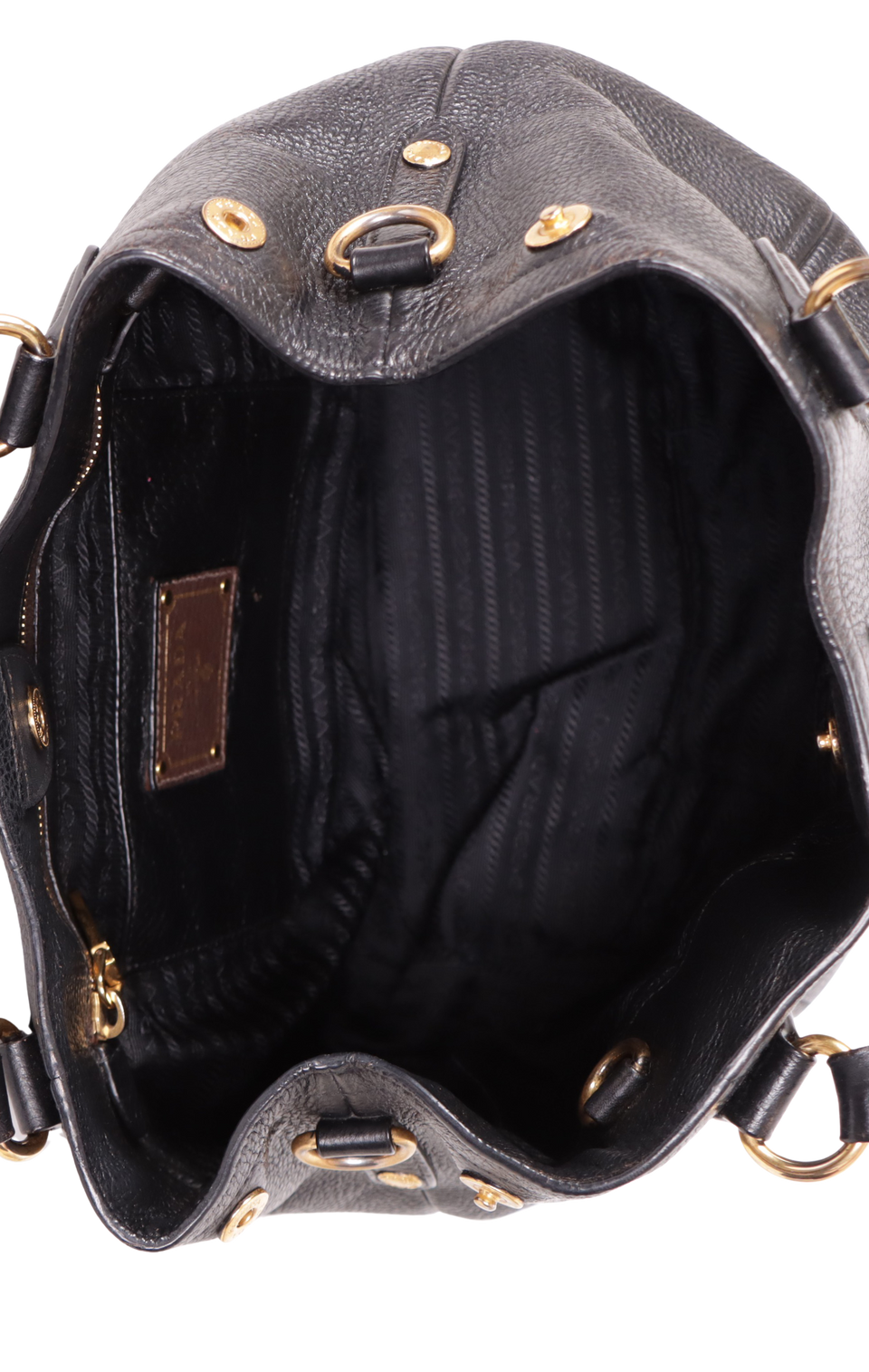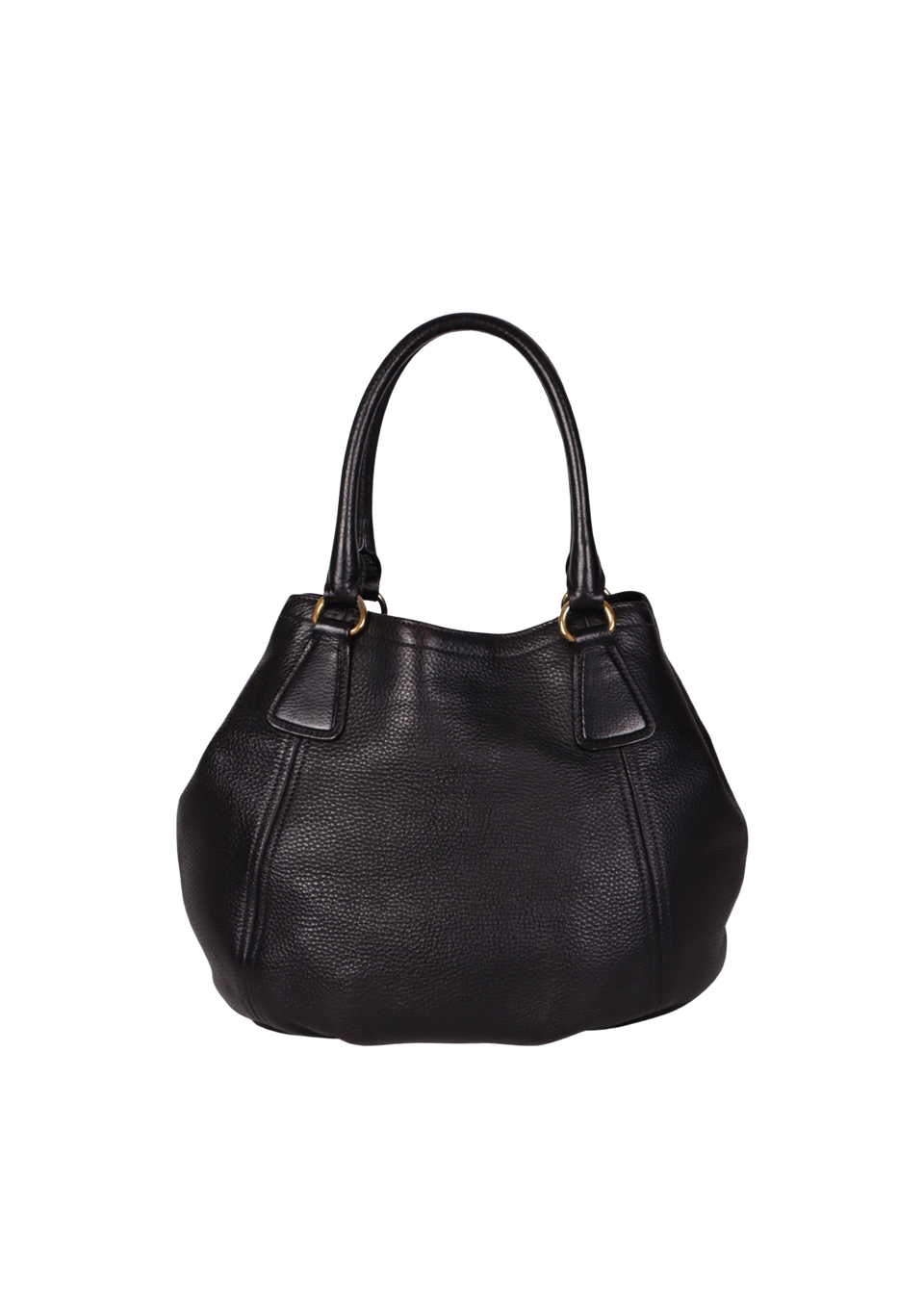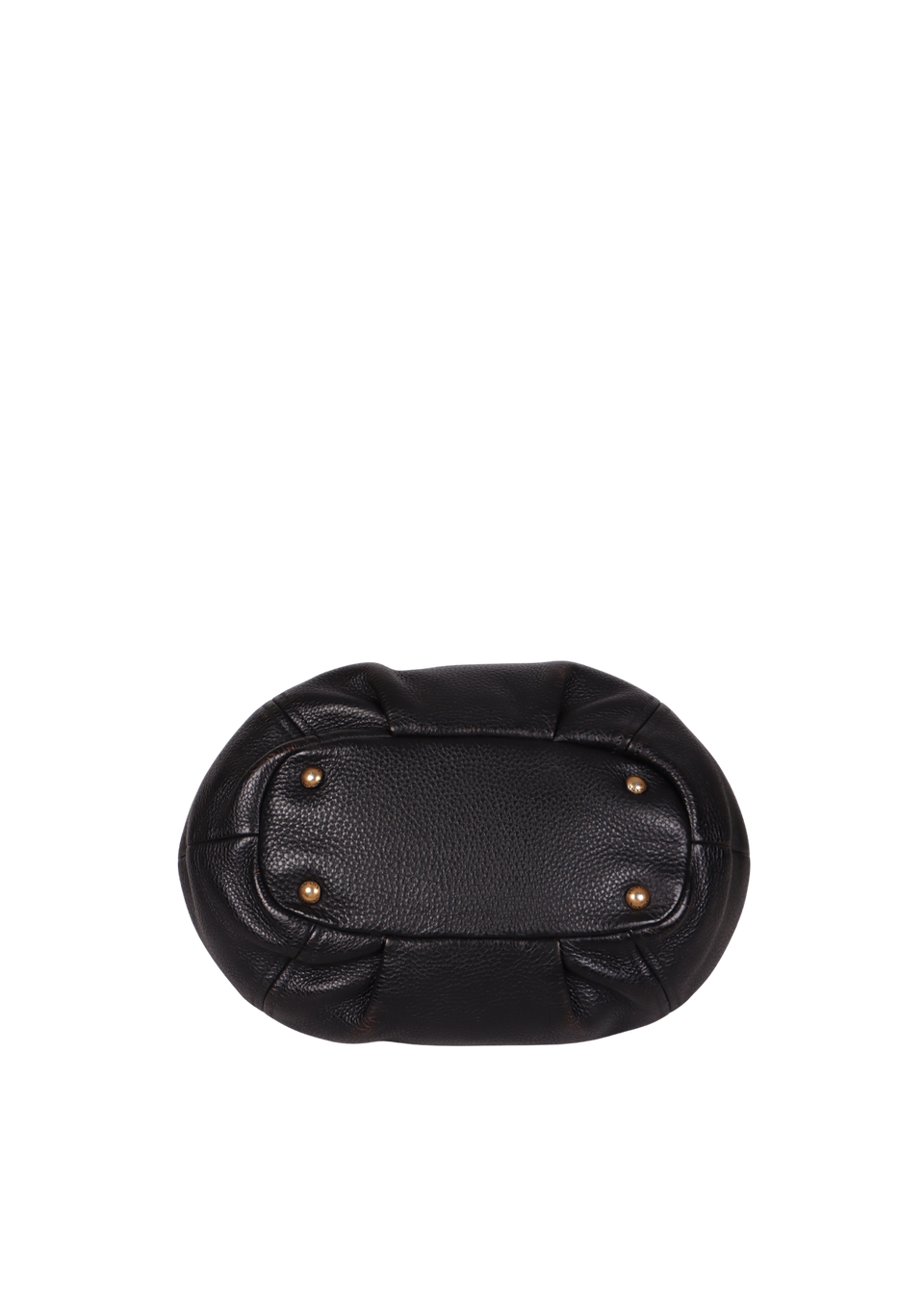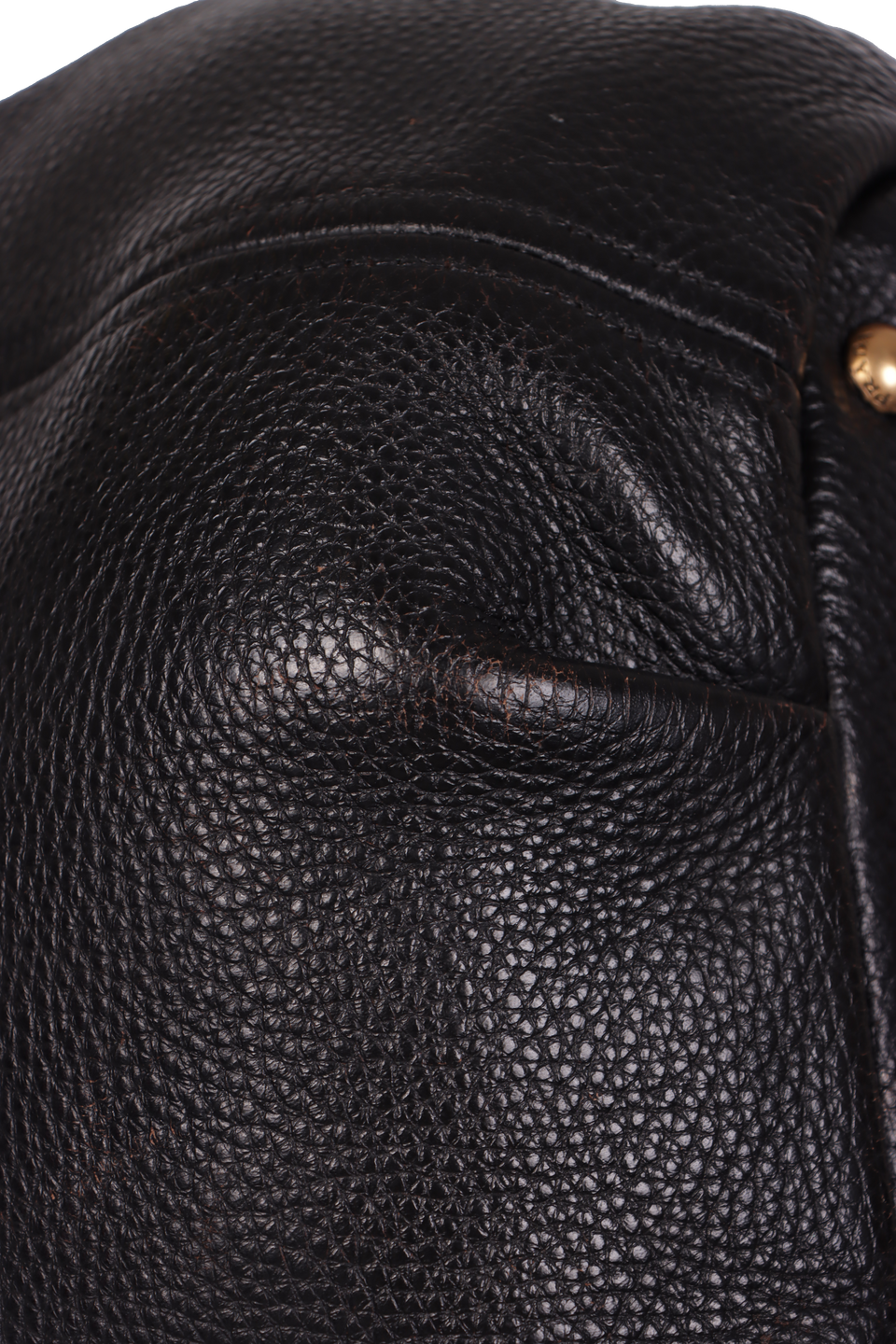 Bom, com aparência de usado. Apresenta leves marcas de uso e desgastes pelo couro, especialmente na parte inferior frontal, nas alças, nas parte superiores frontais e de trás e na parte inferior central de trás, pequenas descolorações, oxidações e marcas de uso nas ferragens da logo frontal, nos detalhes das alças, nos detalhes superiores laterais, no botão de pressão e no puxador do cursor interno, leves deformidades pela estrutura, principalmente nas partes inferiores frontais e de trás, pequenas fissuras nas selagens das alças e nas extremidades superiores e leves fios repuxados e puídos pelo forro.