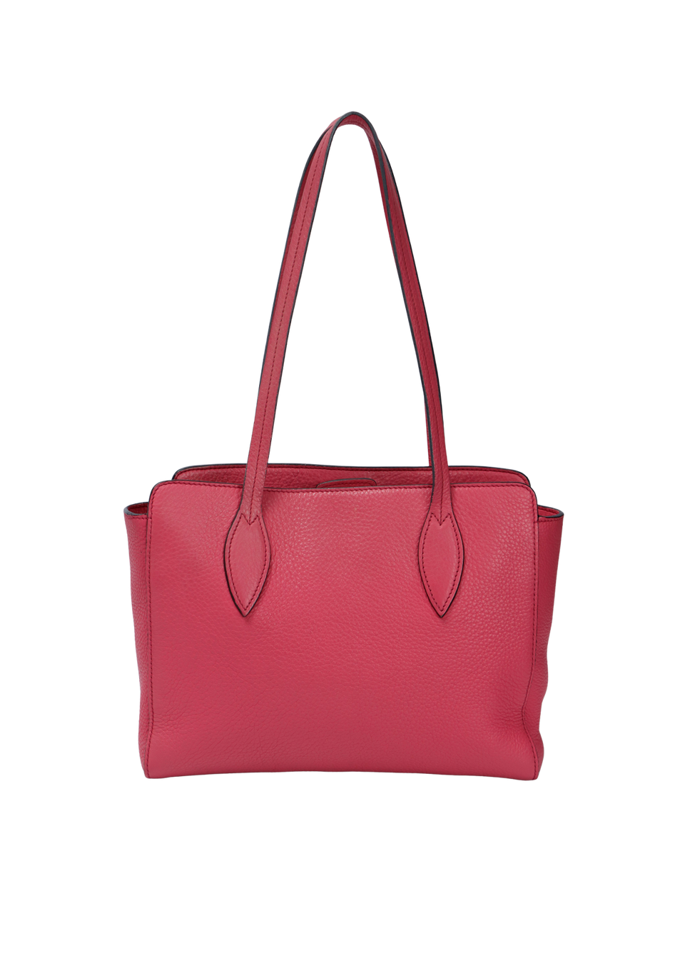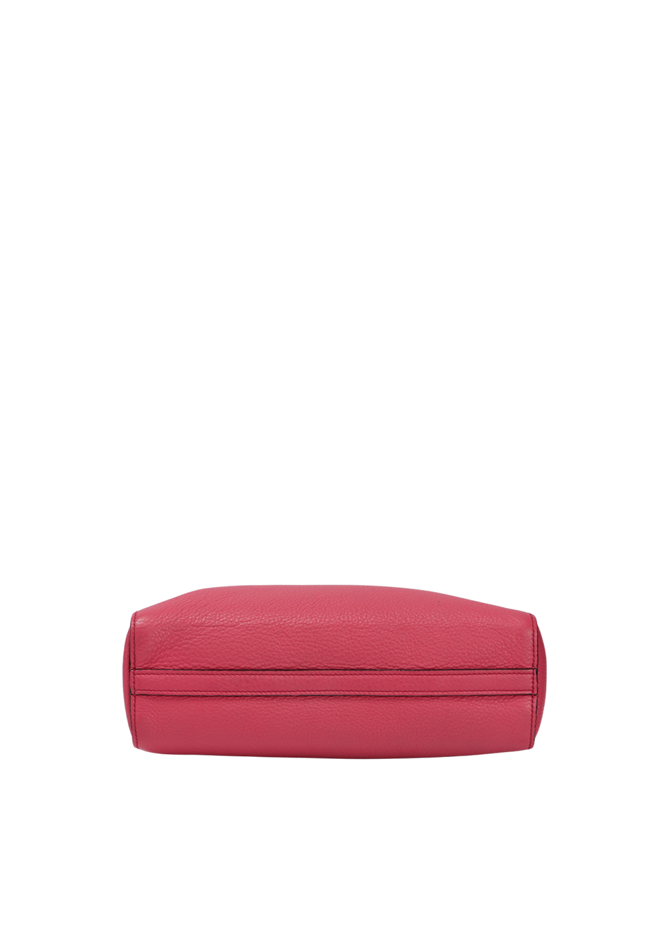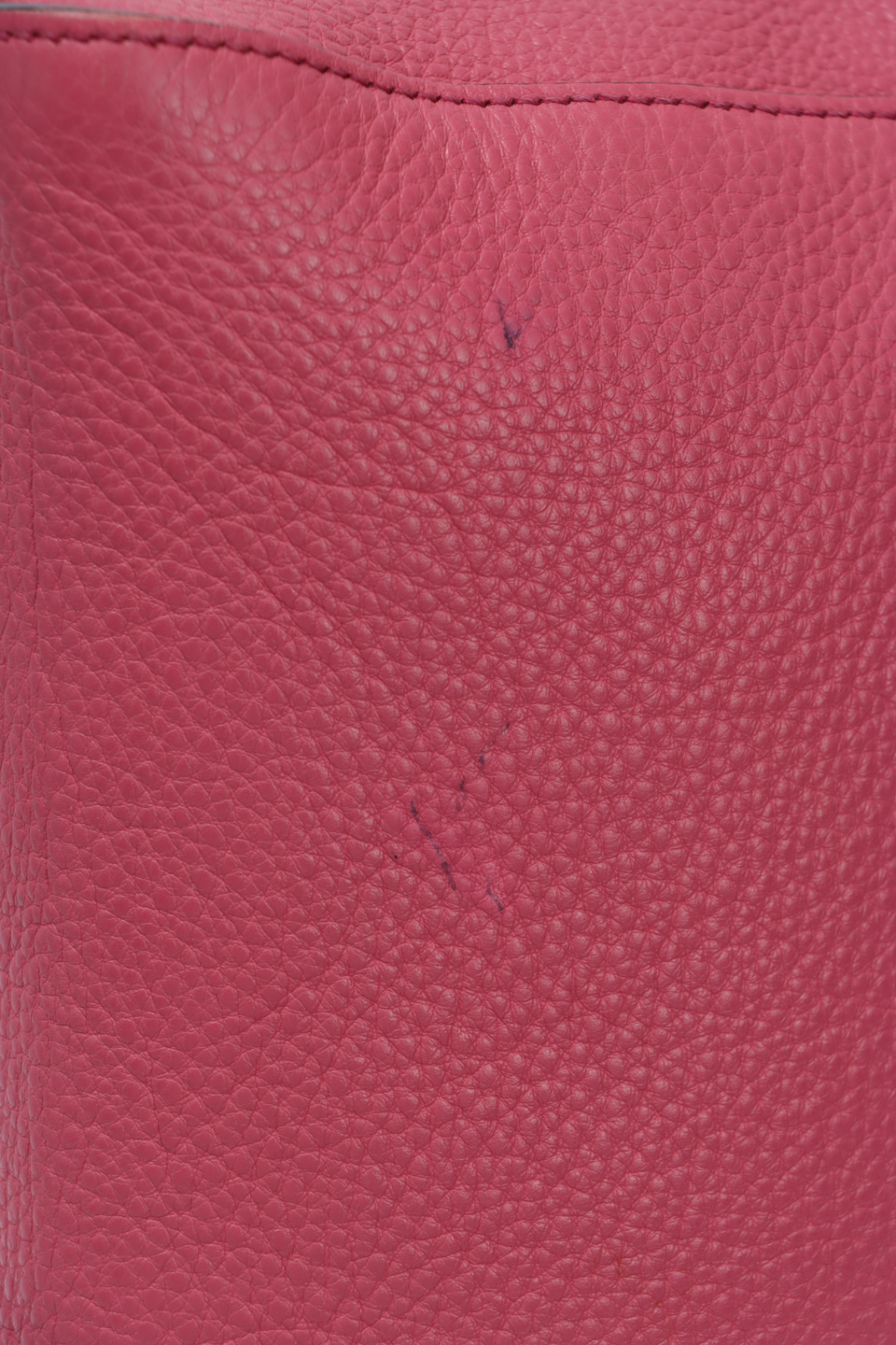 Bom, com aparência de usado. Apresenta leves manchas e marcas de uso pelo couro, especialmente na parte inferior frontal, cantos da base, pequenas marcas de uso, oxidações e descolorações nas ferragens da logomarca frontal e nos puxadores dos cursores internos, leves deformidades pela estrutura, principalmente nas laterais inferiores frontais e alças, pequenas fissuras nas selagens das extremidades superiores laterais e nas alças e leves manchas de uso pelo forro.