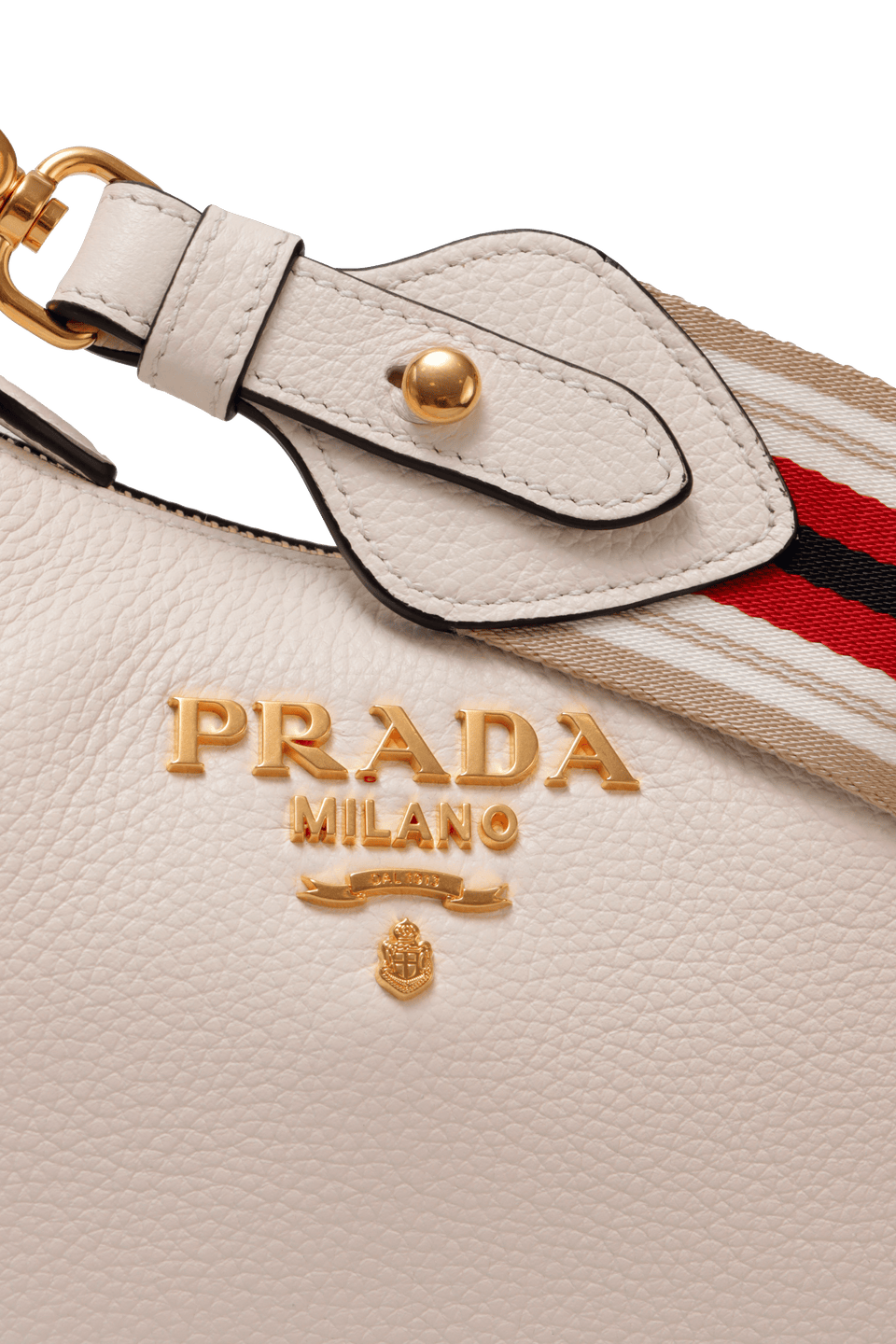 Descrição do Material: Couro calfskin off white e alça de canvas de jacquard nas cores bege, branca, vermelha e azul